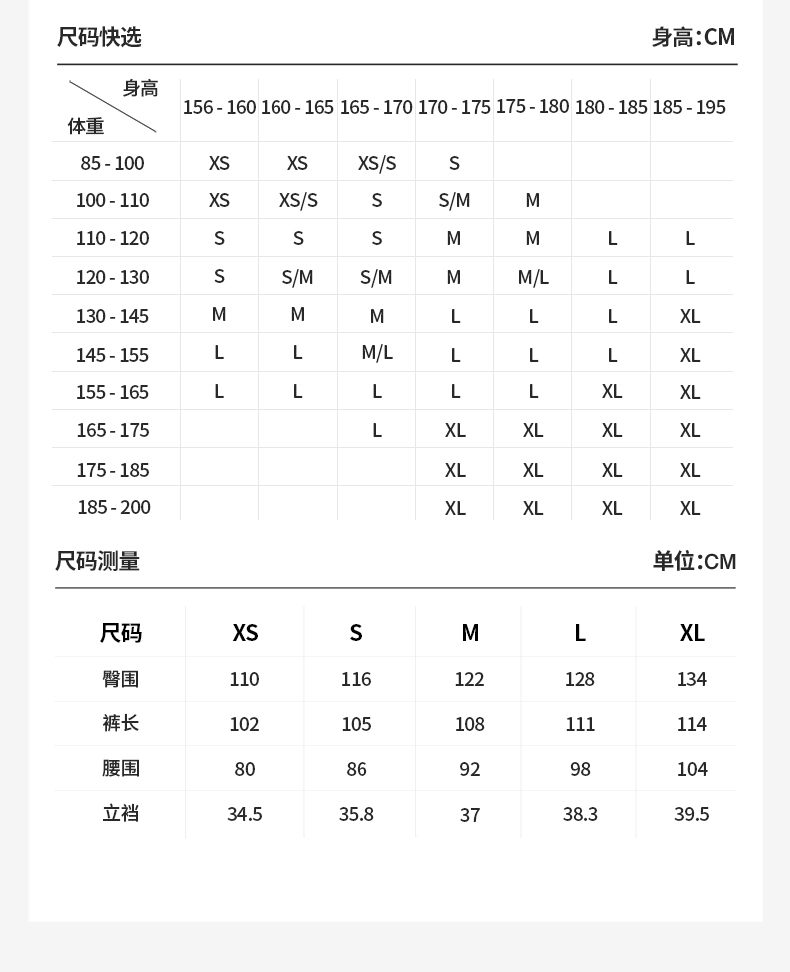China (cm) 160-165/84-86 165-170 / 88-90 167-172 / 92-96 168-173 / 98-102 170-176 / 106-110