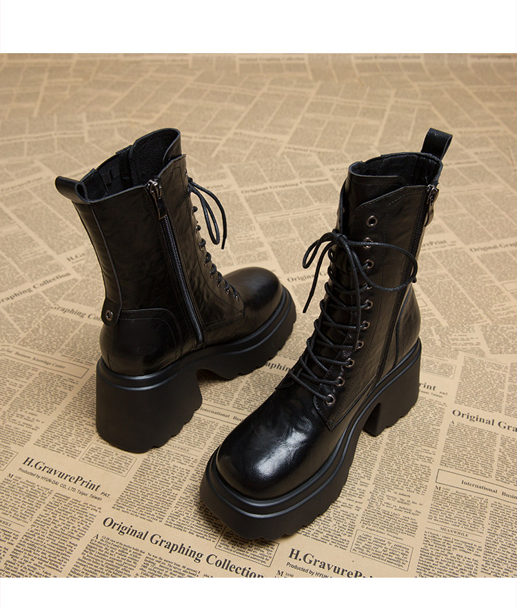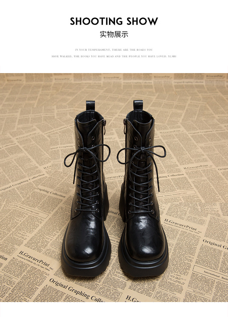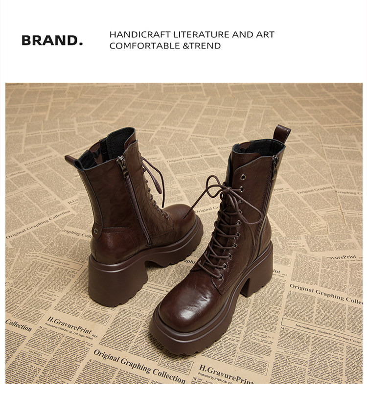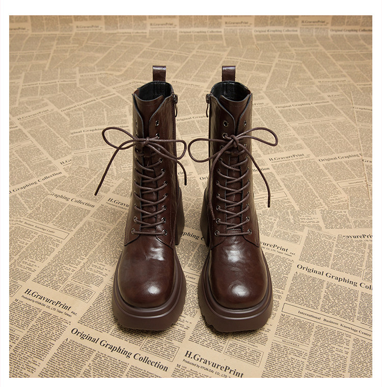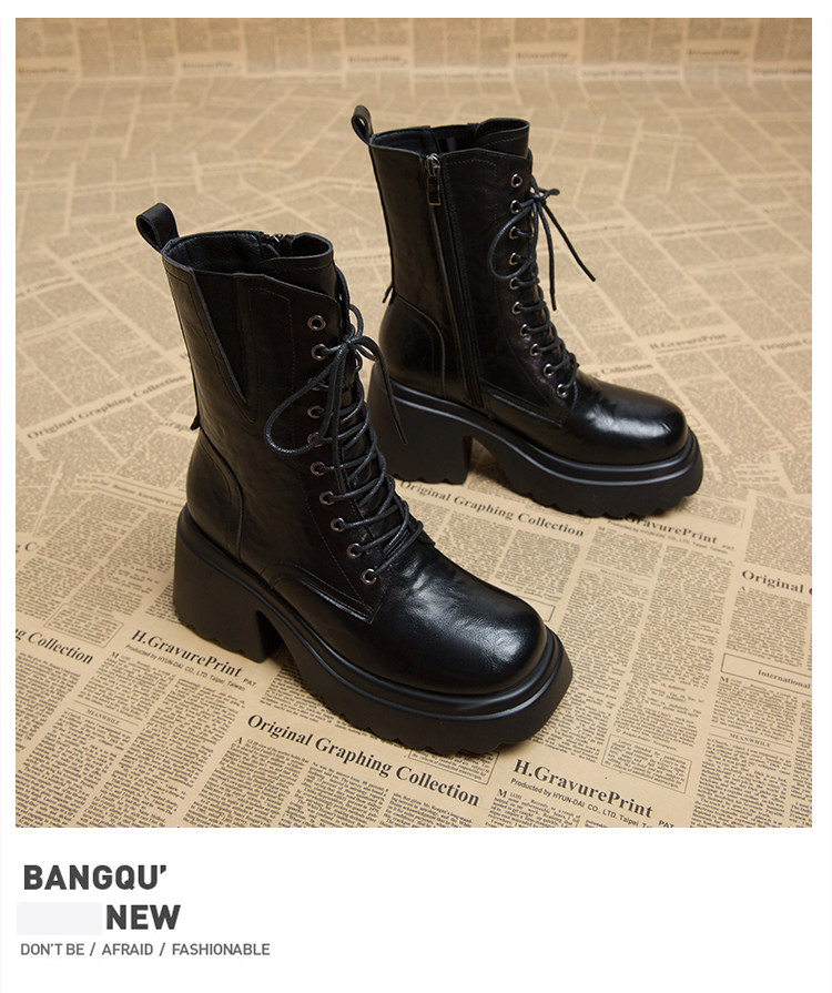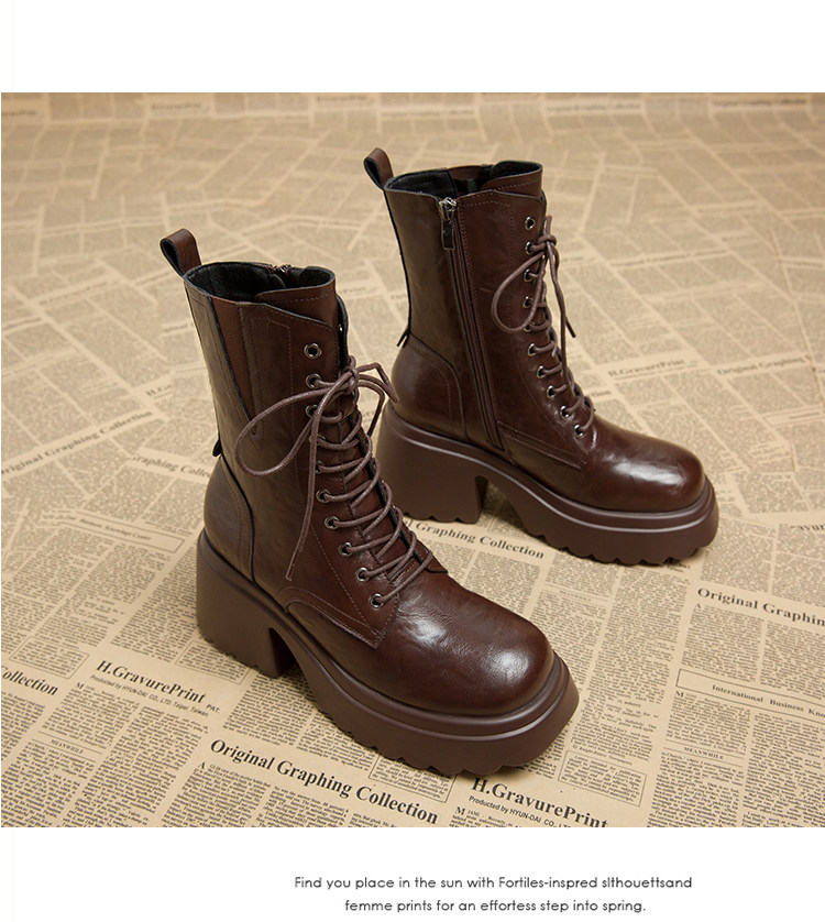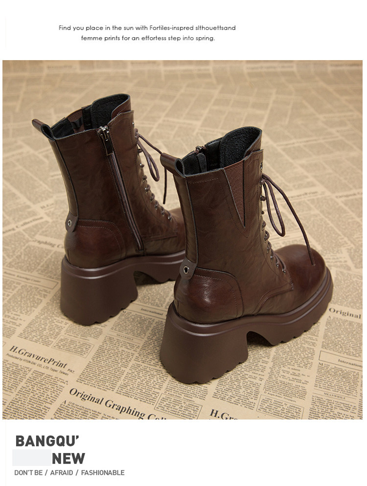 Genuine Leather, Very Stylish High-Heeled Short Boots for Petite Women, 2025 Autumn and Winter New Style, Thick-Soled Lace-Up Height-Increasing Trendy Martin Boots