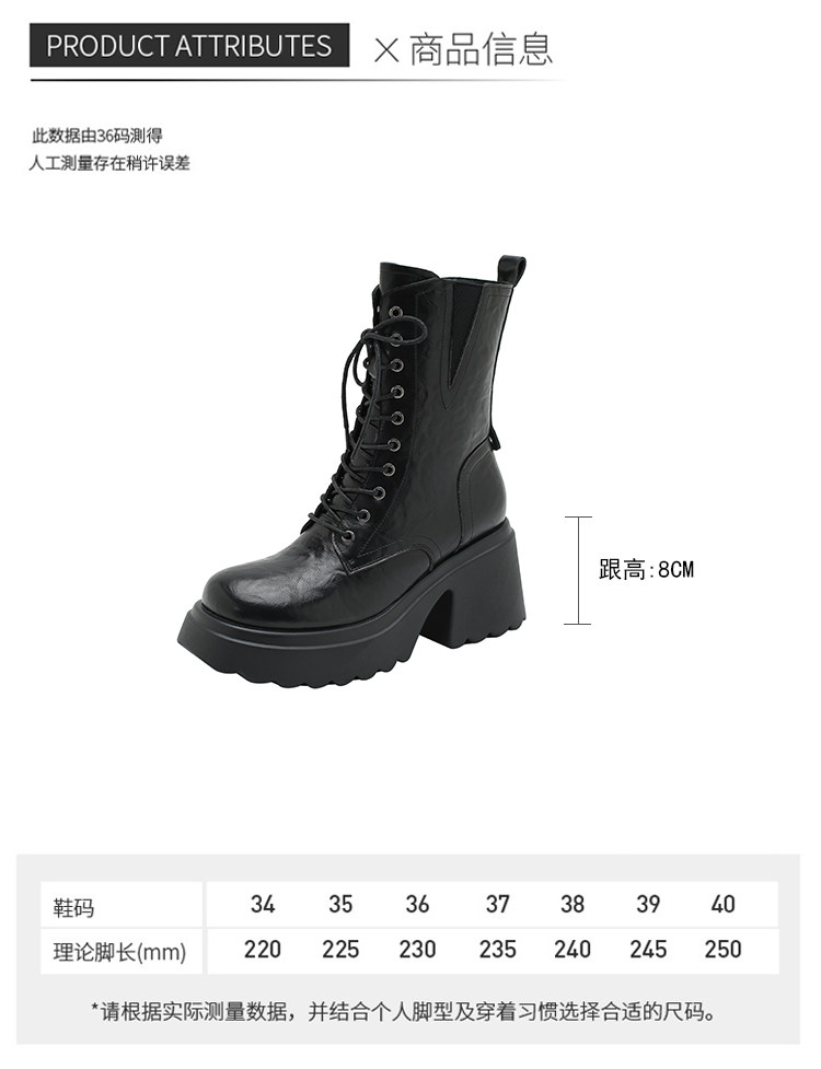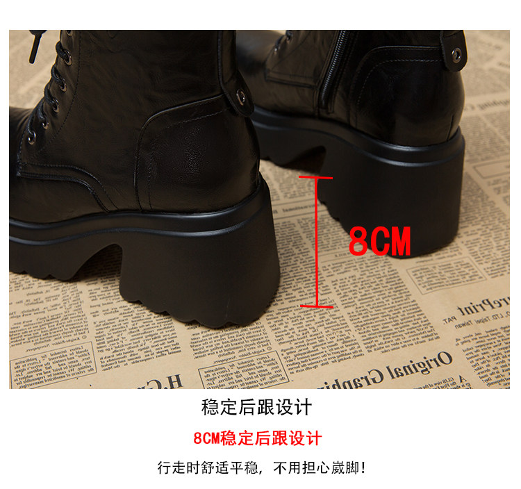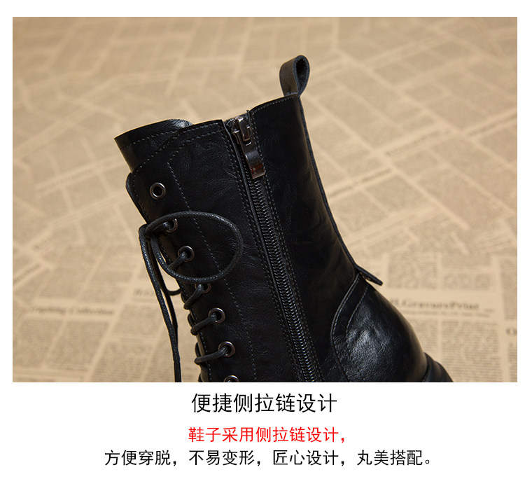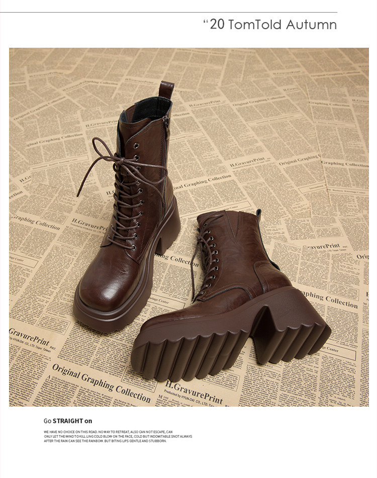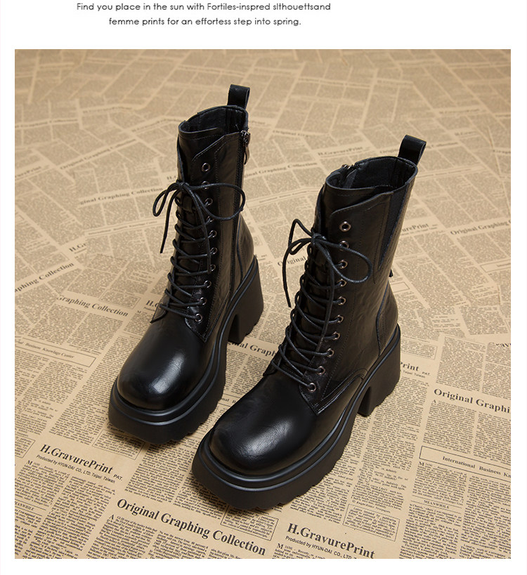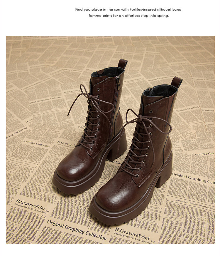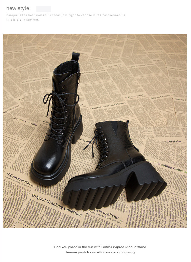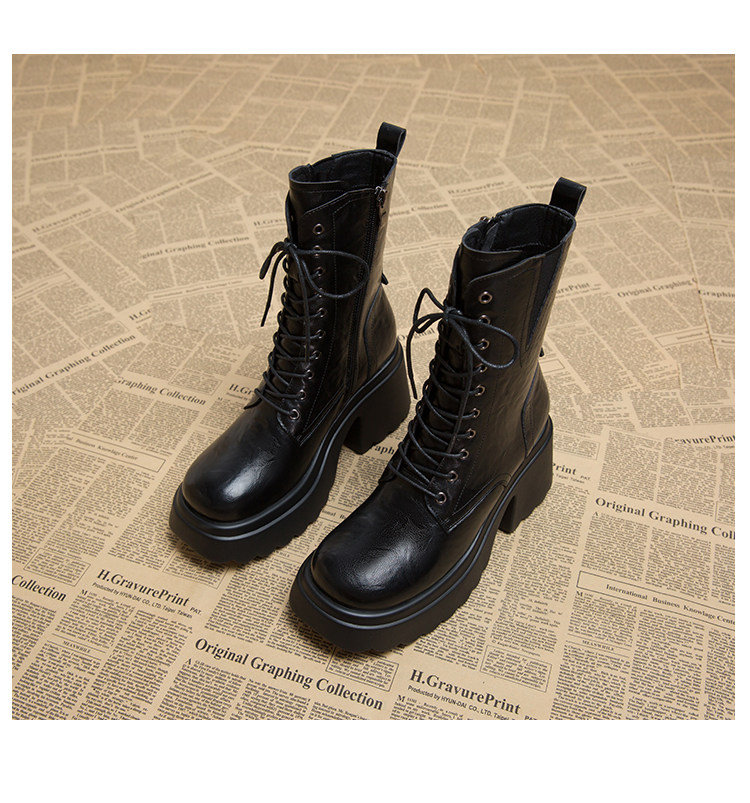 Genuine Leather, Very Stylish High-Heeled Short Boots for Petite Women, 2025 Autumn and Winter New Style, Thick-Soled Lace-Up Height-Increasing Trendy Martin Boots