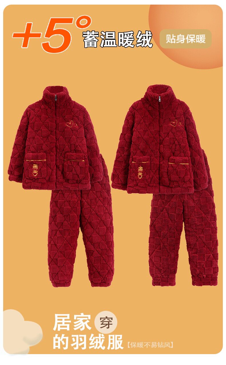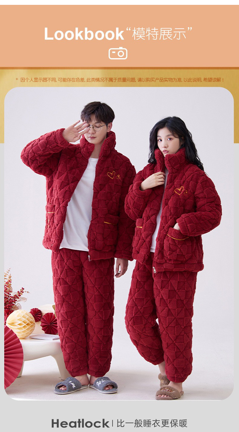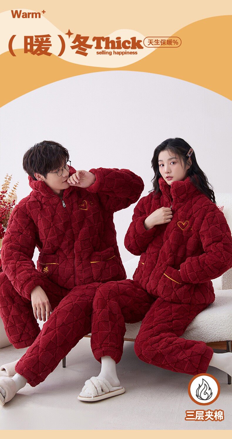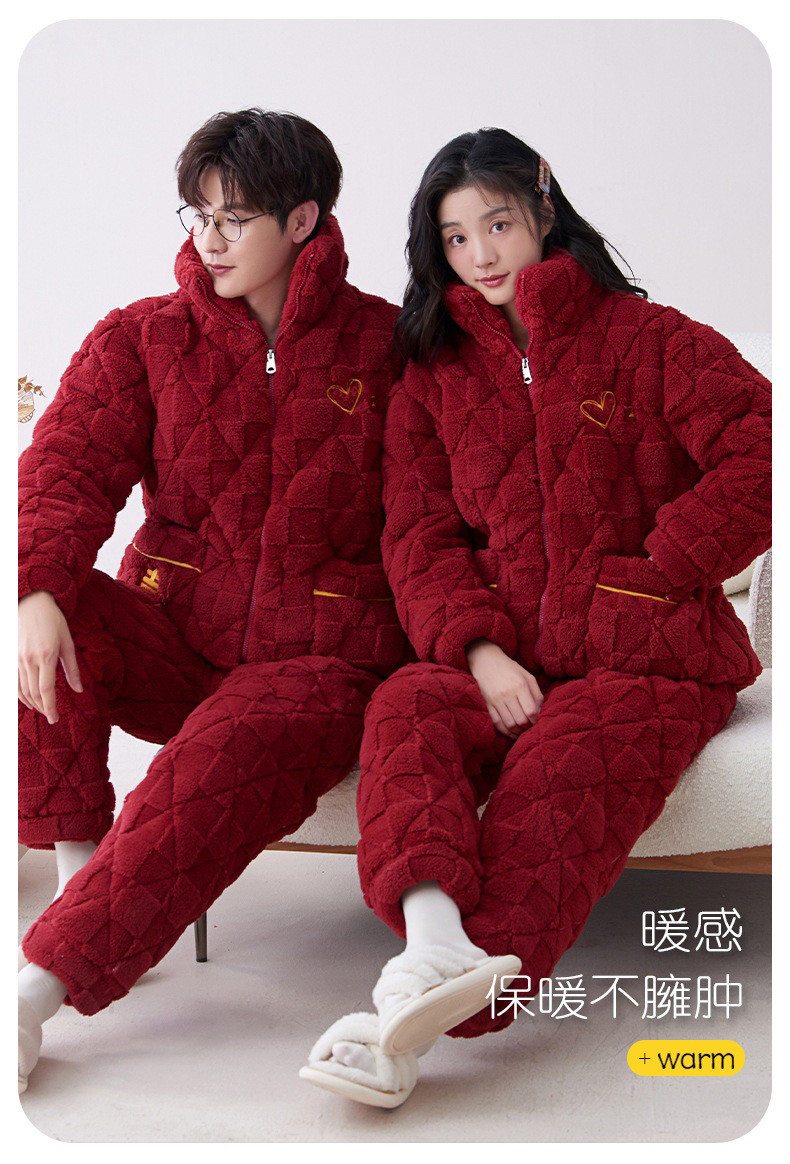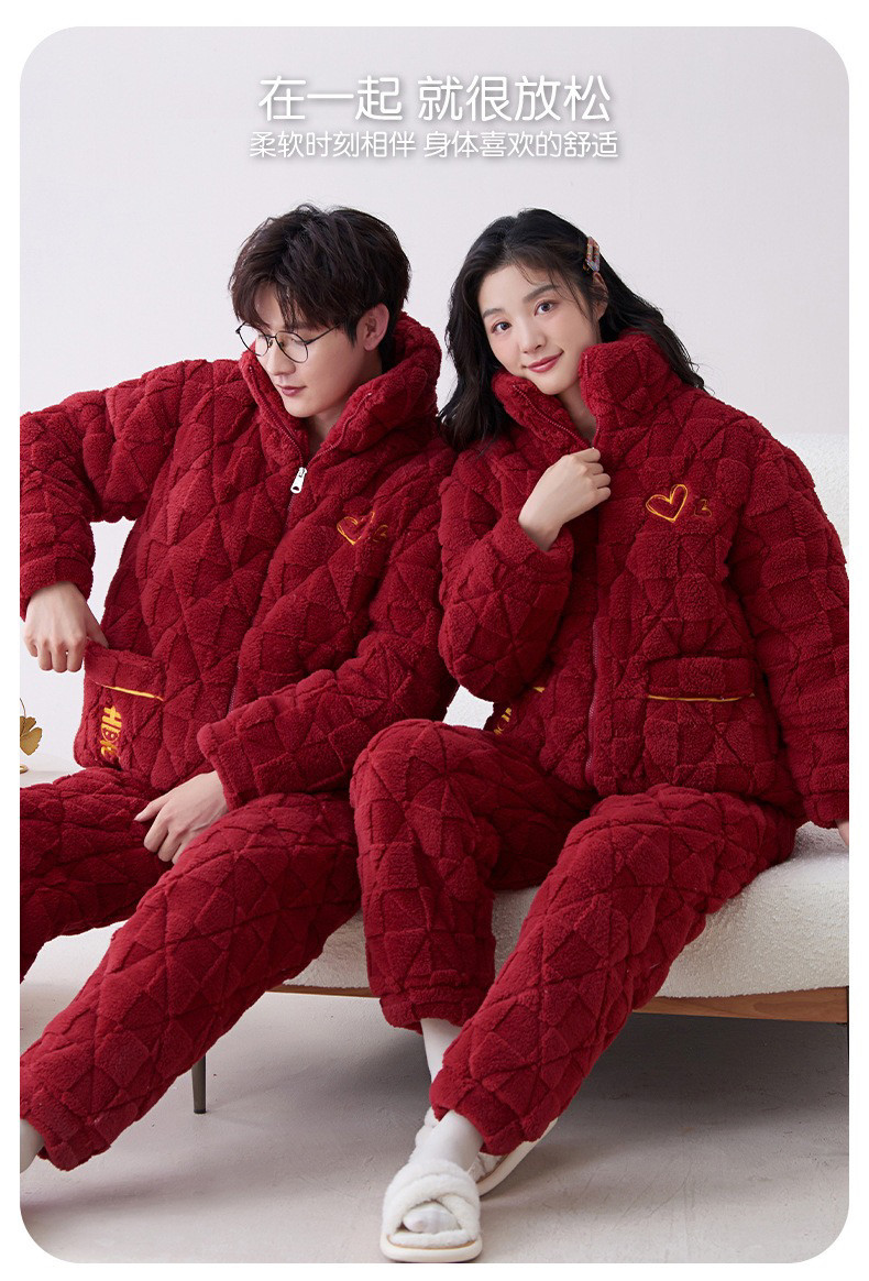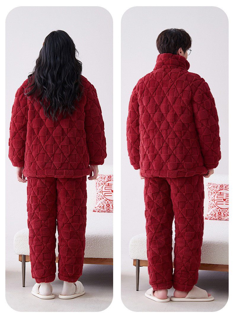 New Winter Three-Layer Quilted Couple's Pajamas for Men and Women, Bright Red Wedding Warm Fleece-Lined Thickened Winter Loungewear