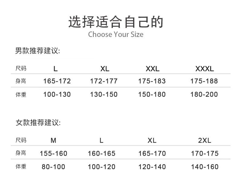 China (cm) 165 / 88-90 170 / 96-98 175 / 108-110 180 / 118-122 185 / 126-130