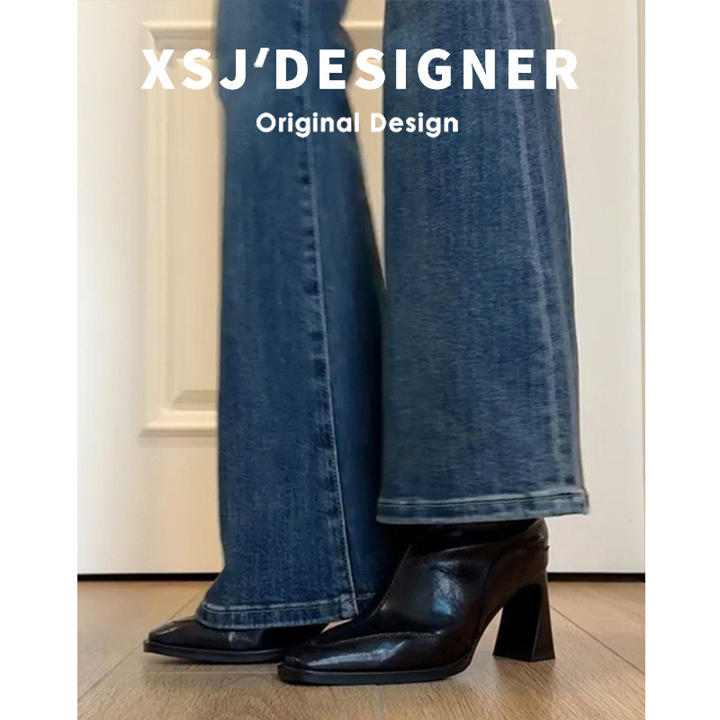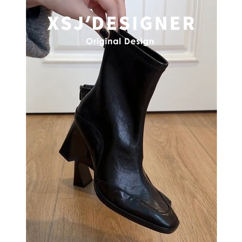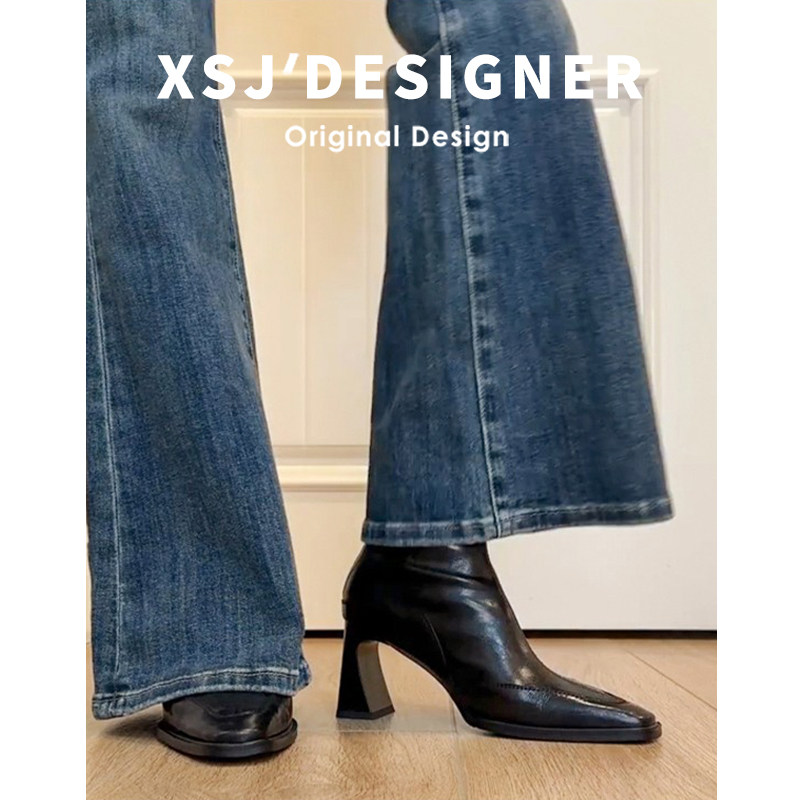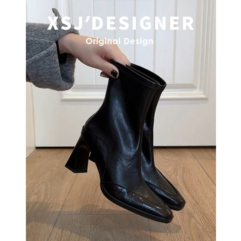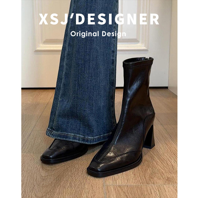 Cowhide French-Style Square-Toe Chunky Heel Short Boots for Women, 2025 Autumn and Winter Ankle Boots, Elegant High-Heeled Slim Boots, Retro Single Boots