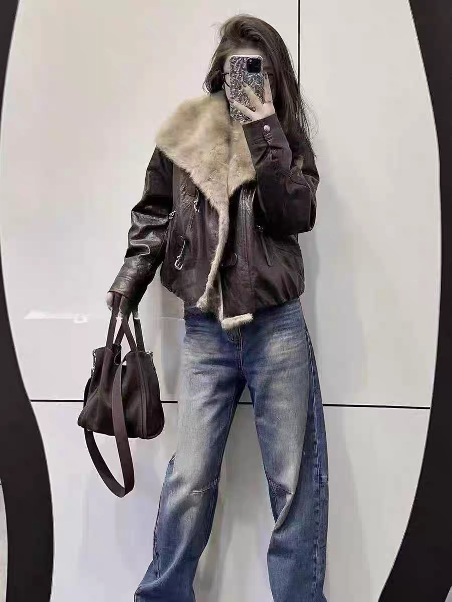Genuine leather goose down women's 2025 winter new fur collar short warm oil wax sheepskin down leather jacket jacket