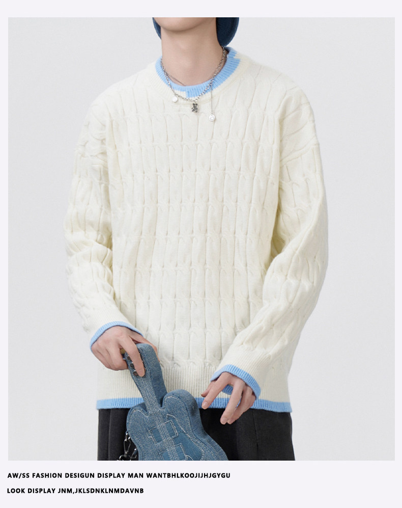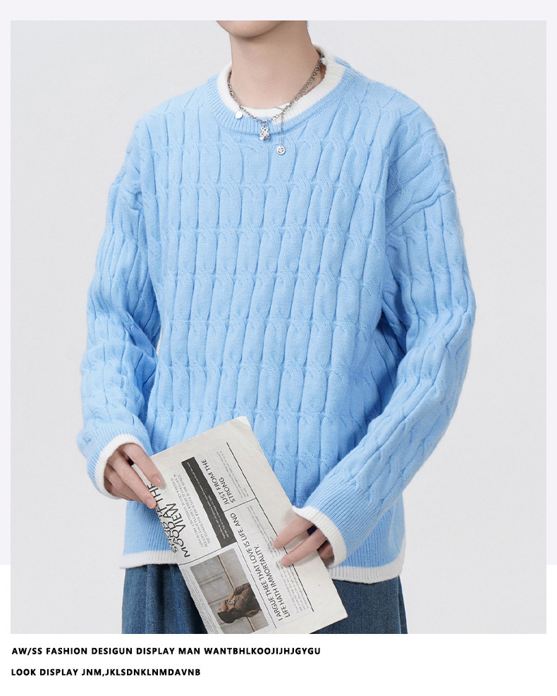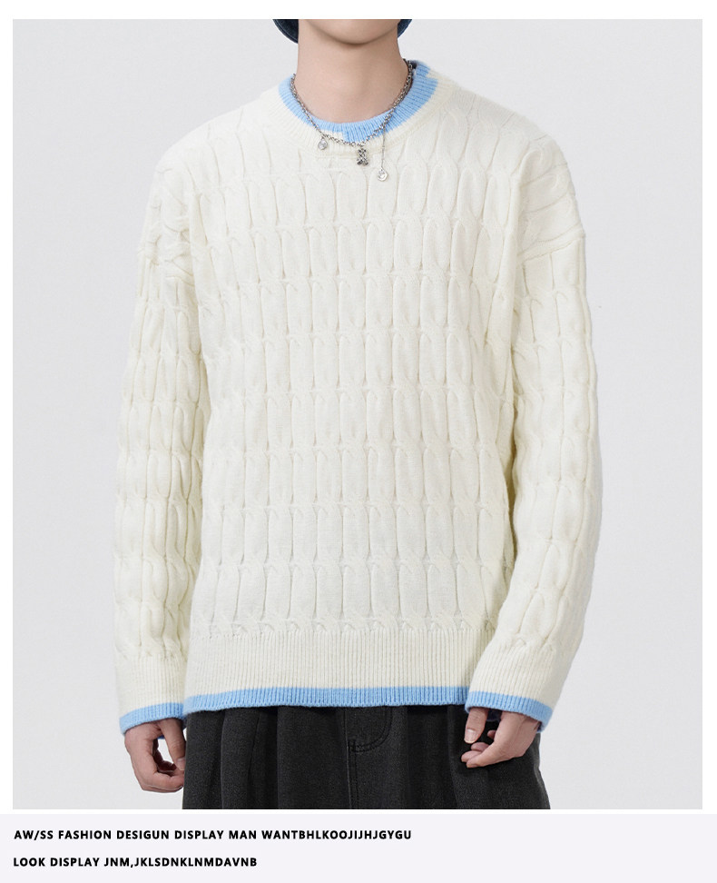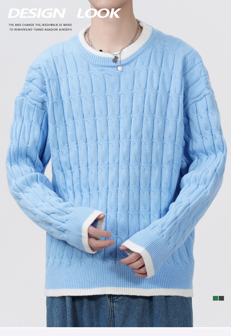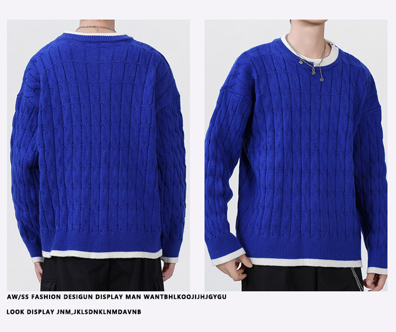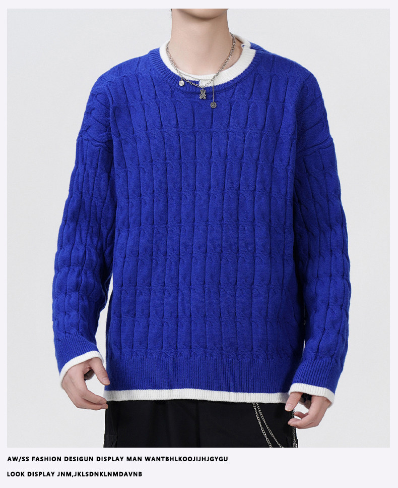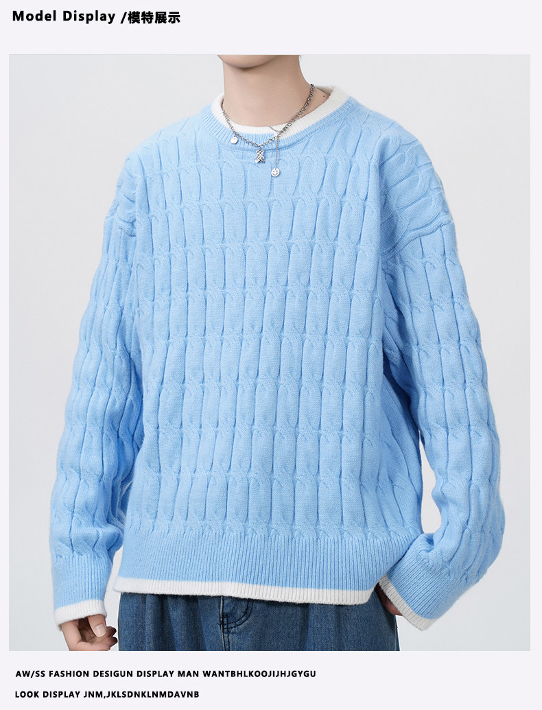 Cable pattern round neck sweater men's autumn and winter 2025 new high-end loose contrast color plus velvet pullover sweater