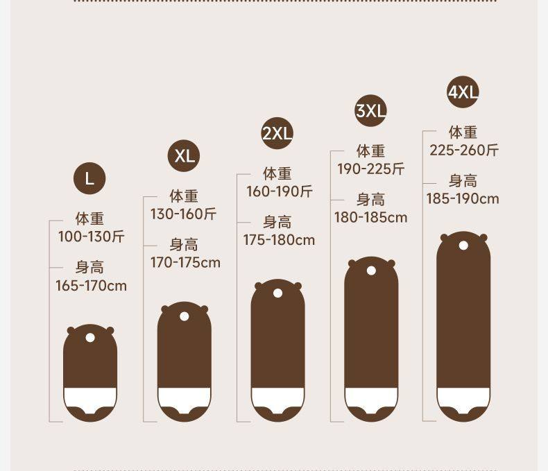 Size L (Suggested Weight 100- 65kg),XL (Suggested Weight 130- 80kg),2XL (Suggested Weight 160- 95kg),3XL (Suggested Weight 190- 112.5kg),4XL (Suggested Weight 225- 130kg)