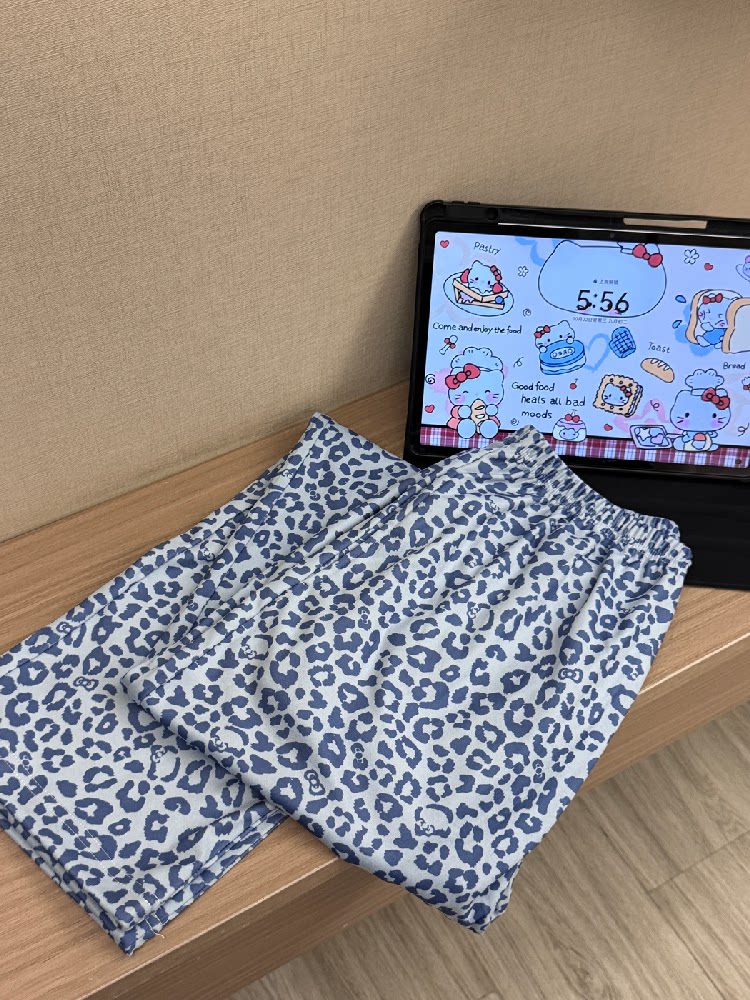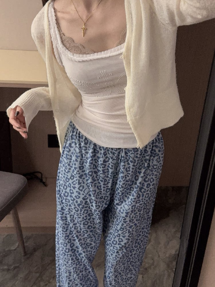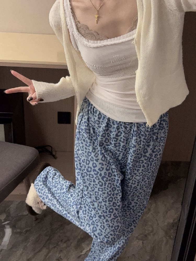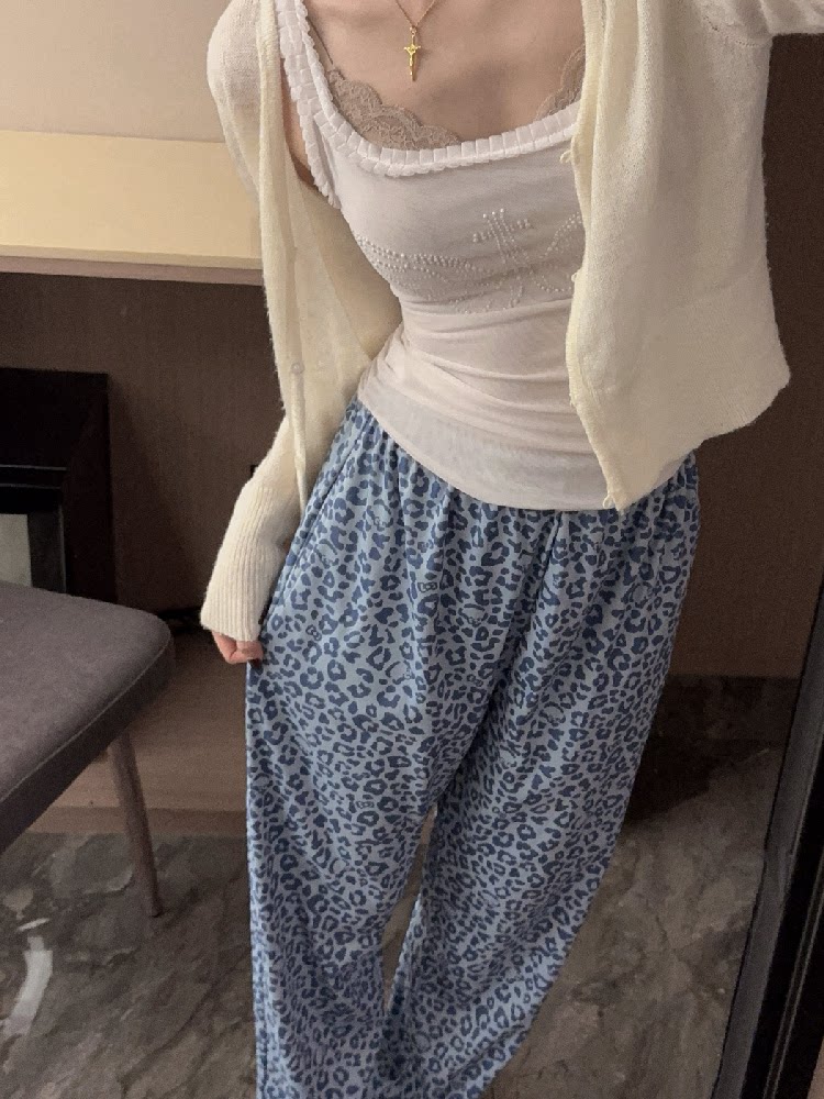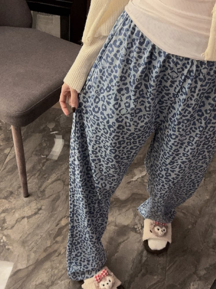 Blue Leopard Print Women's Thick Warm Pajama Pants, Autumn and Winter German Velvet Brushed Casual Loose Home Pants with Pockets