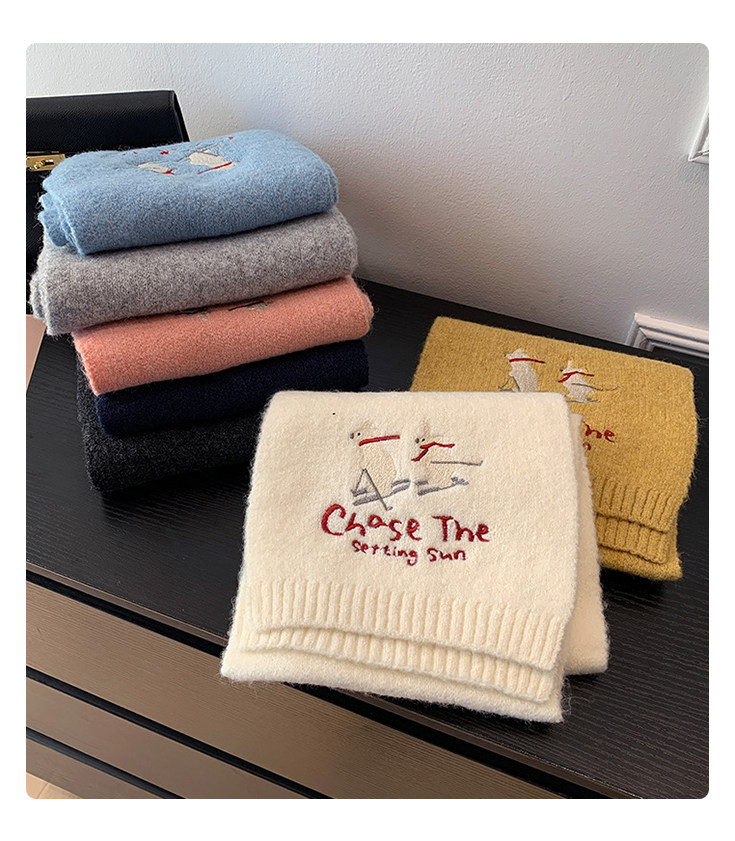 Bear embroidered scarf for women in winter with wool, high-end white scarf, Korean style, versatile, thickened and warm, couple's scarf