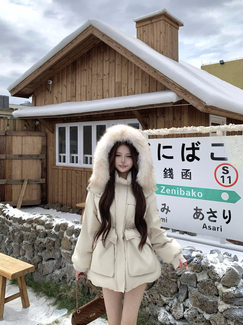 Off-white fur collar hooded down jacket women's winter new thickened warm design mid-length zipper jacket
