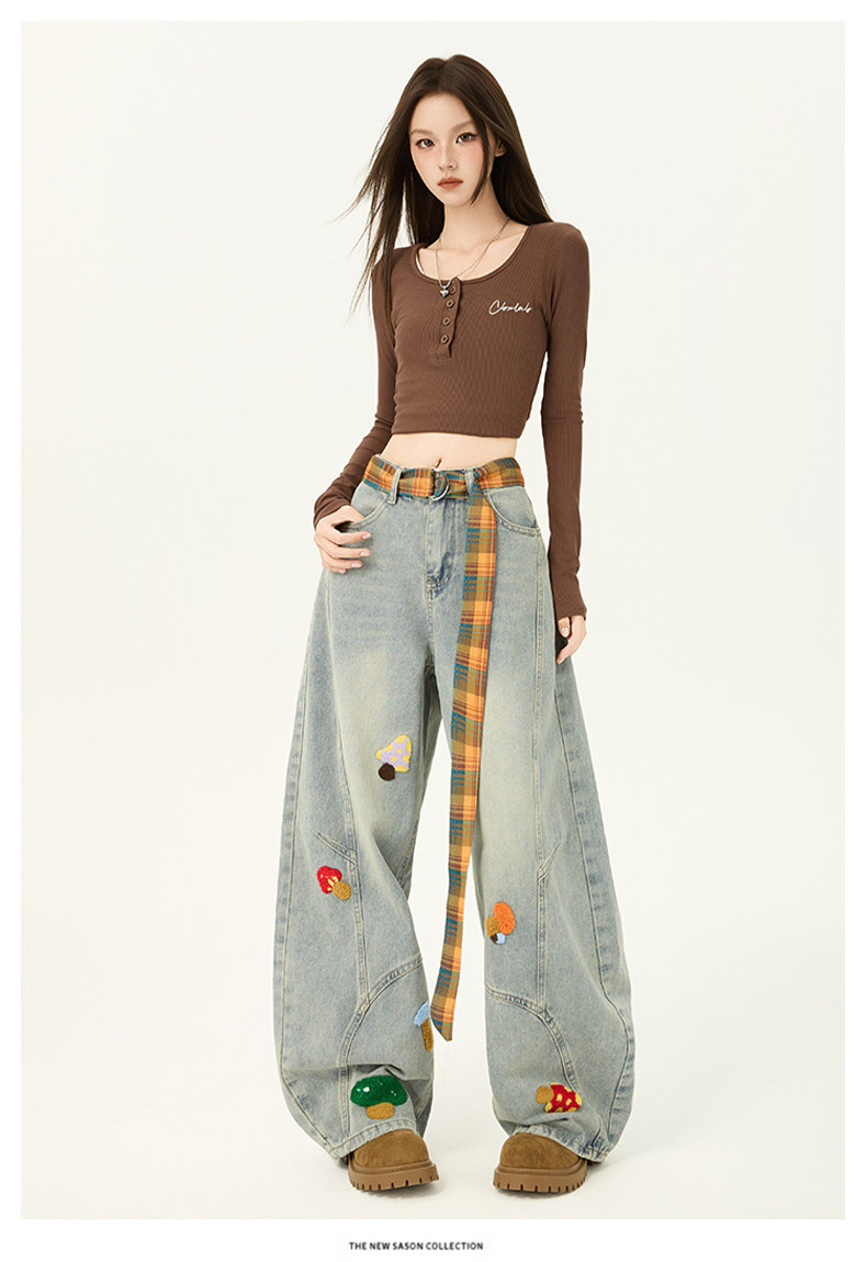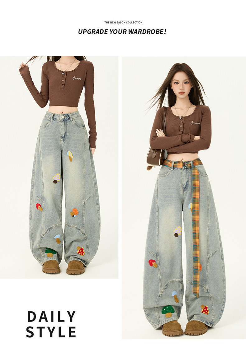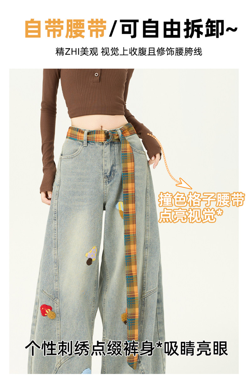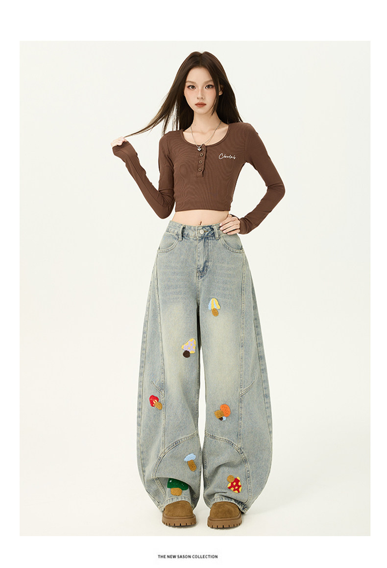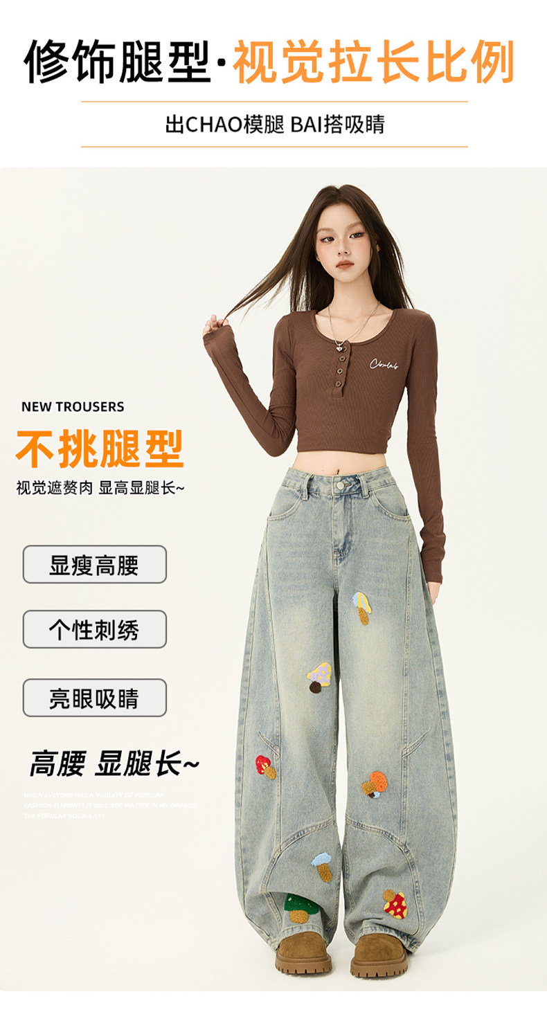 American Retro Embroidered Jeans for Women, Loose Wide-Leg Scimitar Pants with a Sense of Design