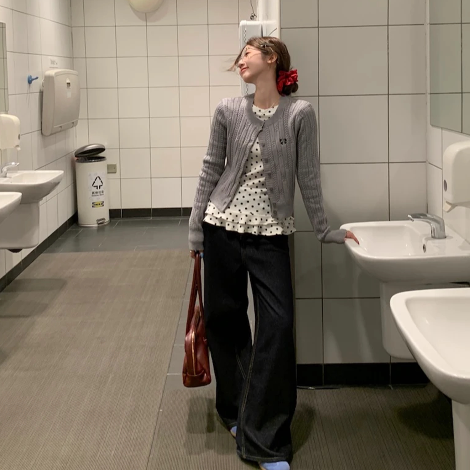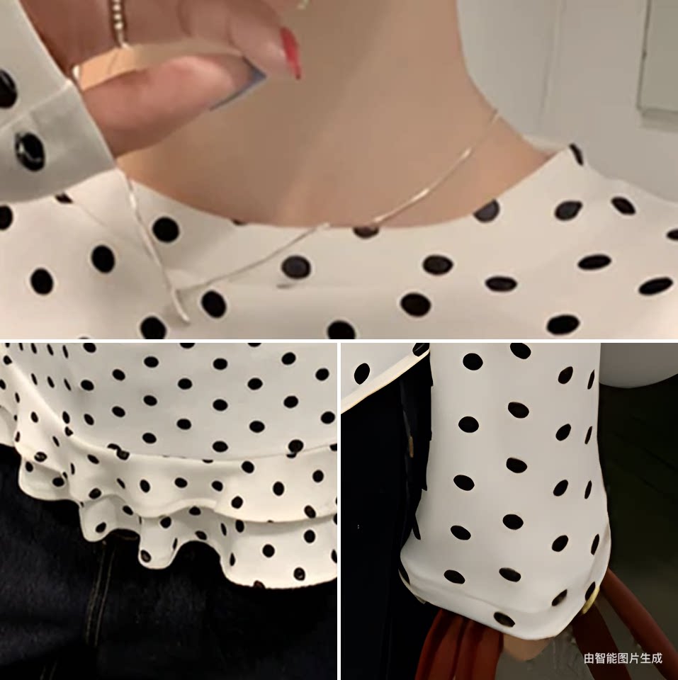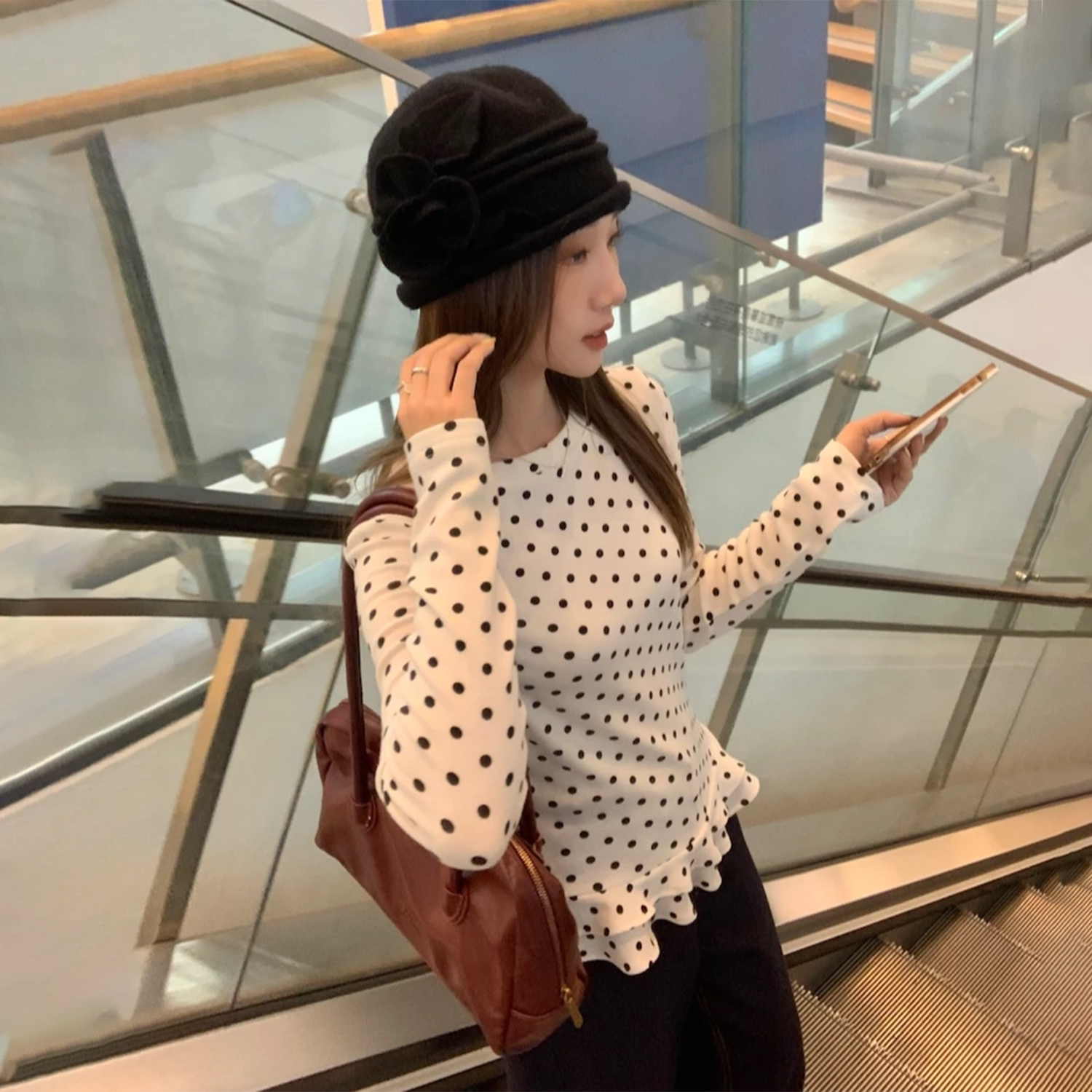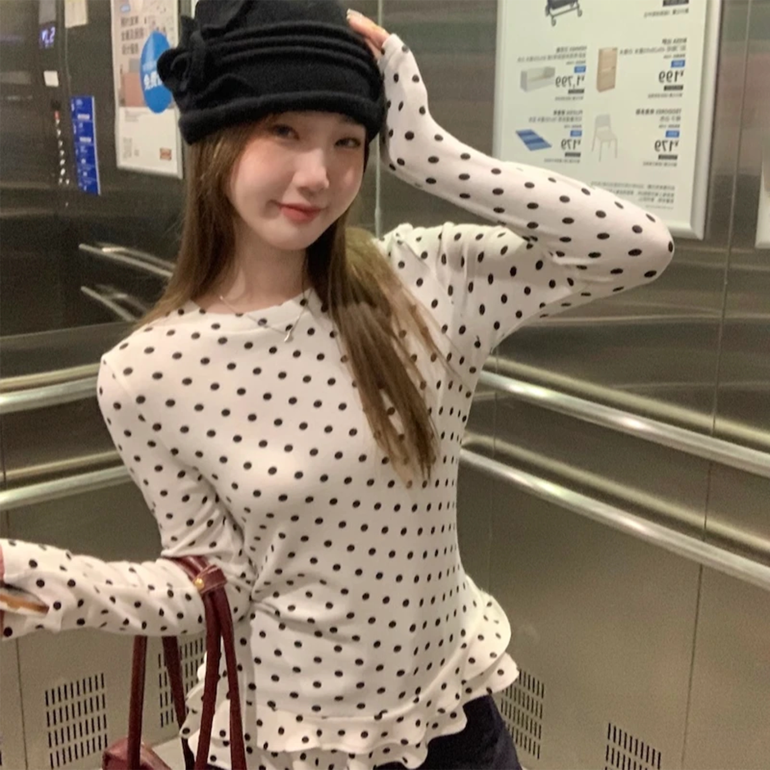Sweet Style White Polka Dot Long-Sleeved T-Shirt for Women, Autumn and Winter 2025 New Style Ruffled Bottoming Shirt, Slimming Inner Top