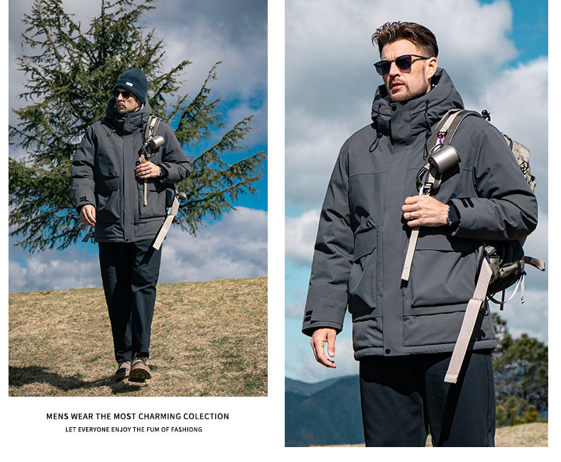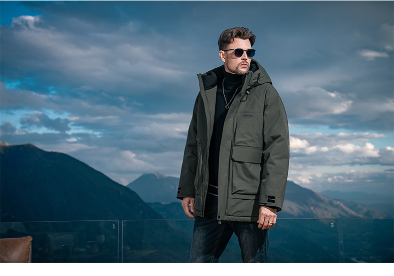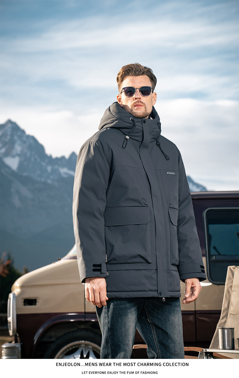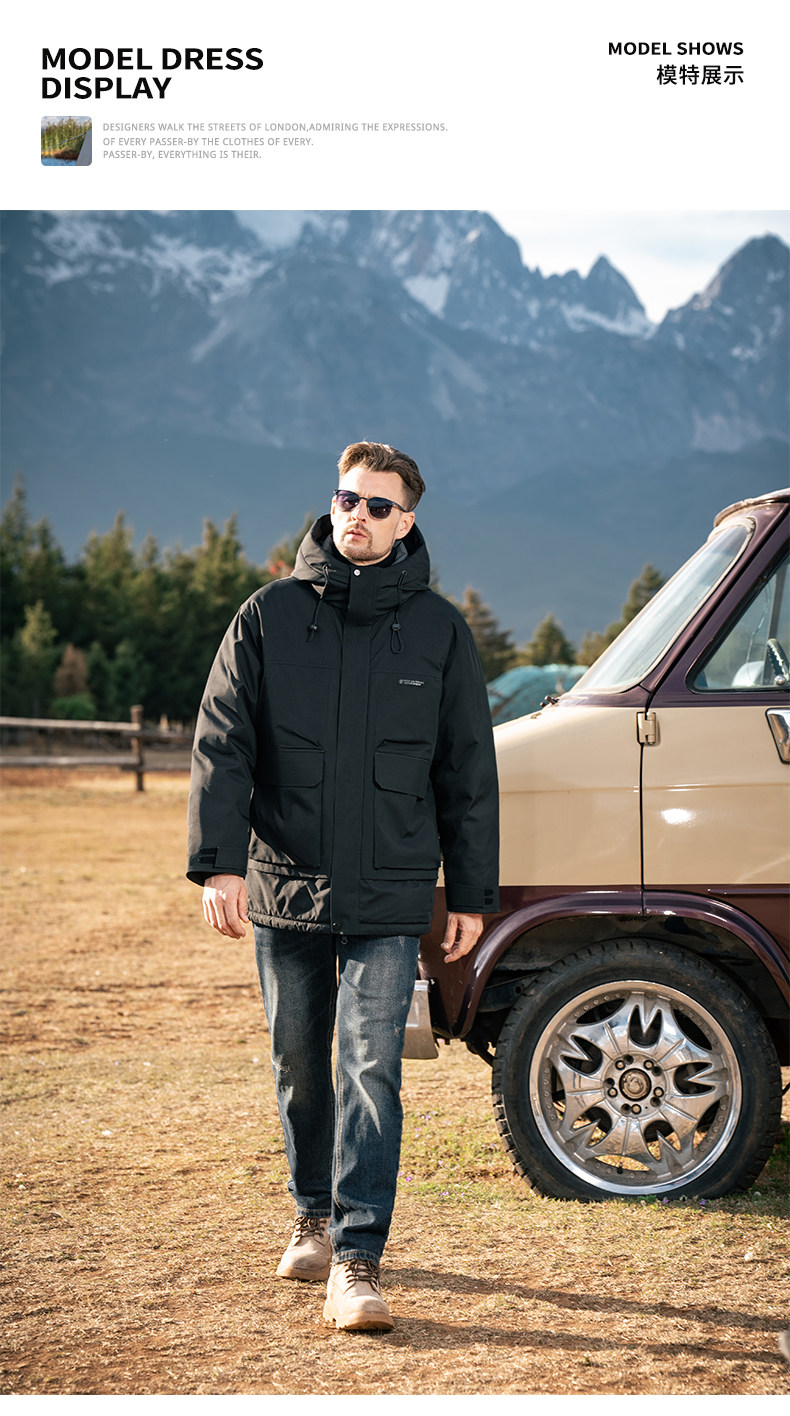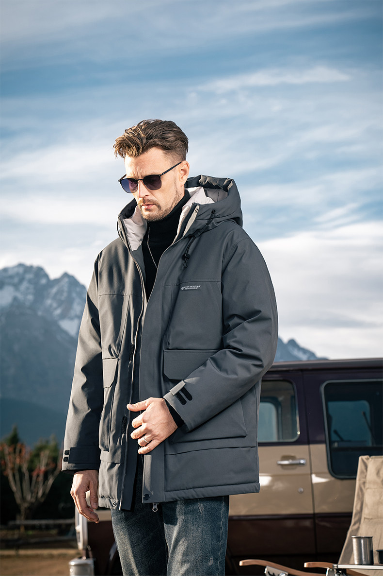 Yingjuerun gold ion heat storage and temperature locking mid-length hooded men's down jacket outdoor functional white duck down work jacket