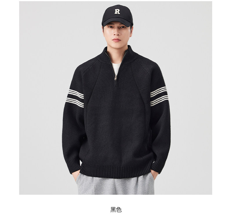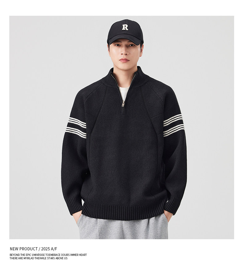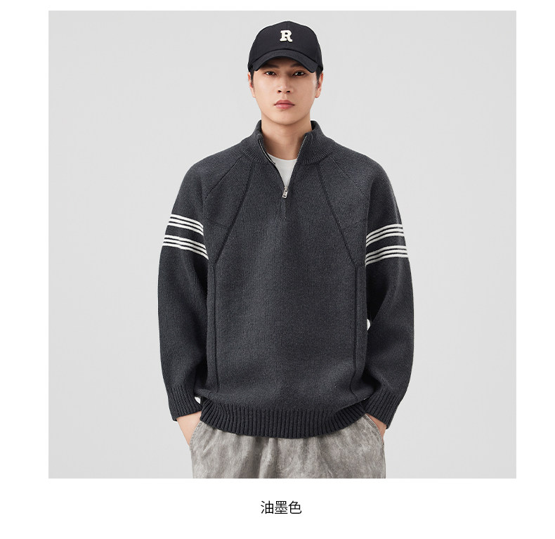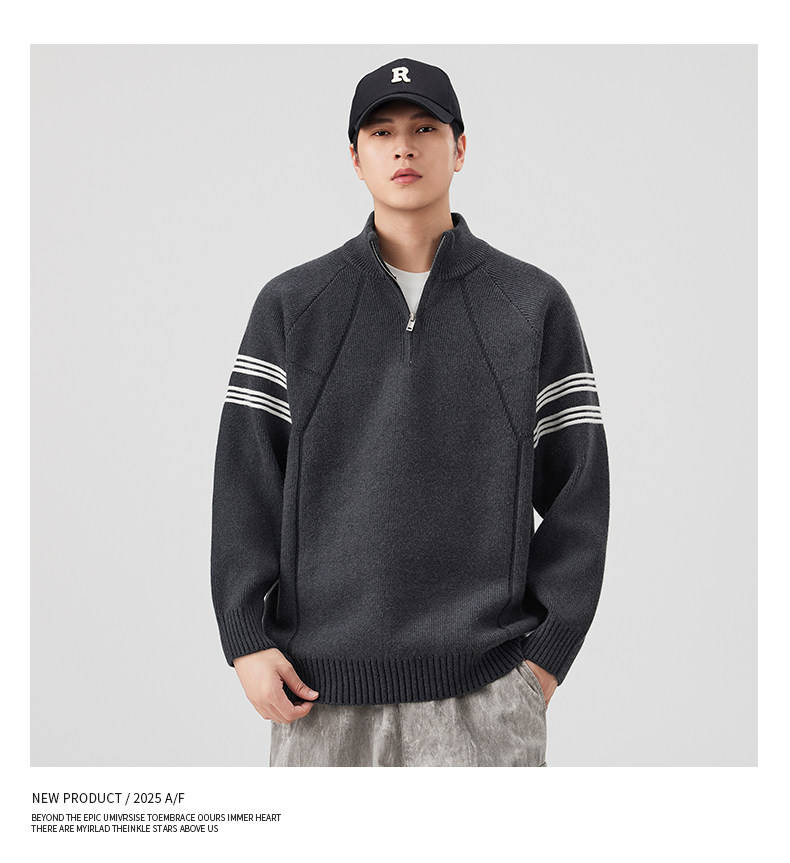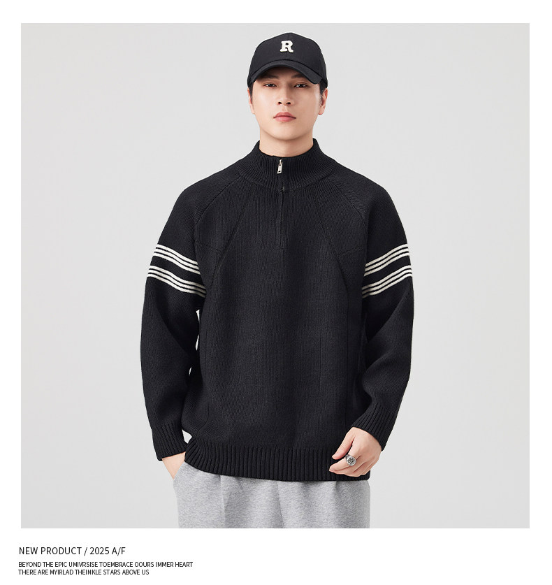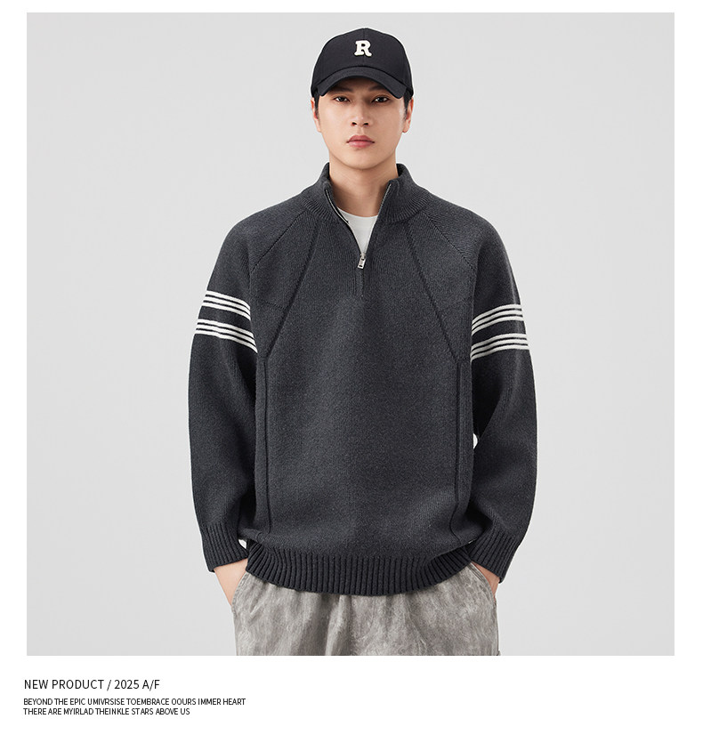 Chun Tuan 830G Heavyweight Half-Zip Sweater Men's Autumn and Winter Thickened Warm Contrast Color Striped Lazy Style Knitted Sweater Jacket