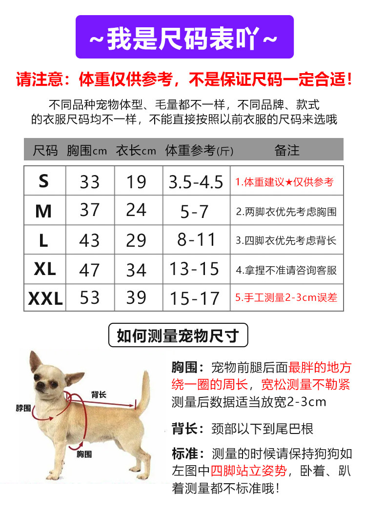 Size S Chest 33 Back 19 About 3.5-4.5 Jin Jin is equal to 0.5 kg,M Chest 37 Back 24 About 5-7 Jin Jin is equal to 0.5 kg,L Chest 43 Back 29 About 8-11 Jin Jin is equal to 0.5 kg,XL Chest 47 Back 34 About 13-15 Jin Jin is equal to 0.5 kg,XXL Chest 53 Back 39 About 15-17 Jin Jin is equal to 0.5 kg