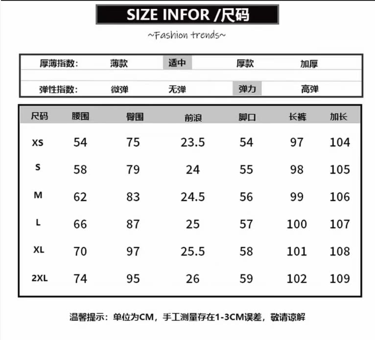 Outseam (cm) 99 cm 101.5 cm 104 cm 106.5 cm 109 cm
