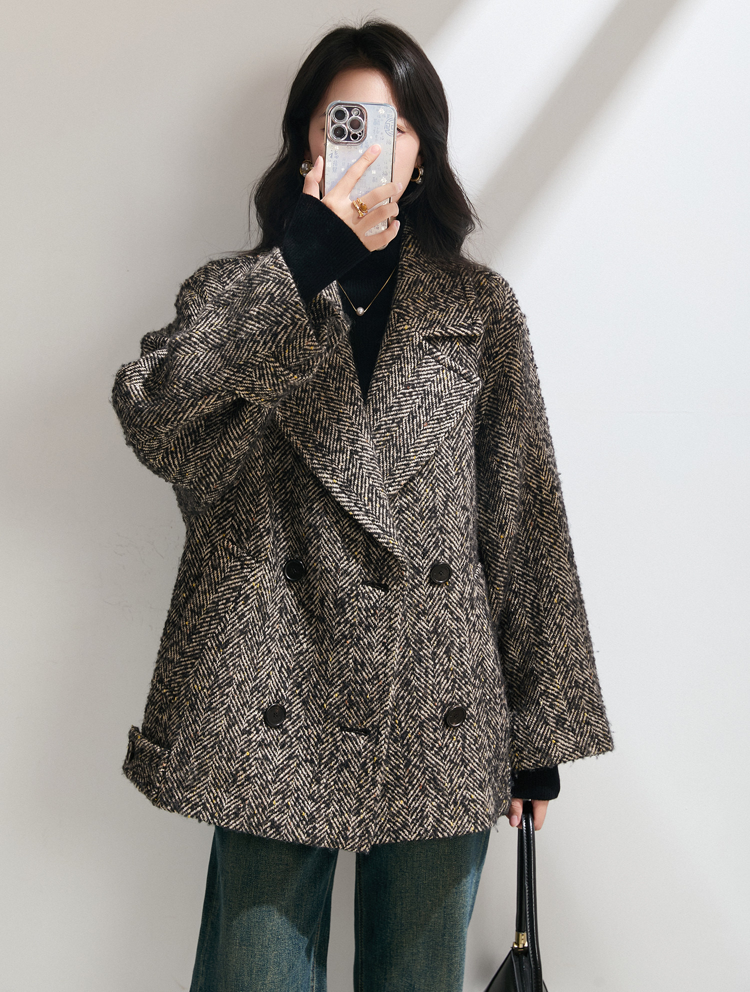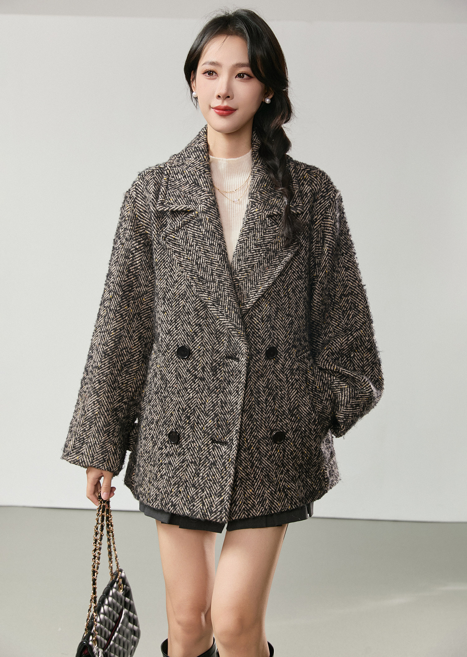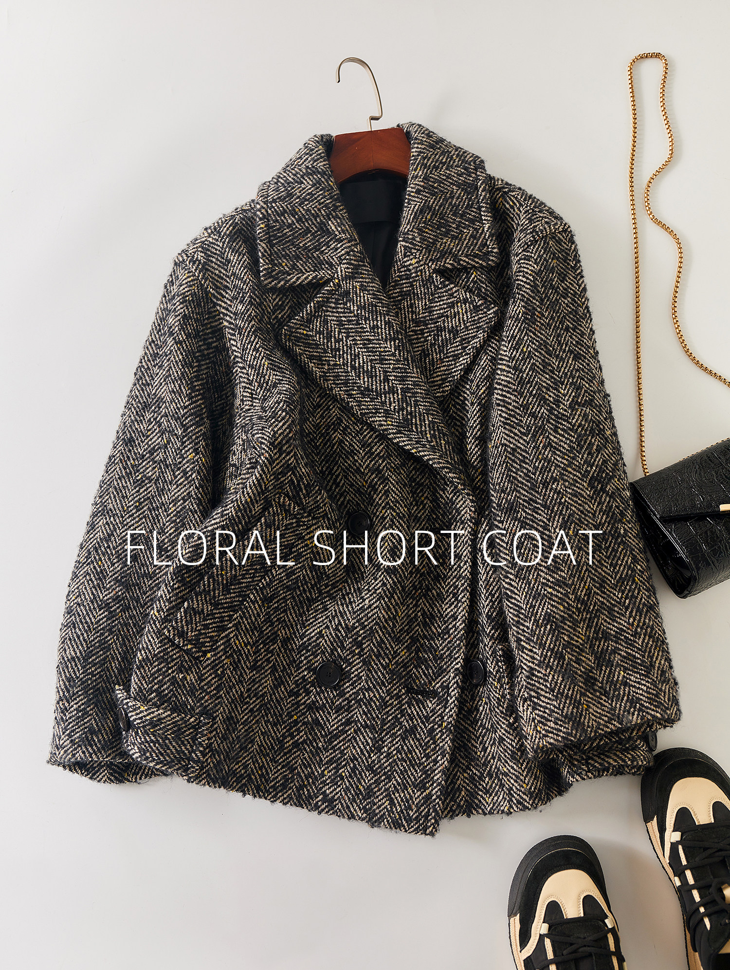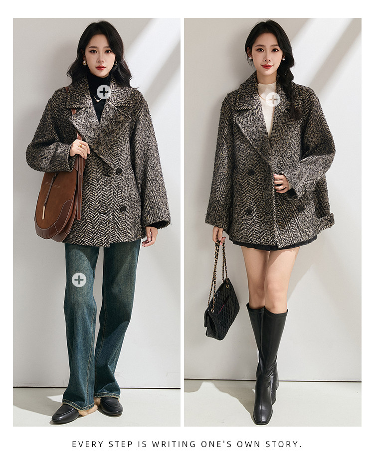 Simple and comic rational style sheep wool herringbone retro tweed short coat loose silhouette coat for women winter