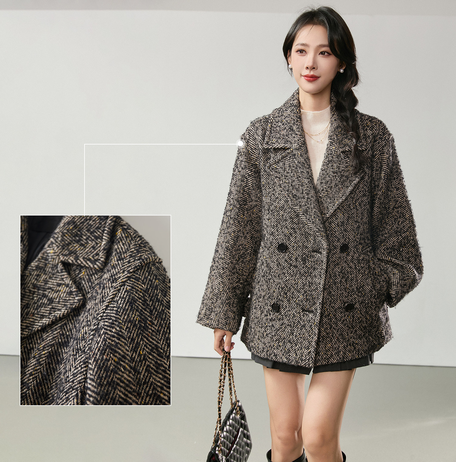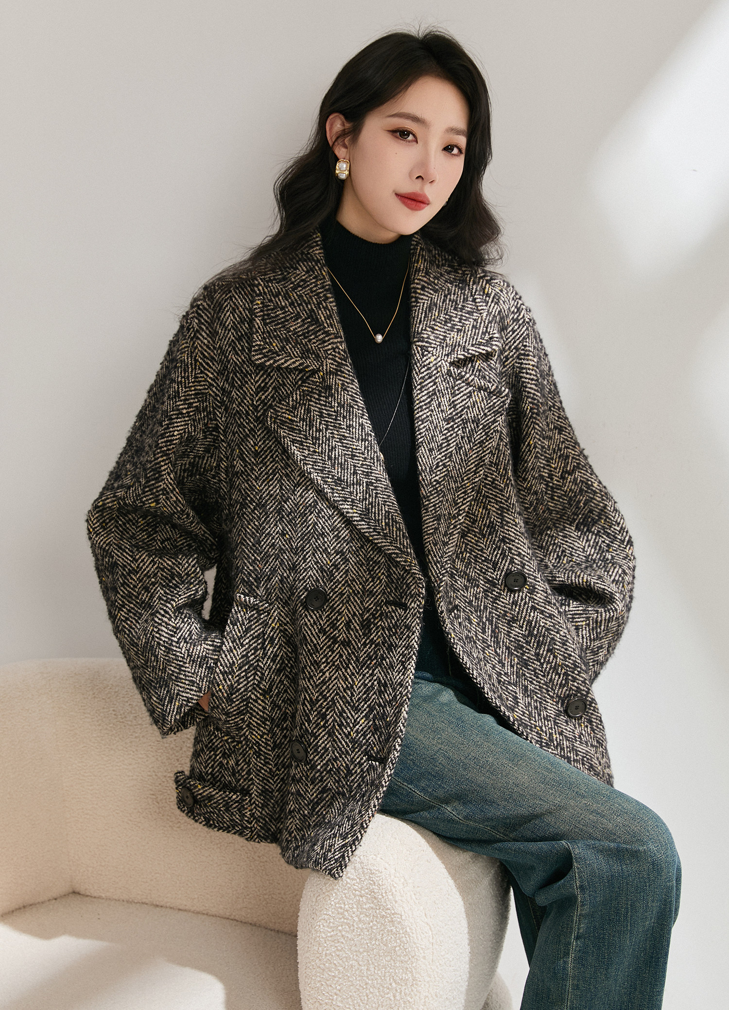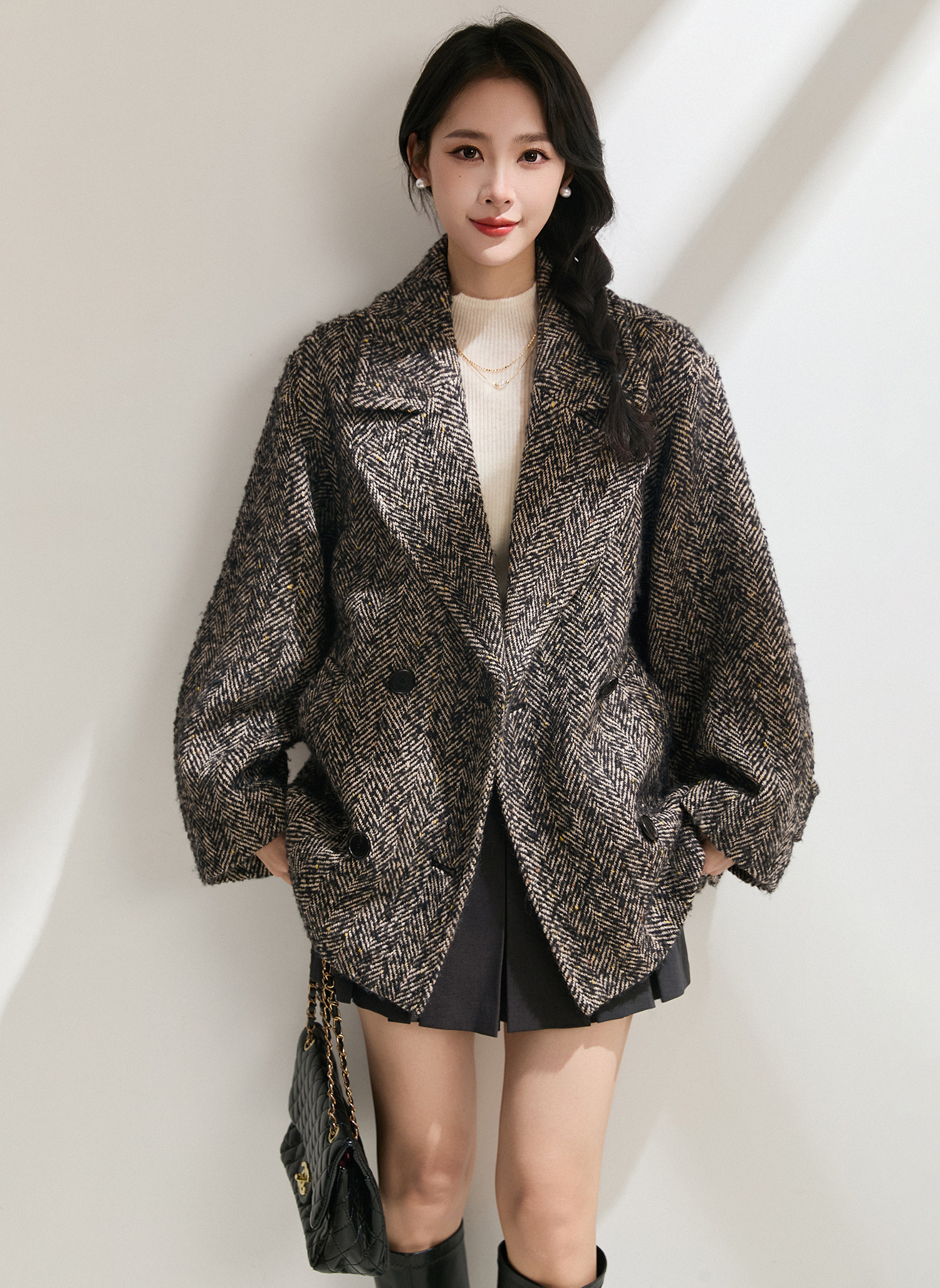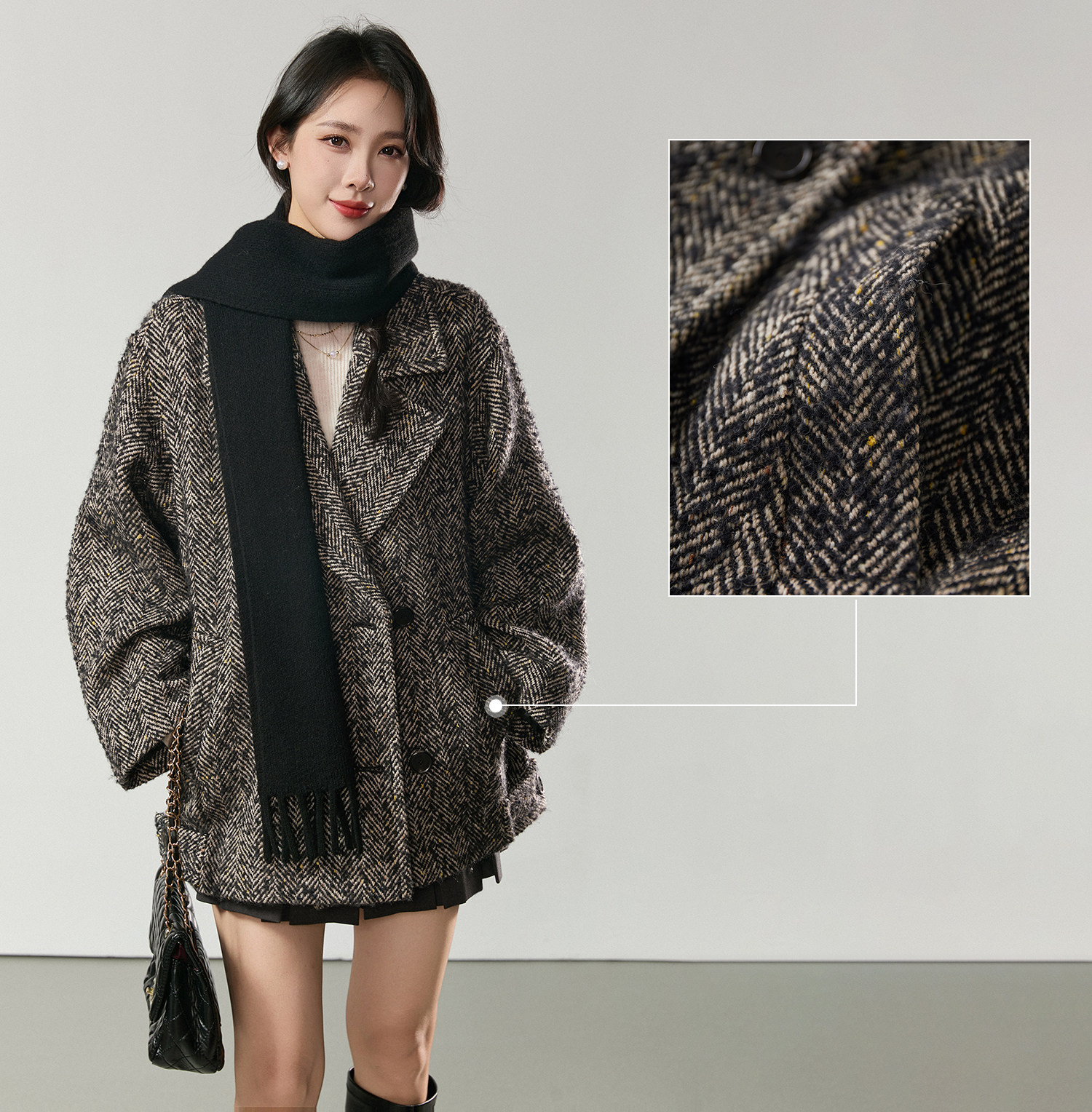 Simple and comic rational style sheep wool herringbone retro tweed short coat loose silhouette coat for women winter