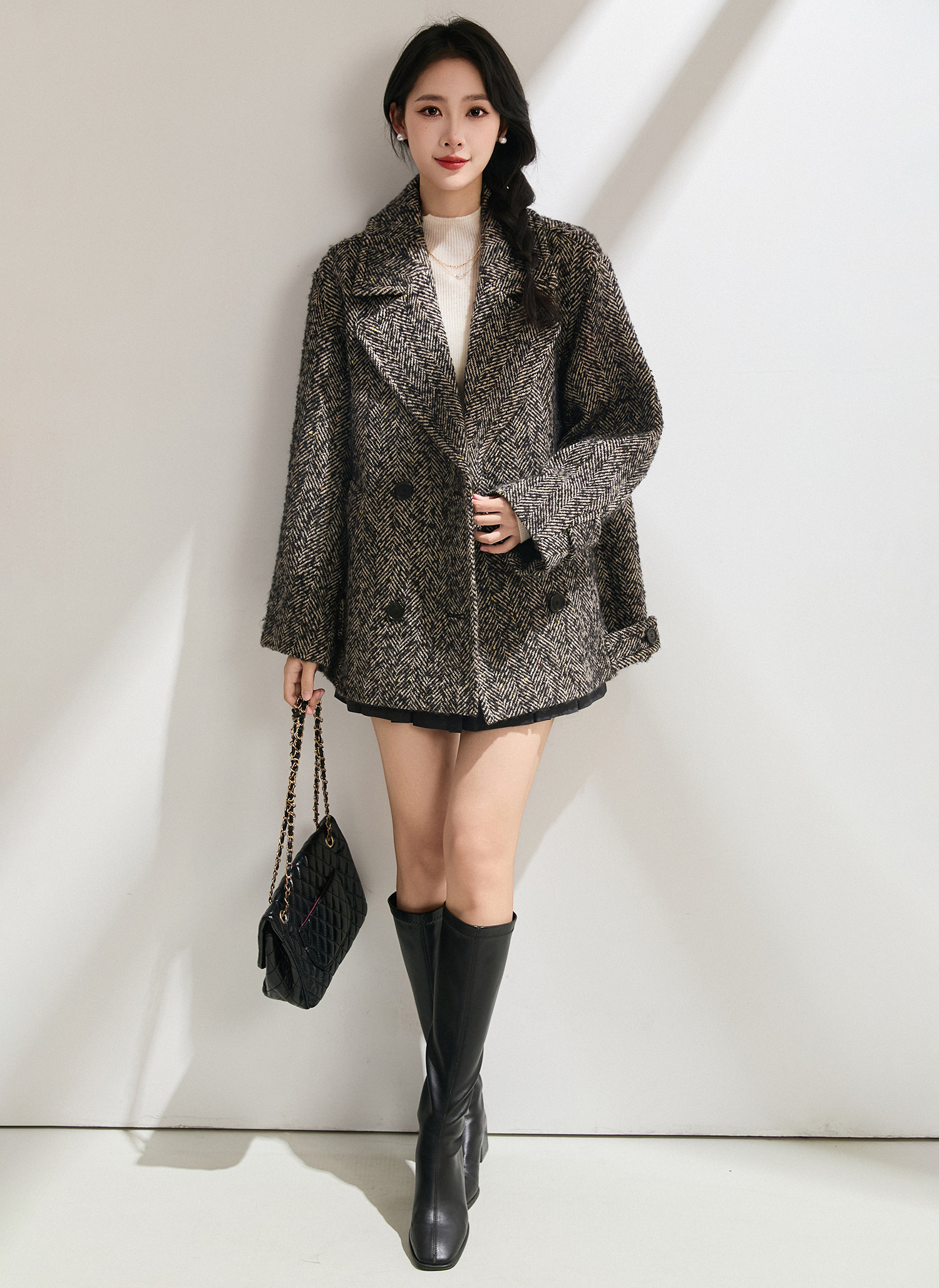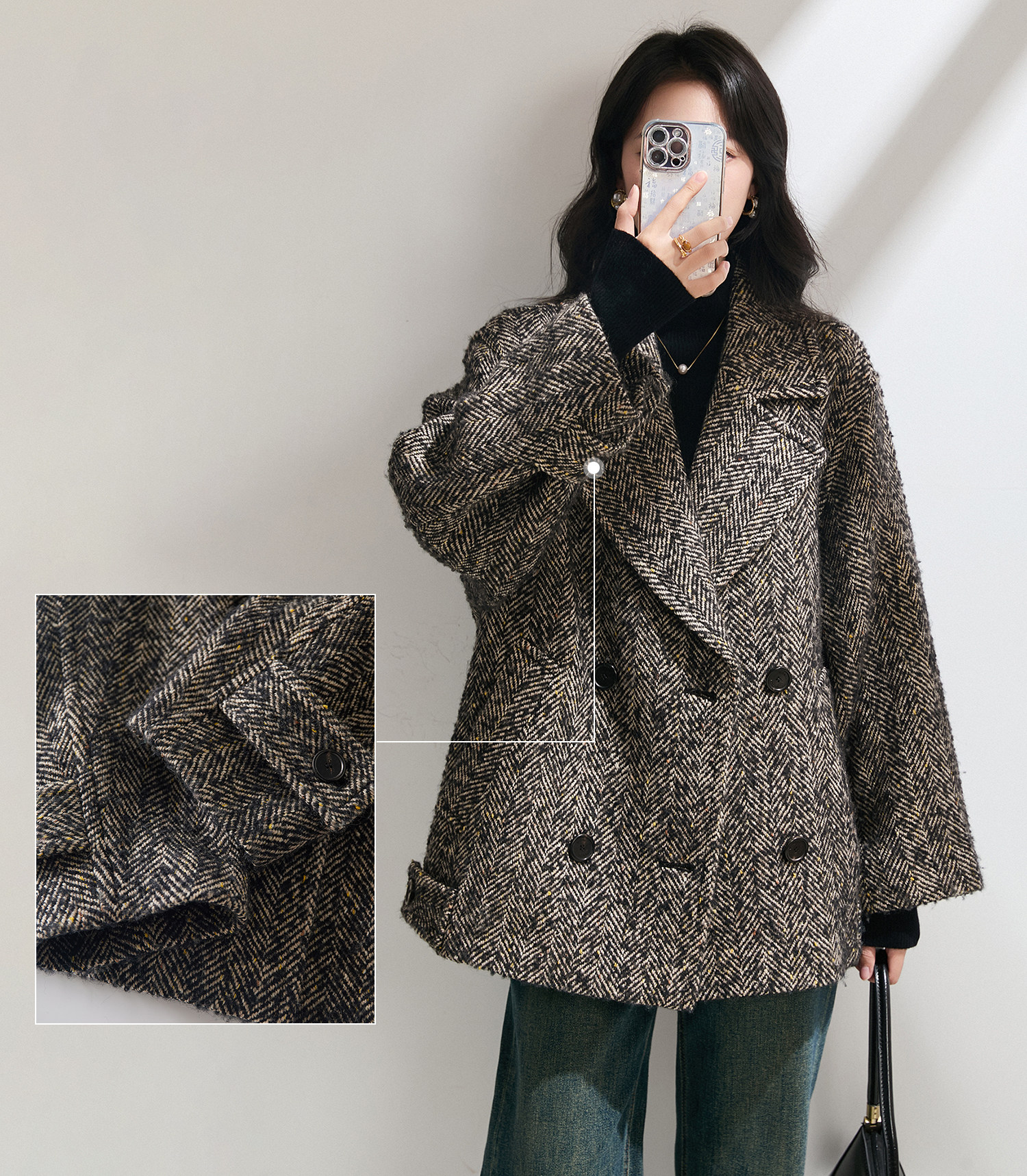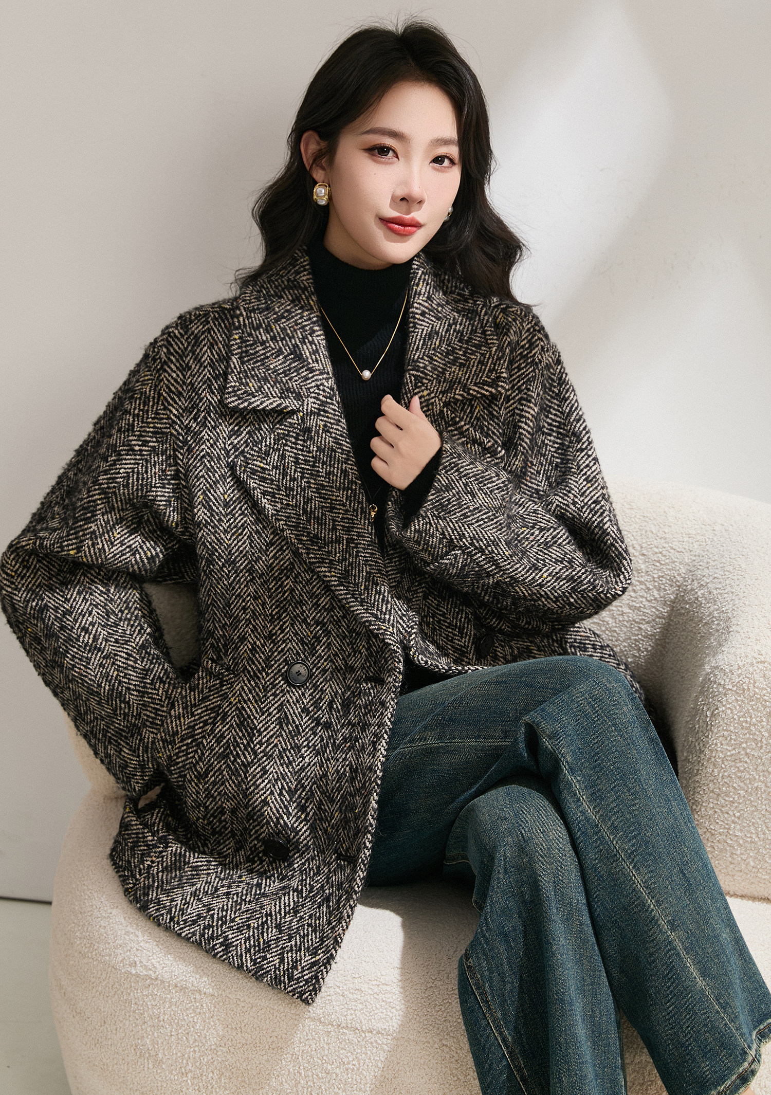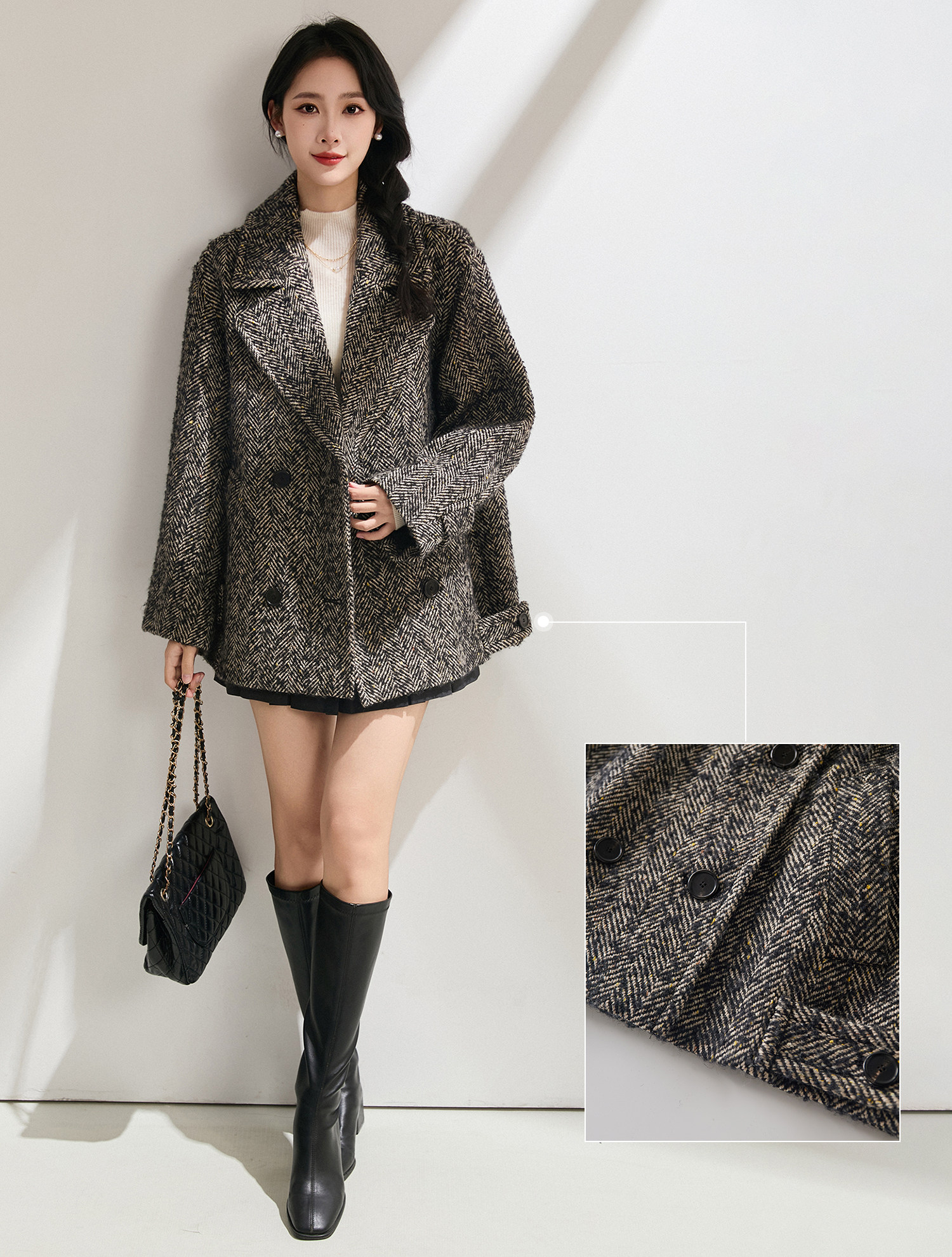 Simple and comic rational style sheep wool herringbone retro tweed short coat loose silhouette coat for women winter