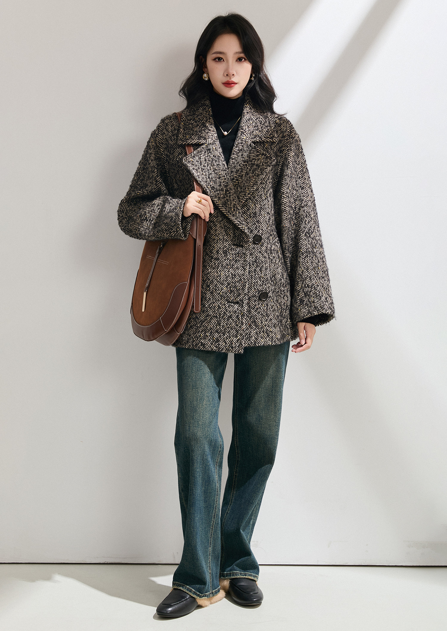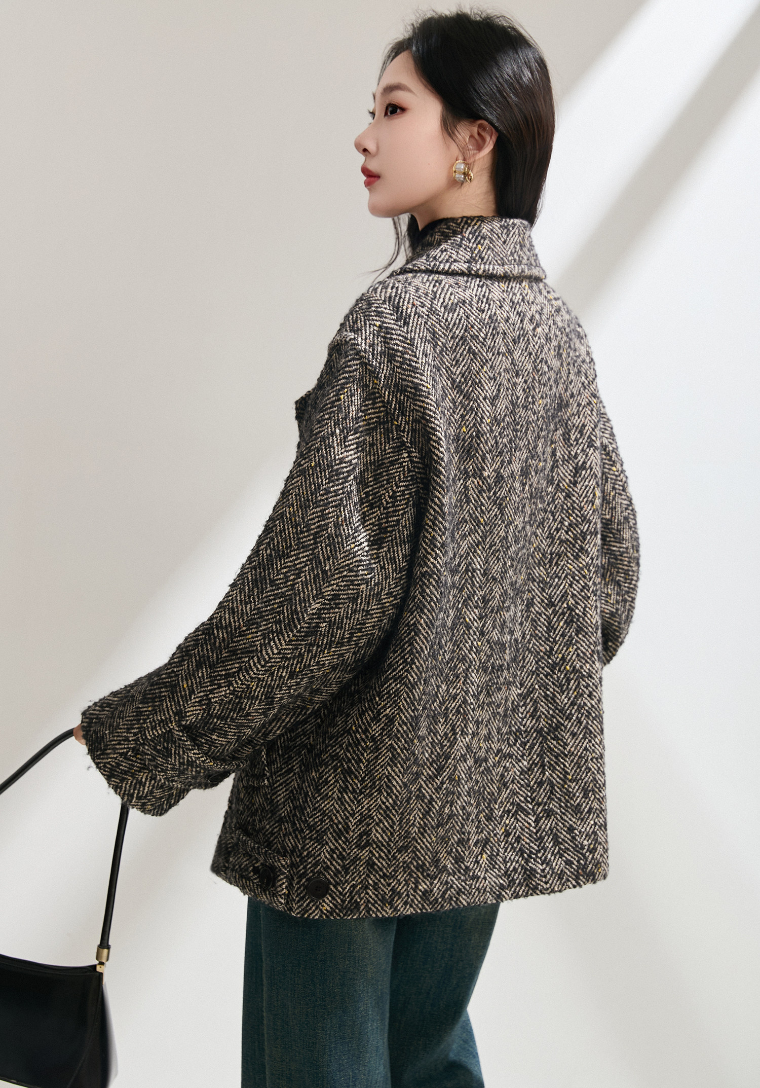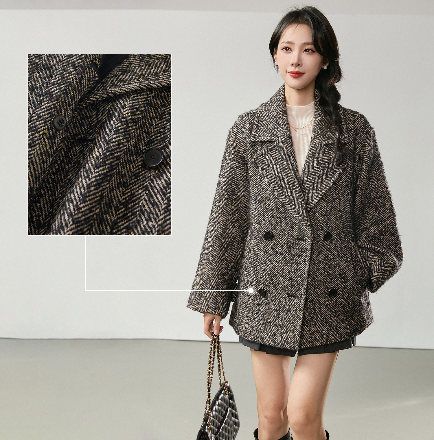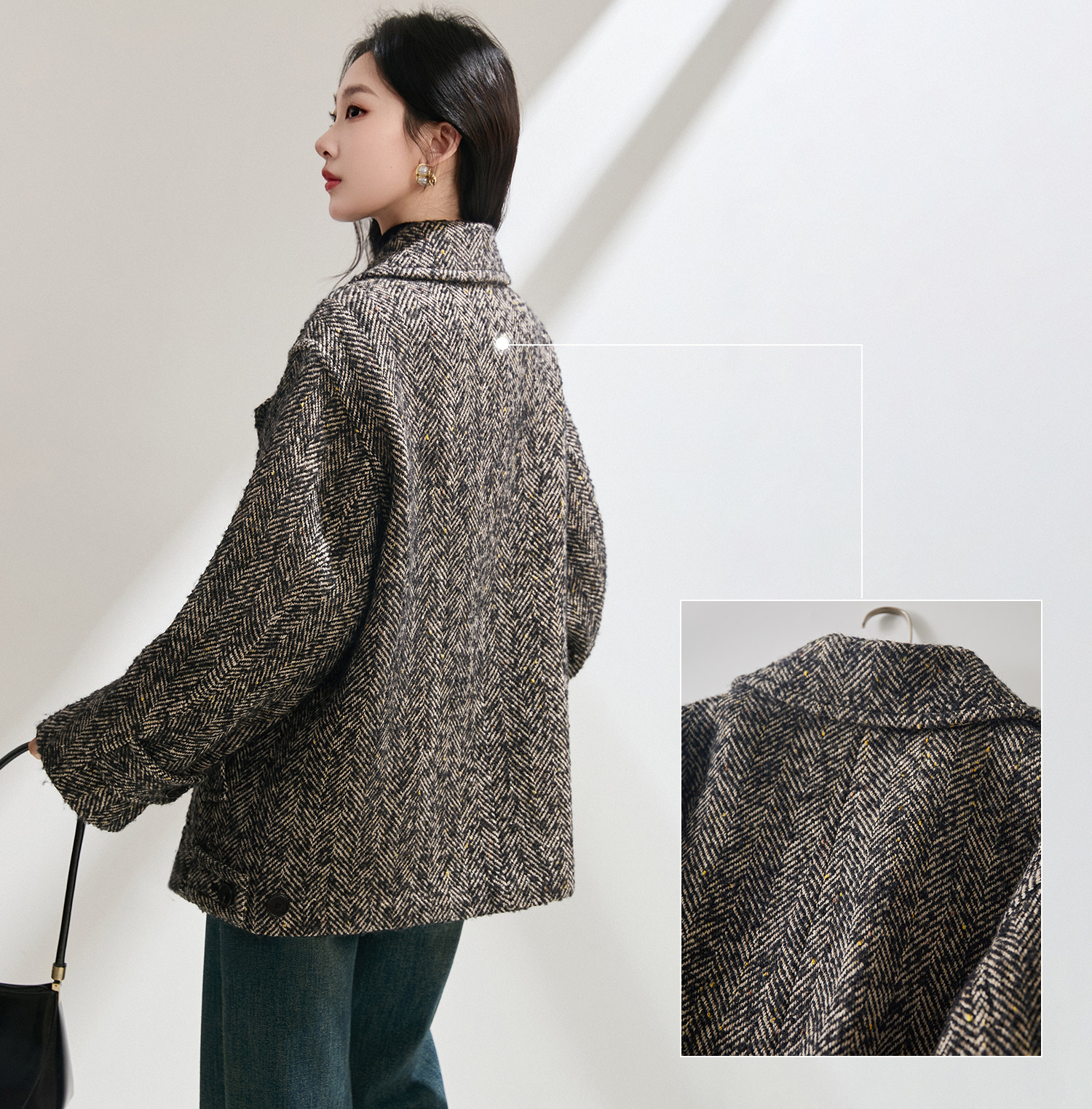 搭配粗花呢材质,弱化正式感,强化休闲氛围