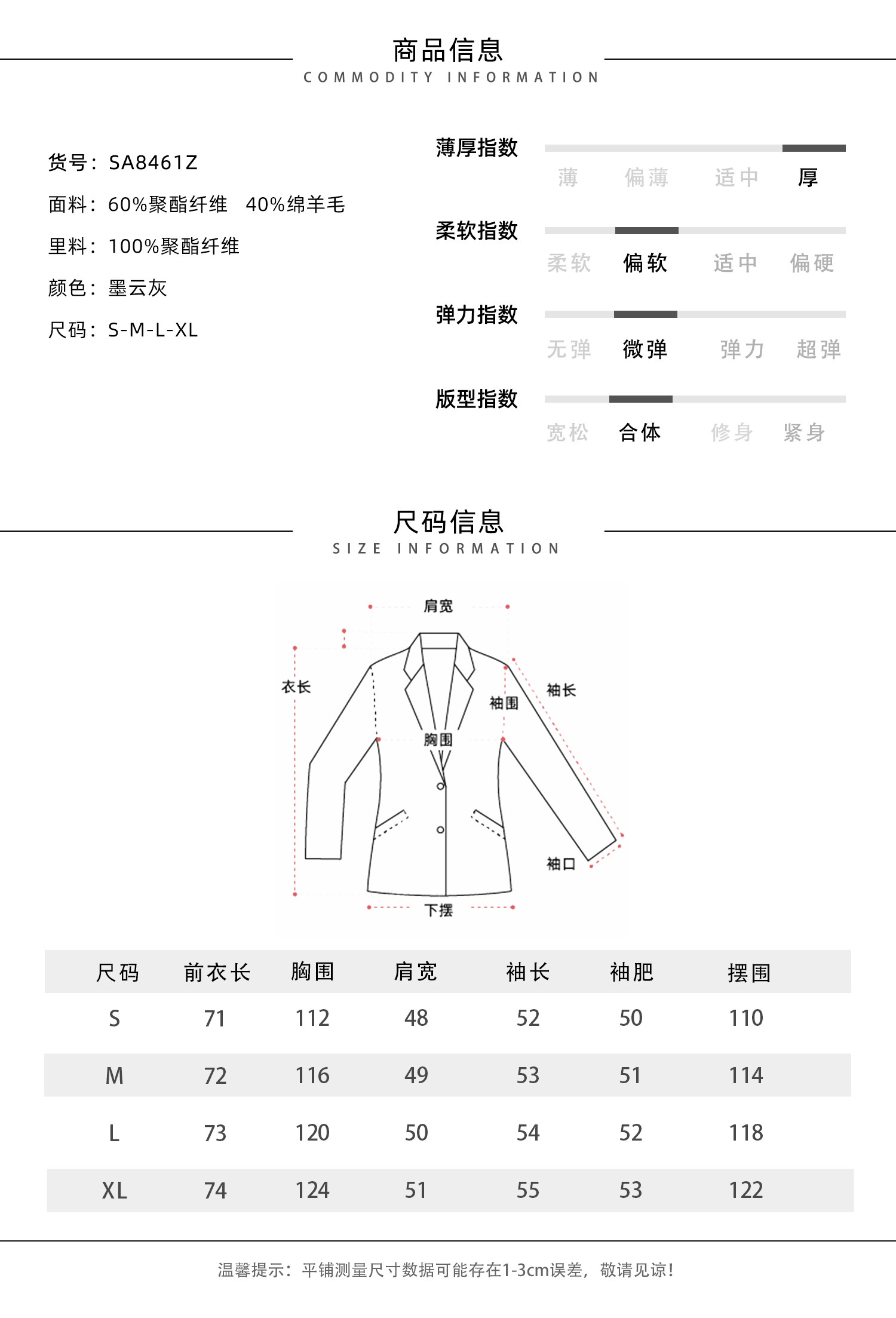 抗皱性佳,日常穿着易打理,成衣质感颇为篙级有型
