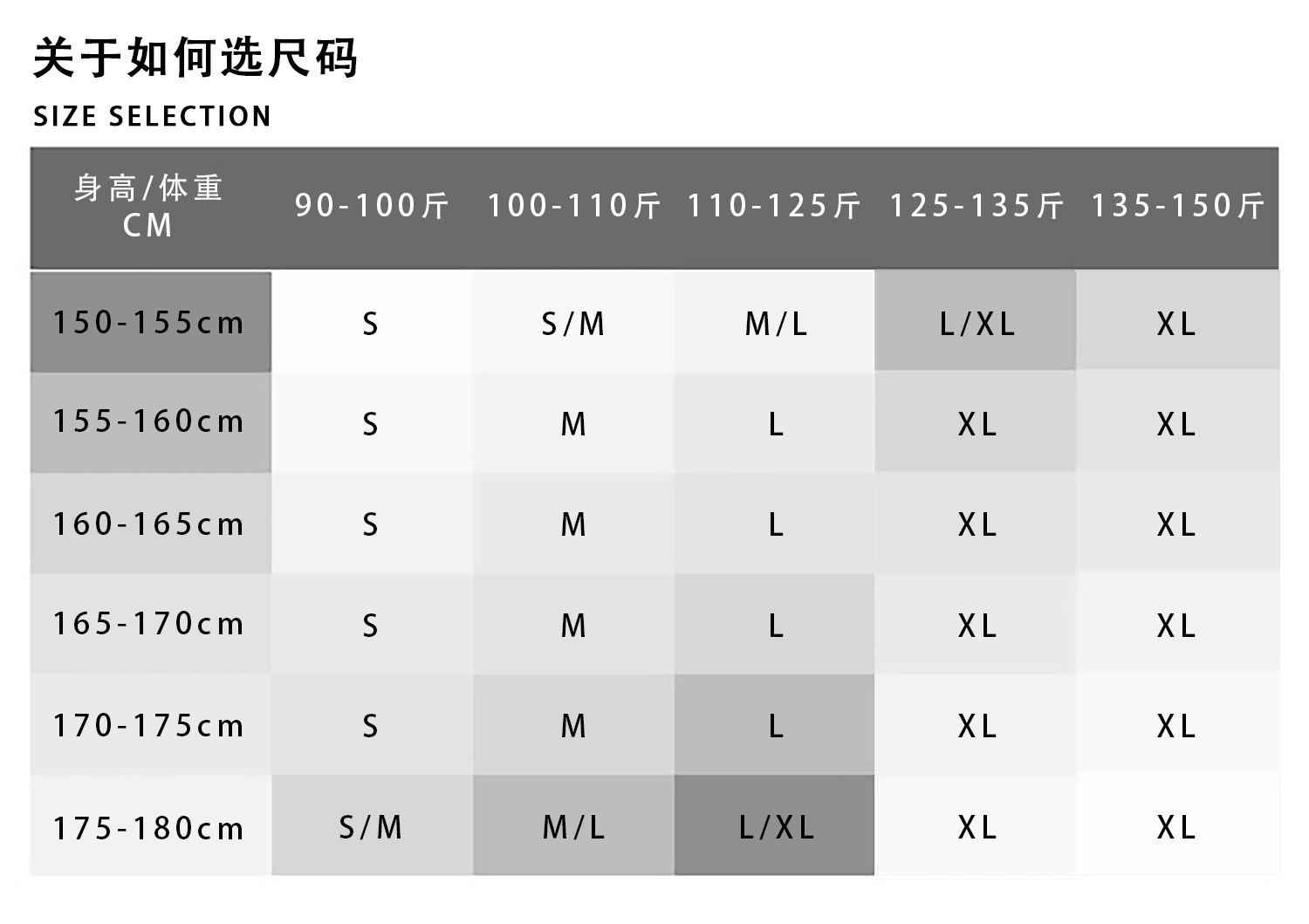 China (cm) 160-165/84-86 165-170 / 88-90 167-172 / 92-96 168-173 / 98-102 170-176 / 106-110