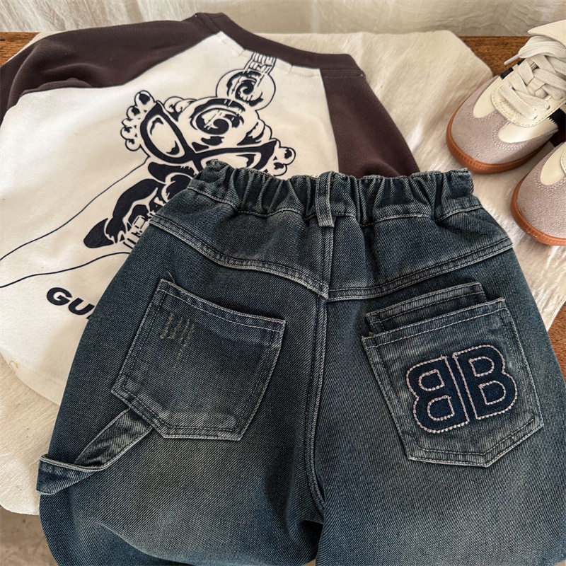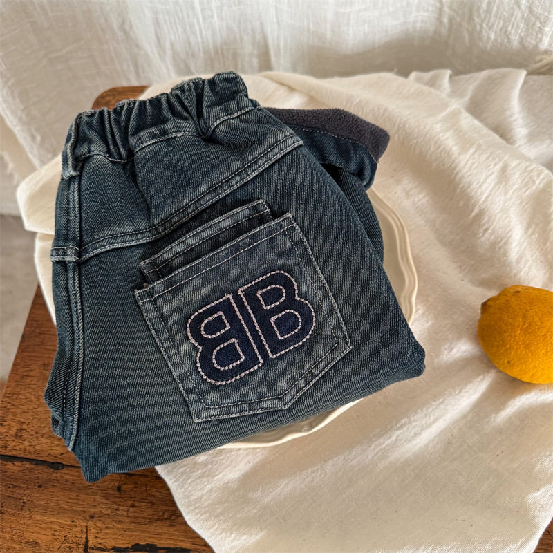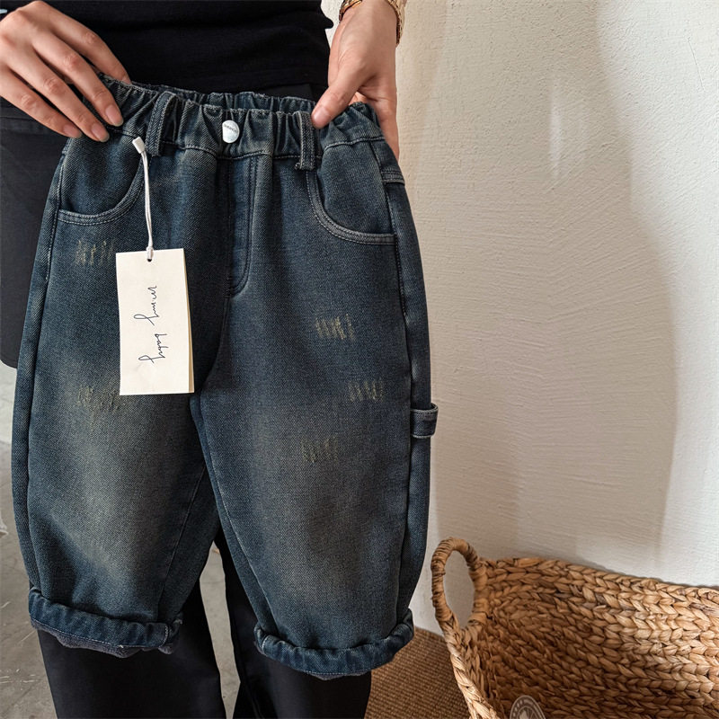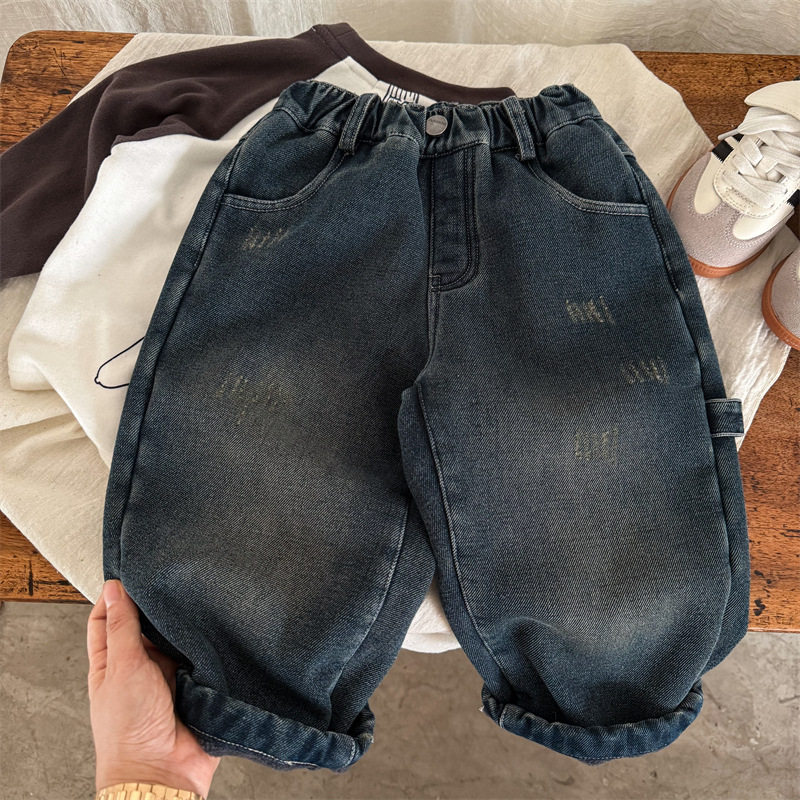Boys' pants winter thickening boys' plus velvet children's jeans all-in-one velvet baby 2025 new fashion cool and handsome