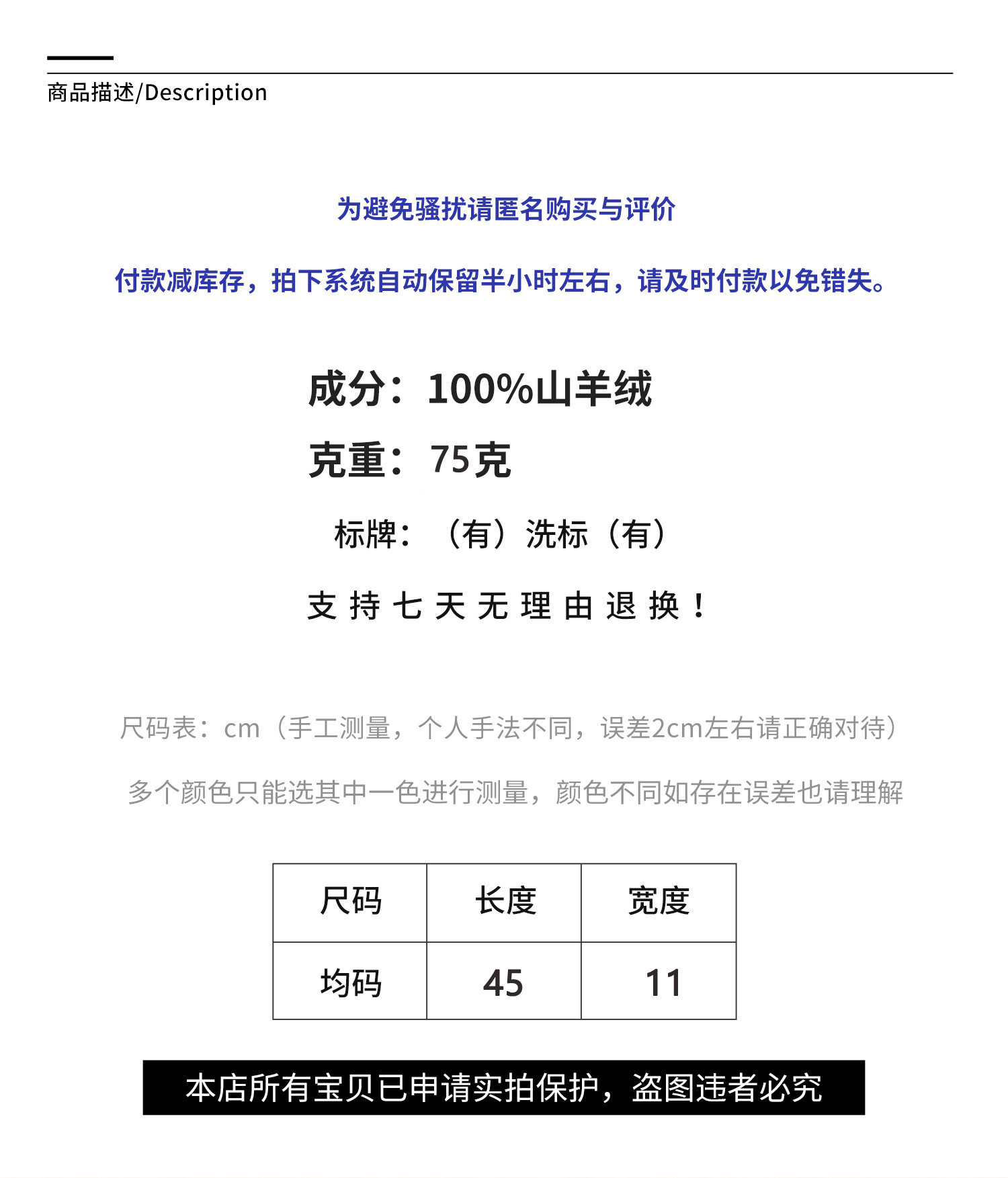 Material ingredients Cashmere (Cashmere) 100%