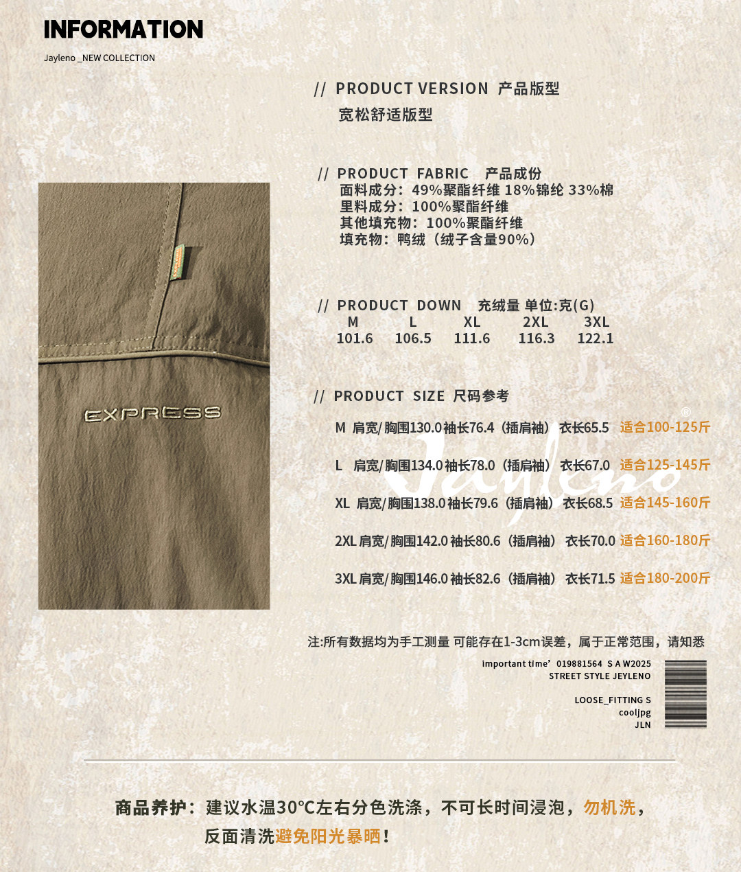 Fleece filling amount 101.6-122.1g