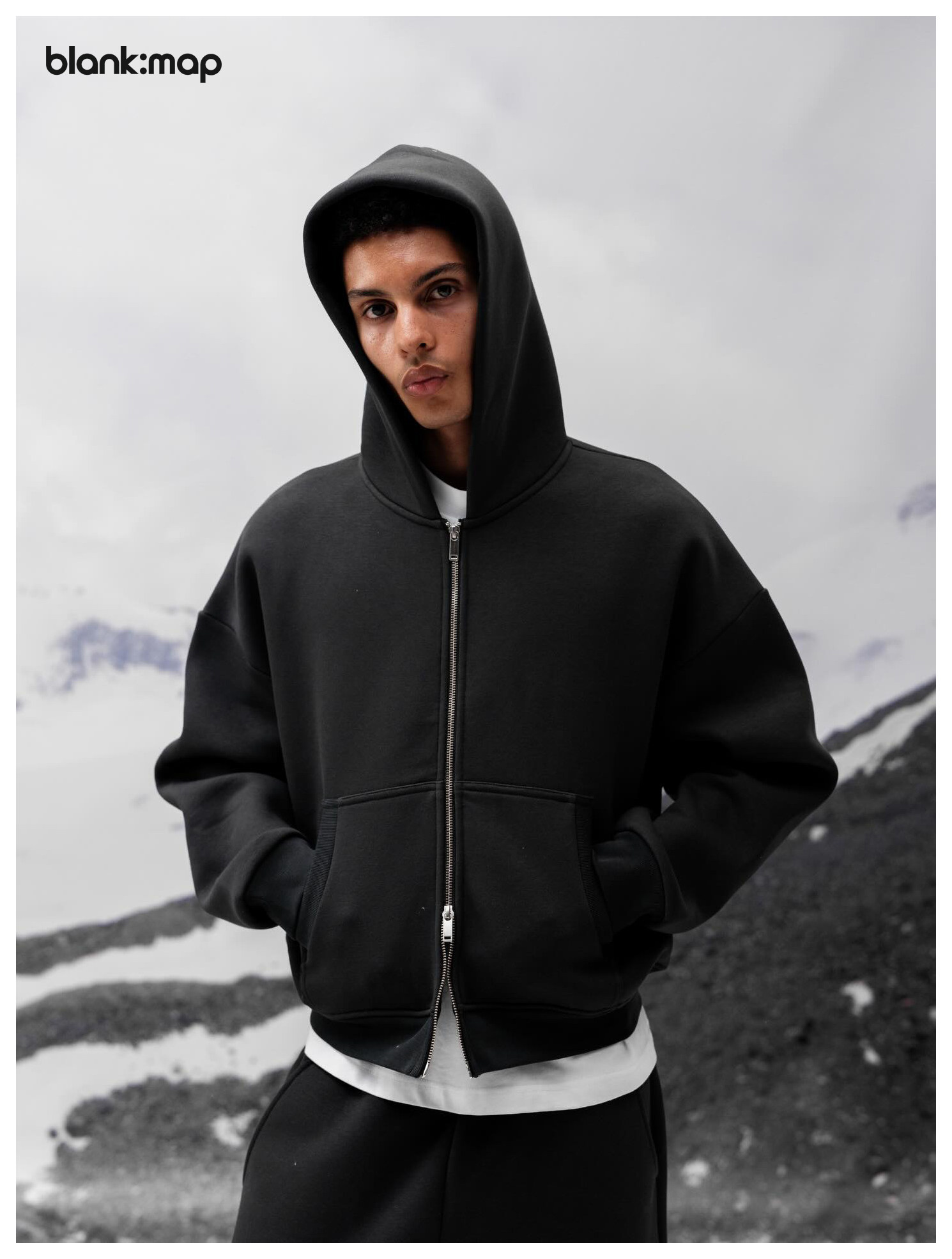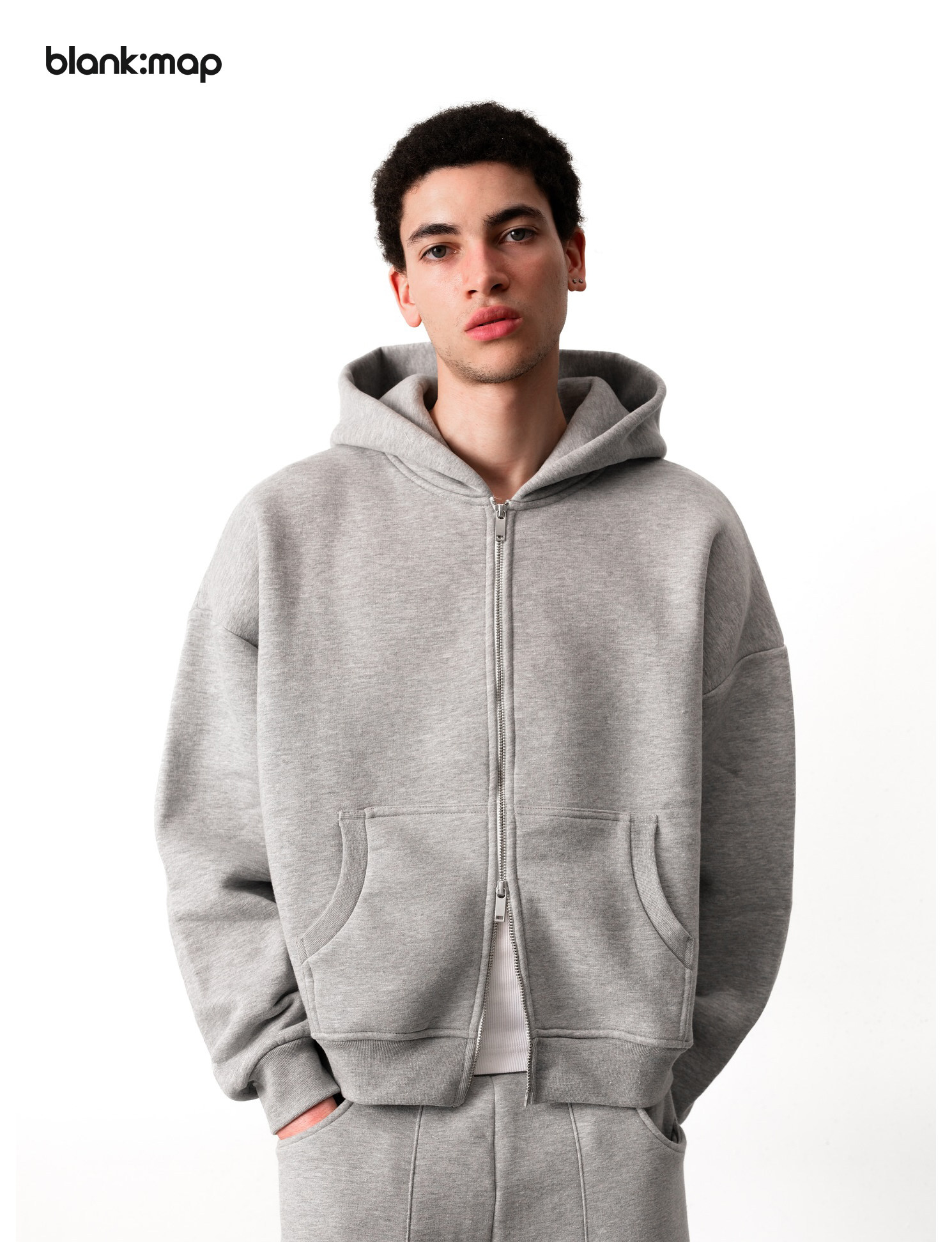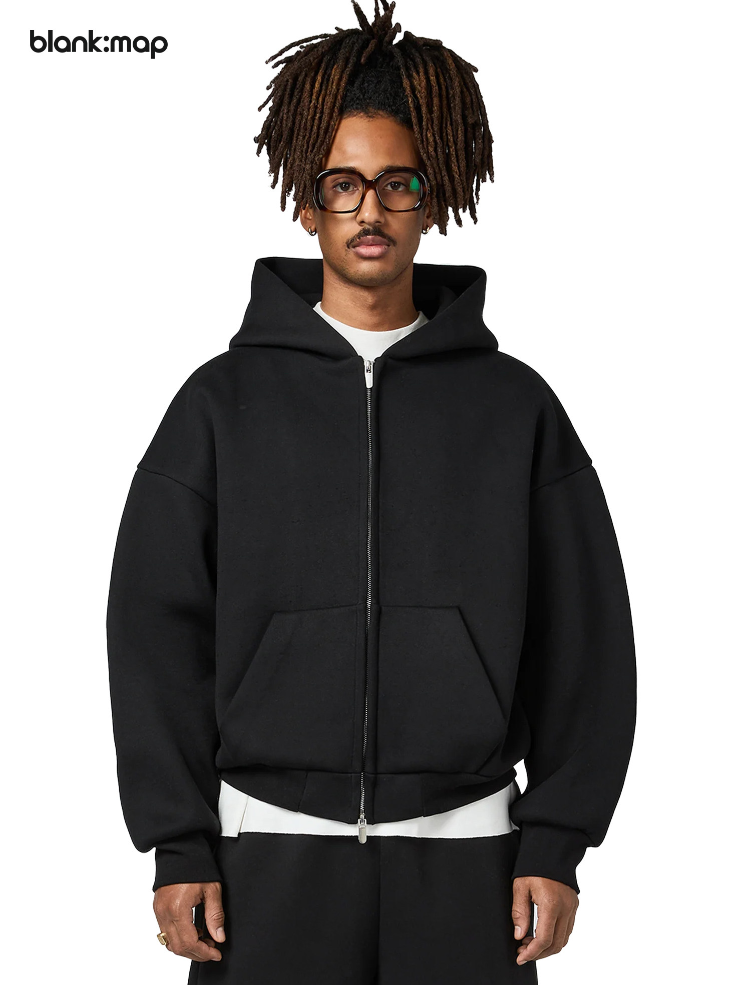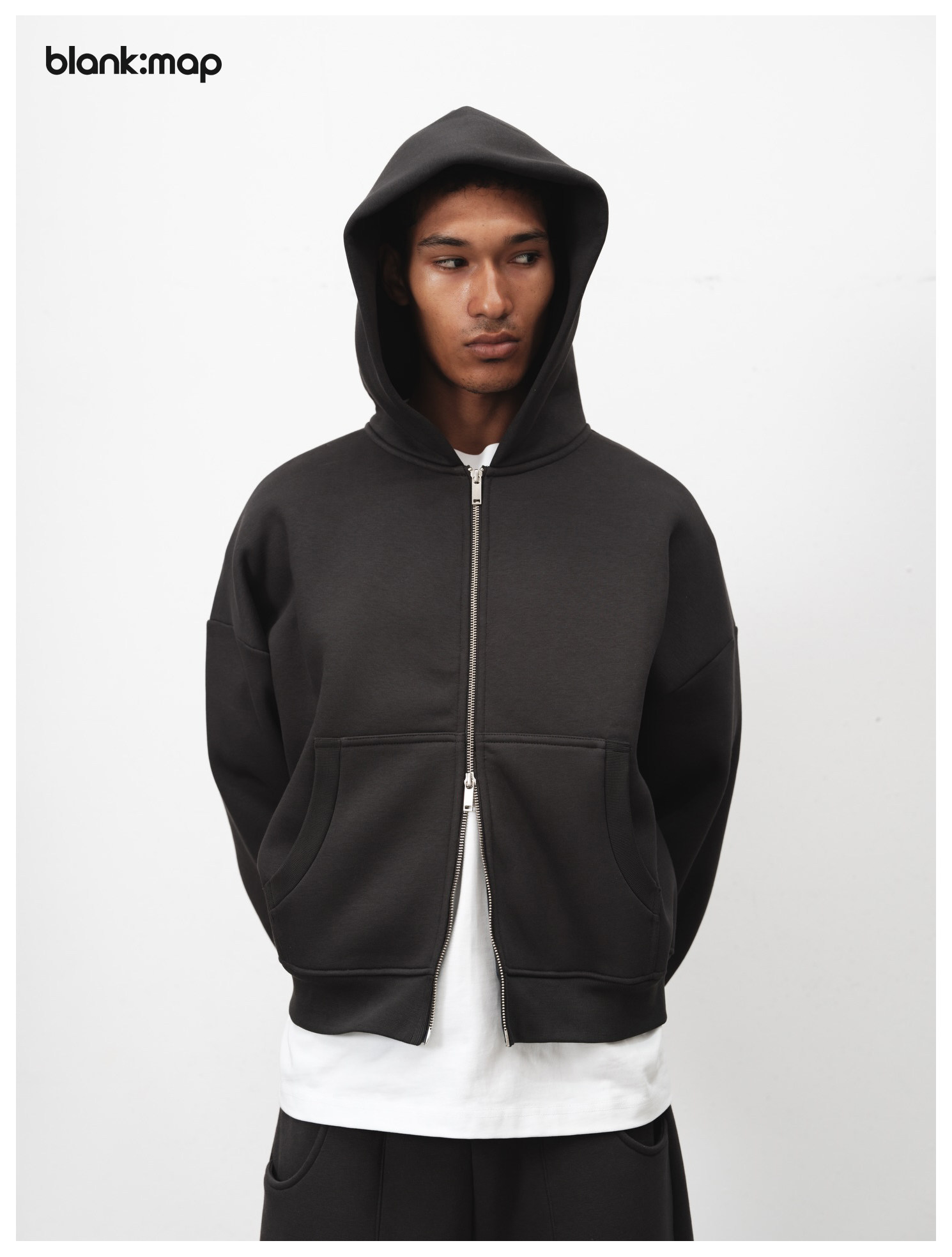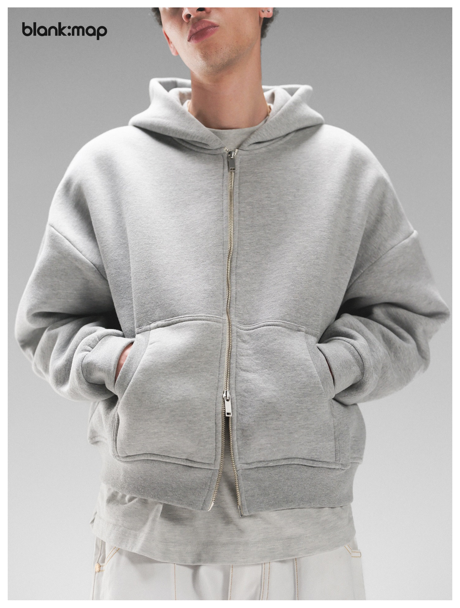 Blank Map American short boxy double zipper sweatshirt cleanfit heavyweight 500g stand-up hoodie men's trend