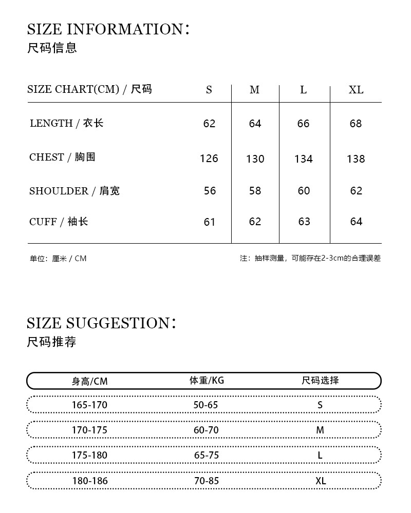 China (cm) 165 / 88-90 170 / 96-98 175 / 108-110 180 / 118-122 185 / 126-130