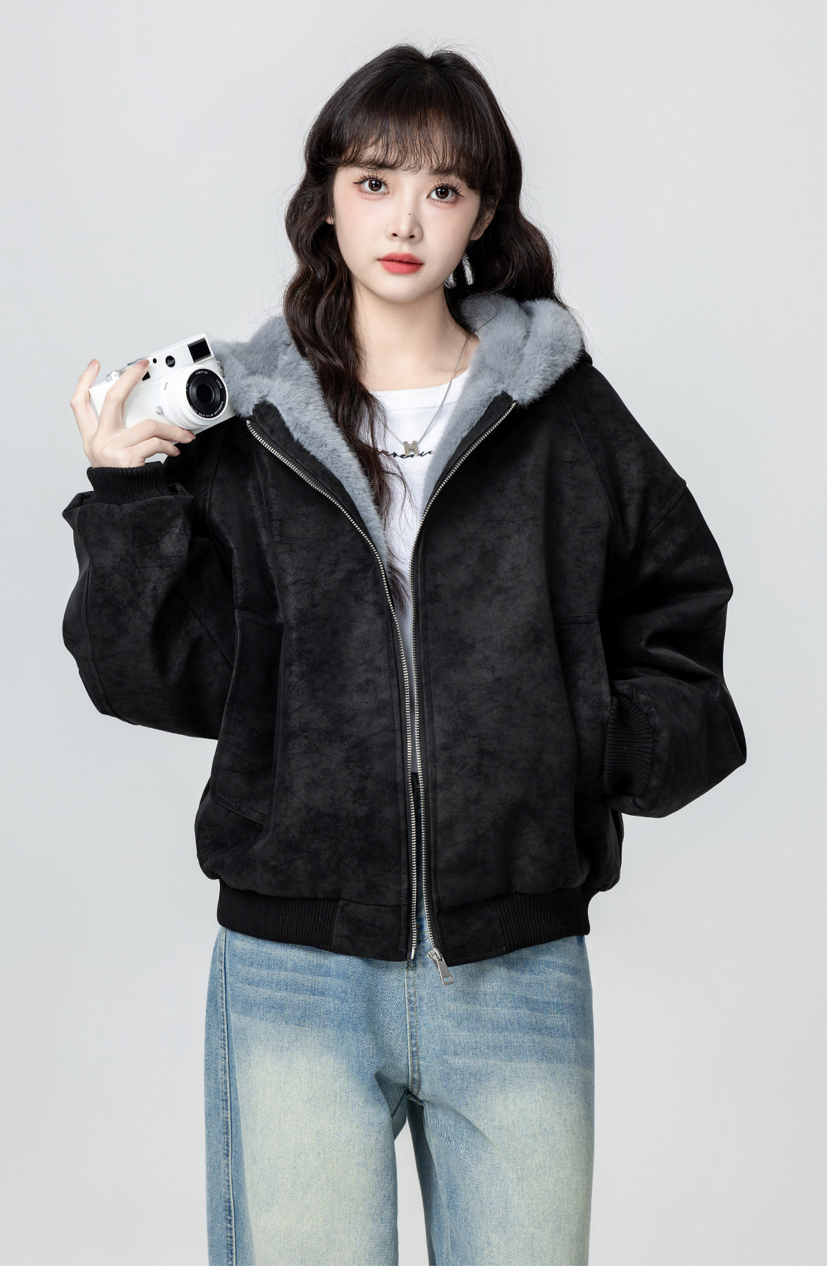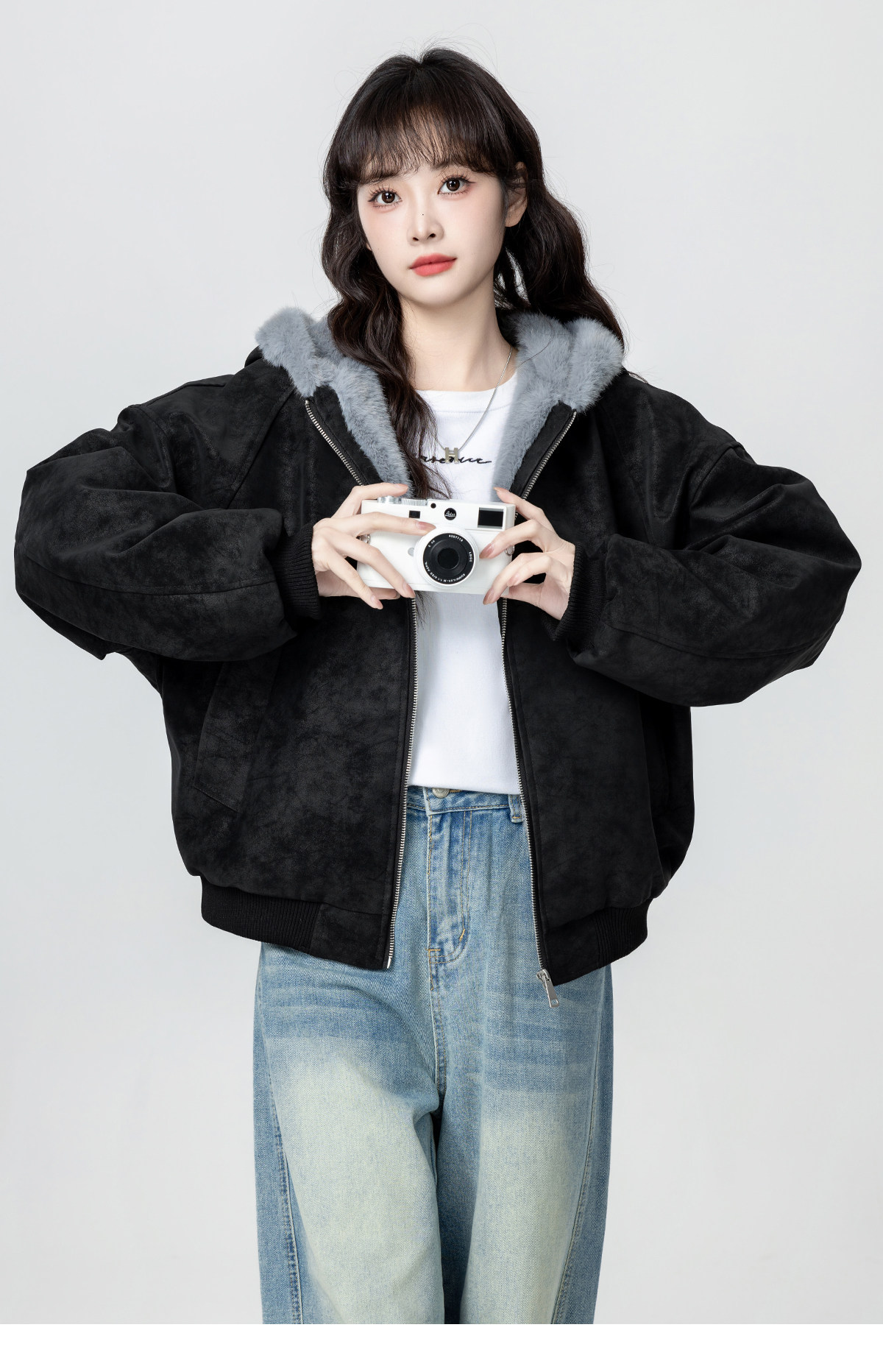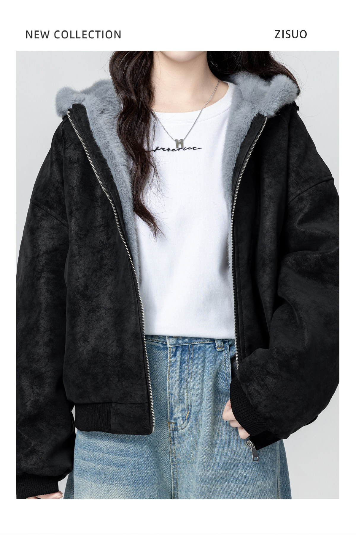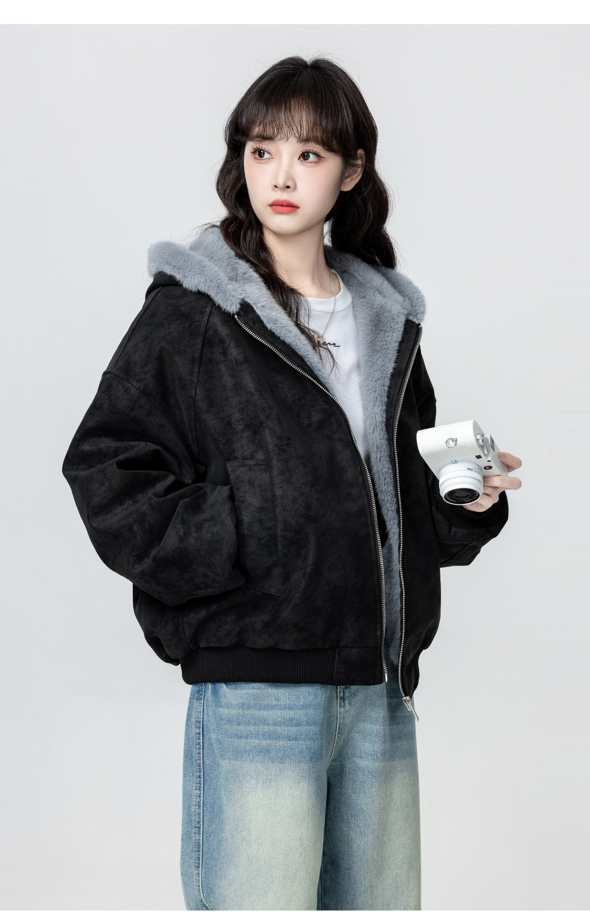 Black Hooded Leather Jacket for Women, Winter 2026 New Style, Fleece-Lined and Thickened Pu Leather with Fur Collar, Short Cotton Coat