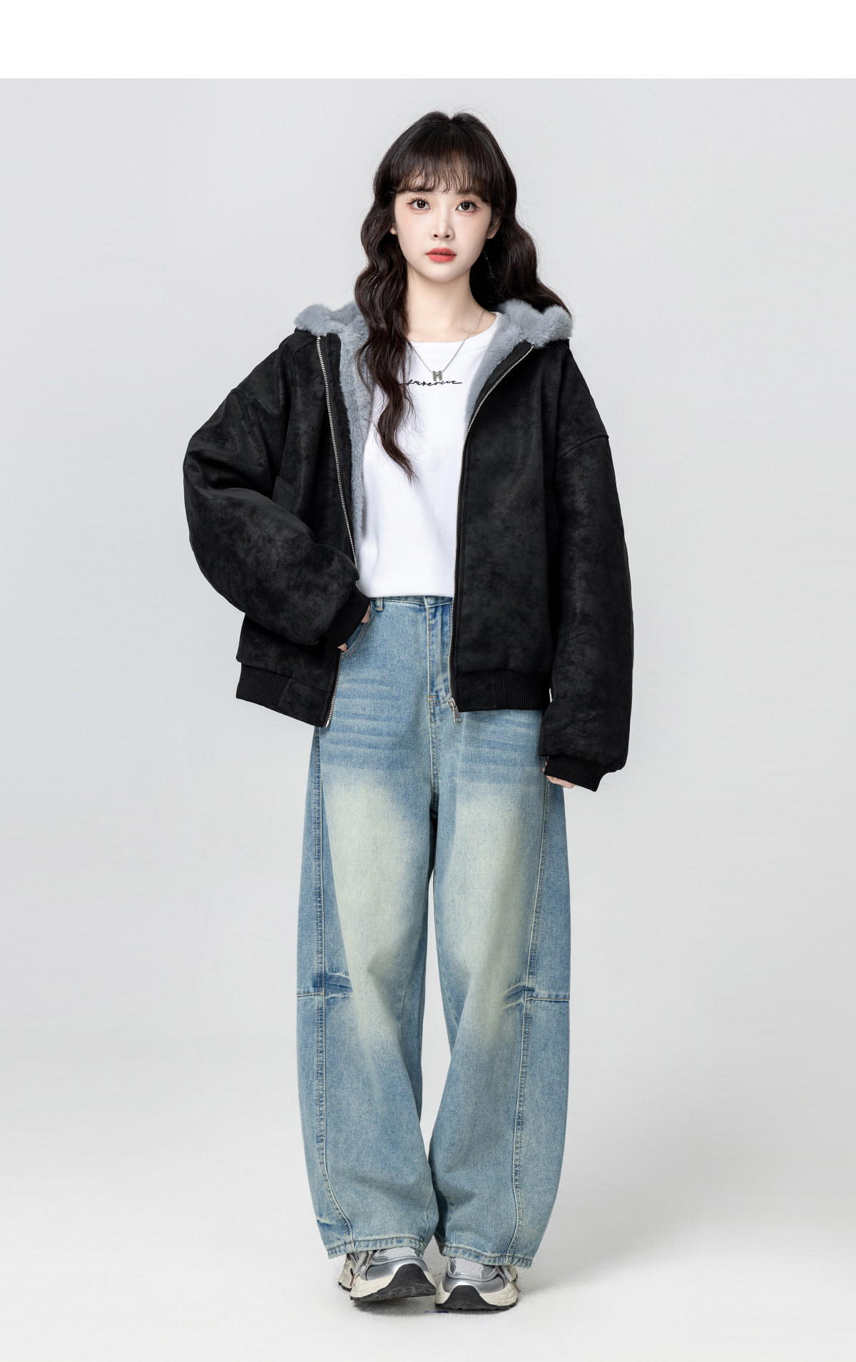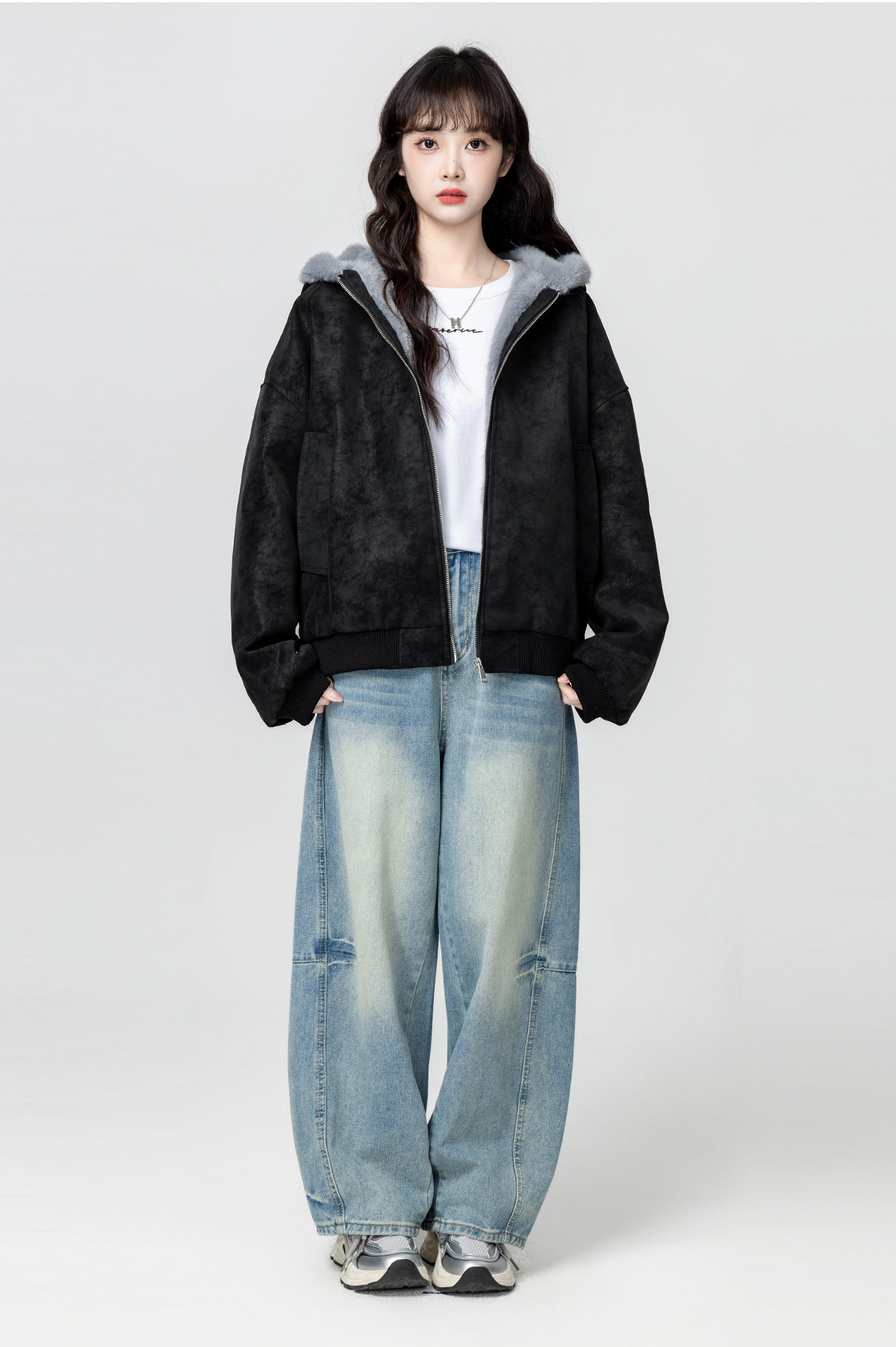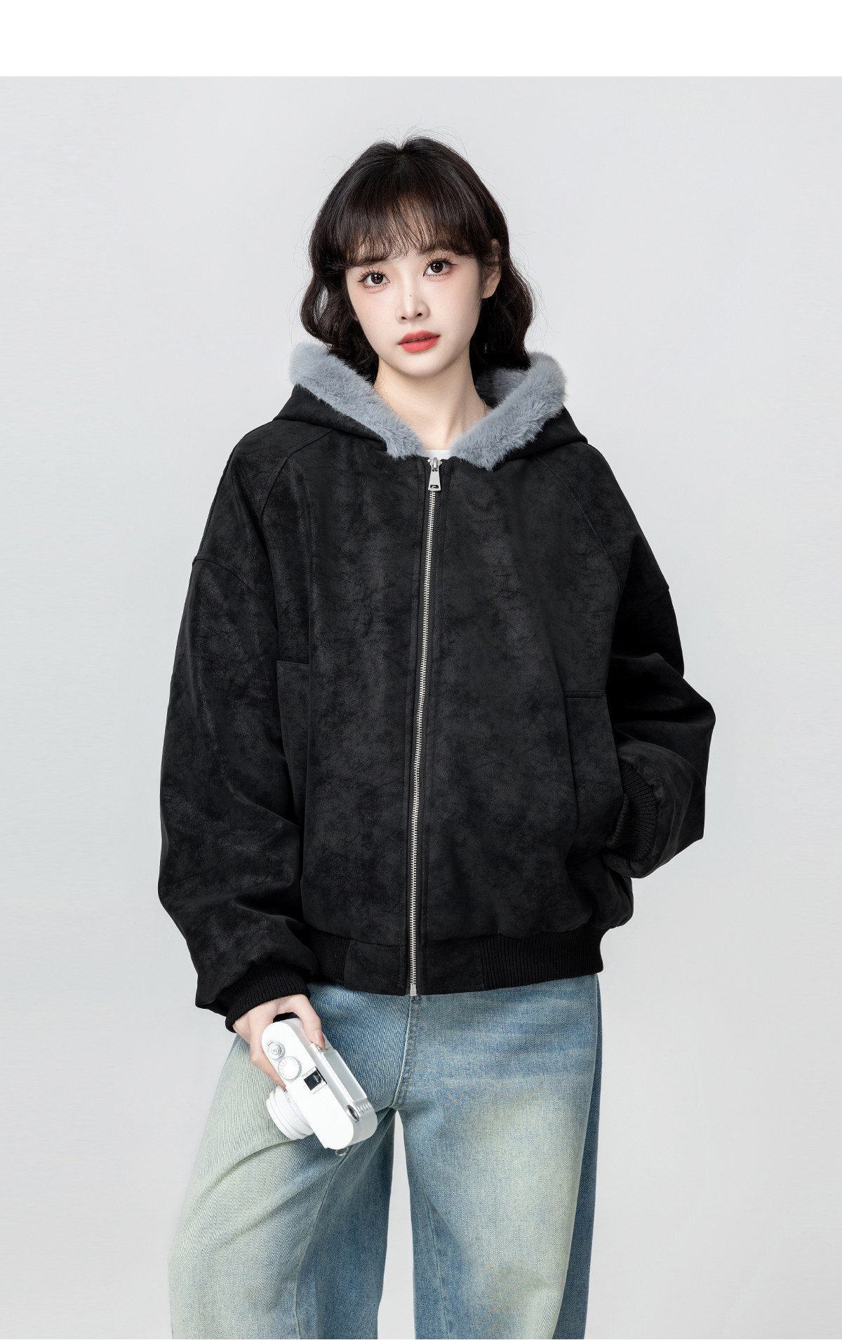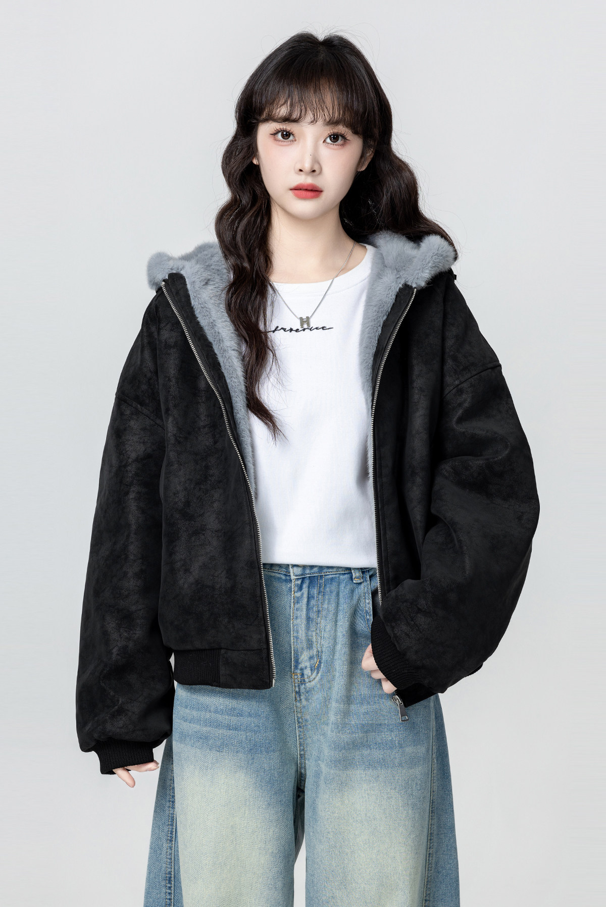 Black Hooded Leather Jacket for Women, Winter 2026 New Style, Fleece-Lined and Thickened Pu Leather with Fur Collar, Short Cotton Coat
