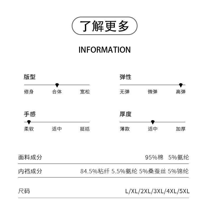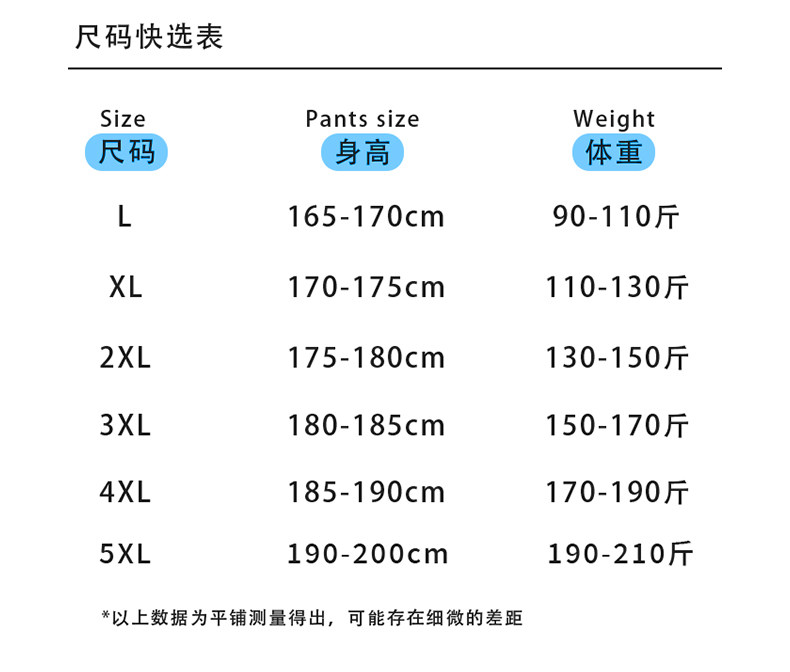 Size L (recommended weight 90-110 Jin Jin equals 0.5 kg),XL (recommended weight 110-130 Jin Jin equals 0.5 kg),2XL (recommended weight 130-150 Jin Jin equals 0.5 kg),3XL (recommended weight 150-170 Jin Jin equals 0.5 kg),XXXXL (recommended weight 170-190 Jin Jin equals 0.5 kg),5XL (recommended weight 190-210 Jin Jin equals 0.5 kg)
