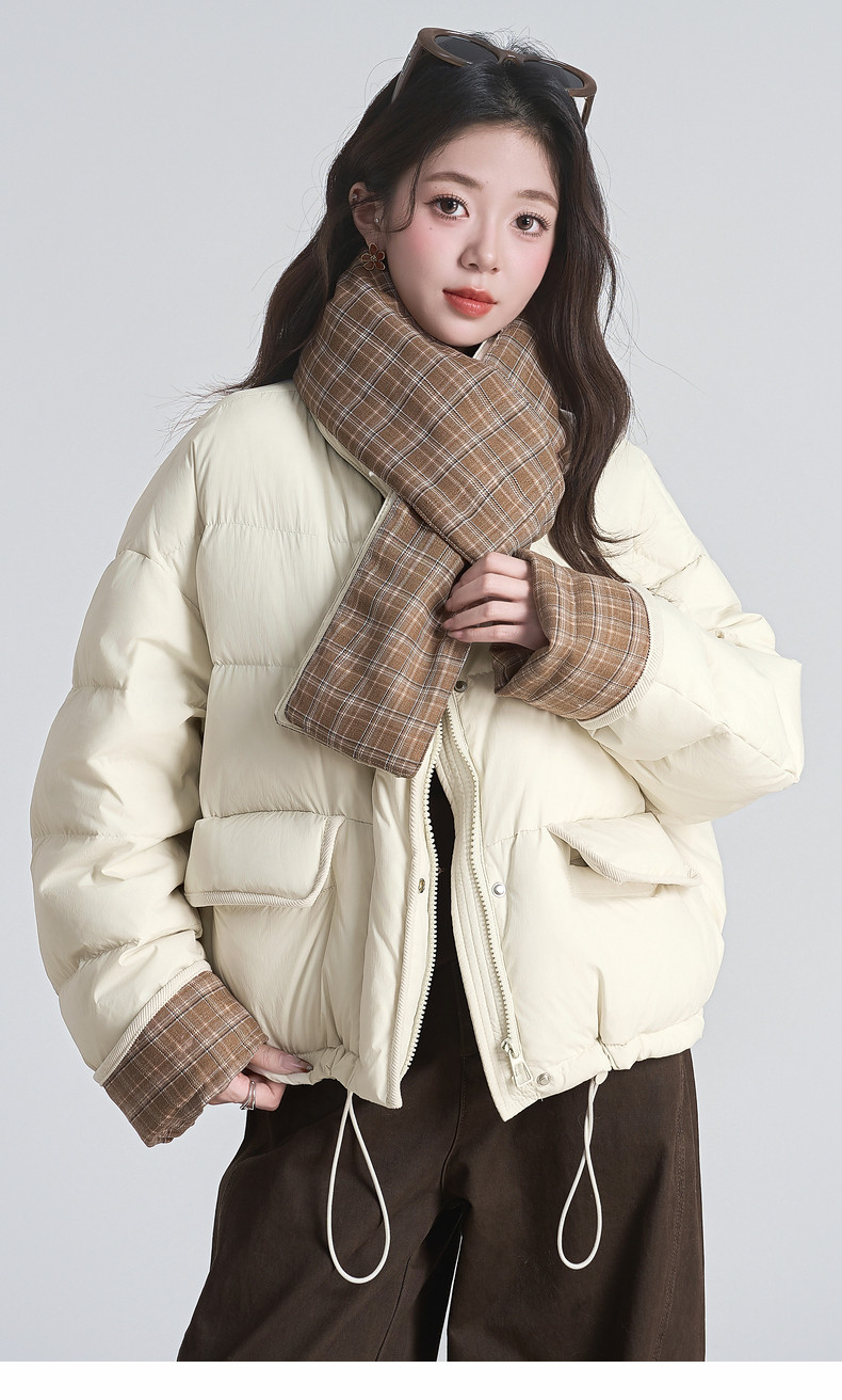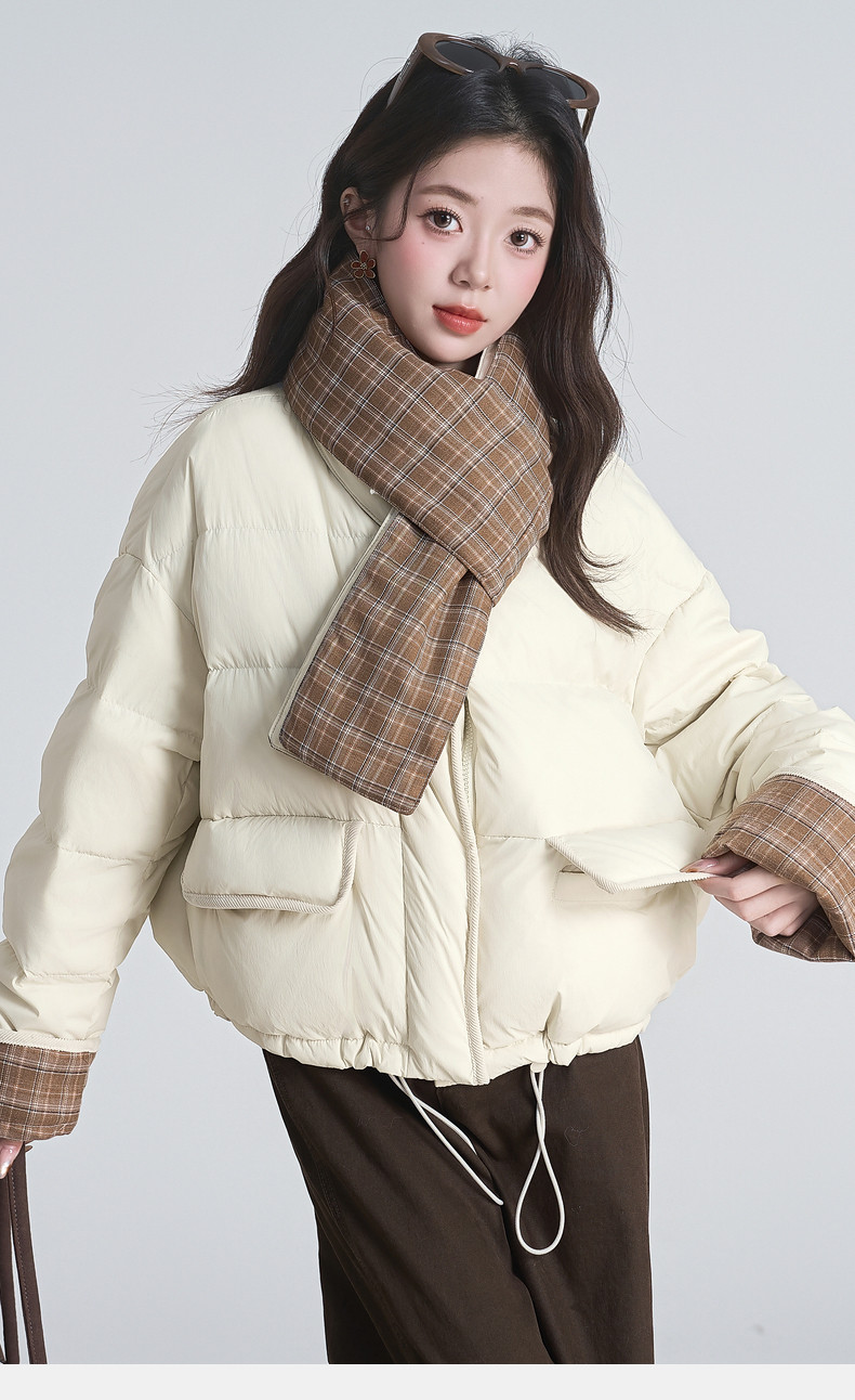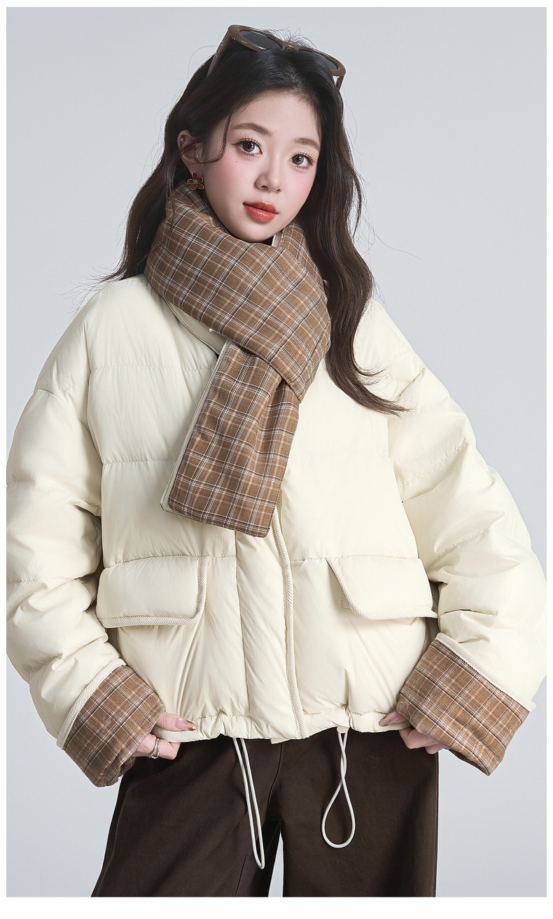 2025 winter new style spliced ​​plaid drawstring down jacket jacket women's scarf halter neck thickened warm loose bread coat