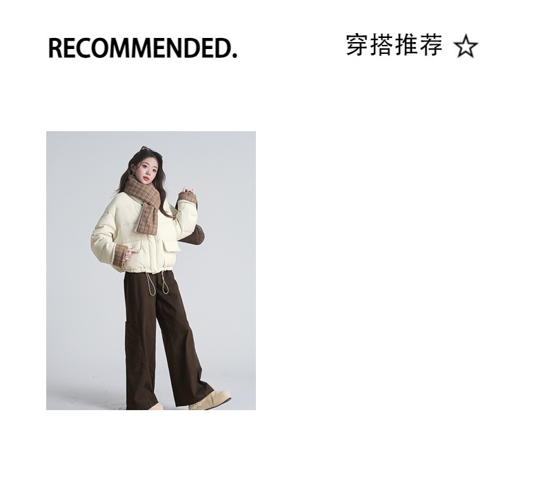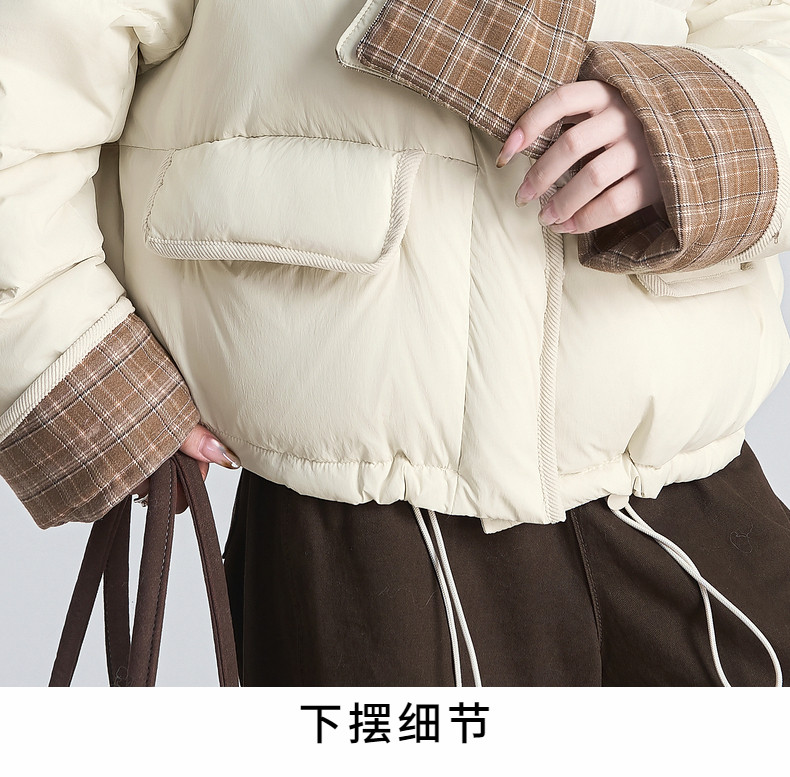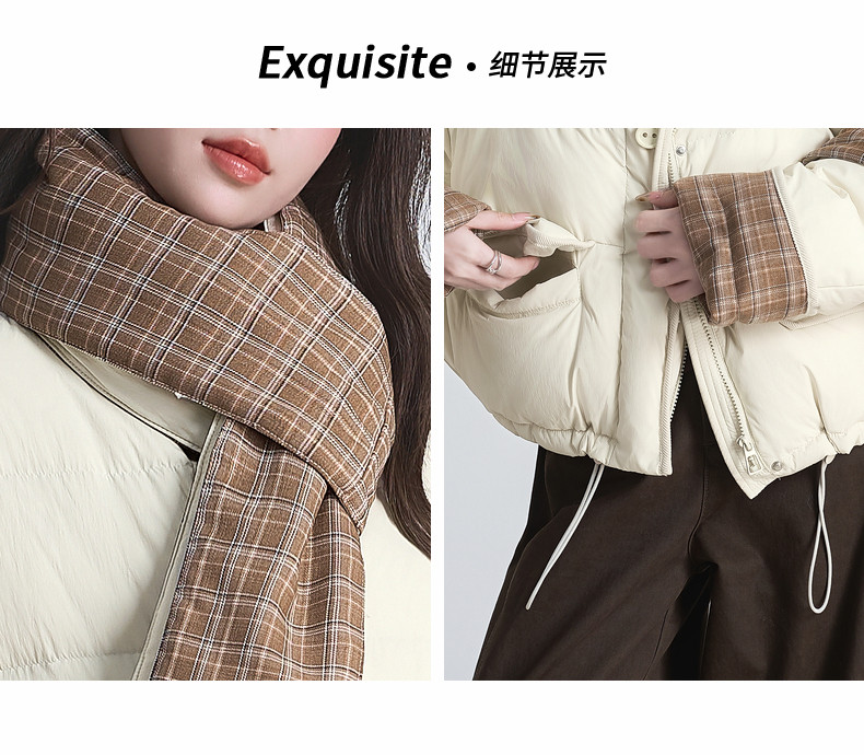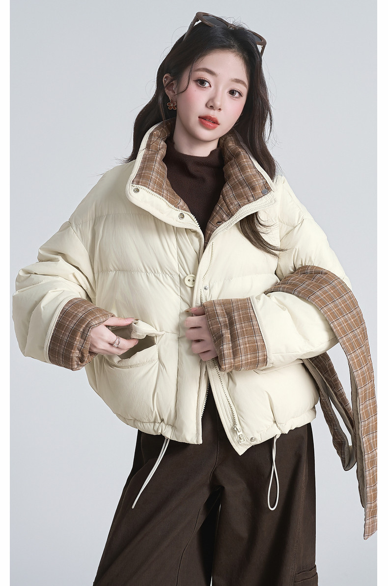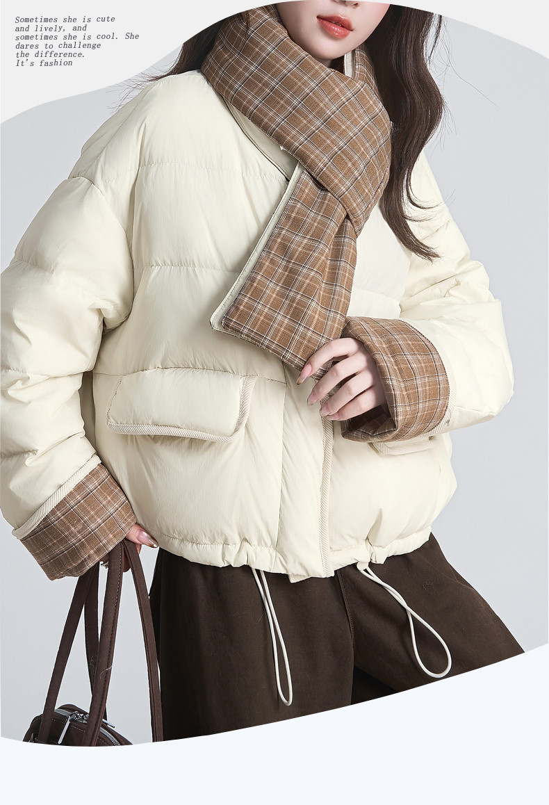 2025 winter new style spliced ​​plaid drawstring down jacket jacket women's scarf halter neck thickened warm loose bread coat