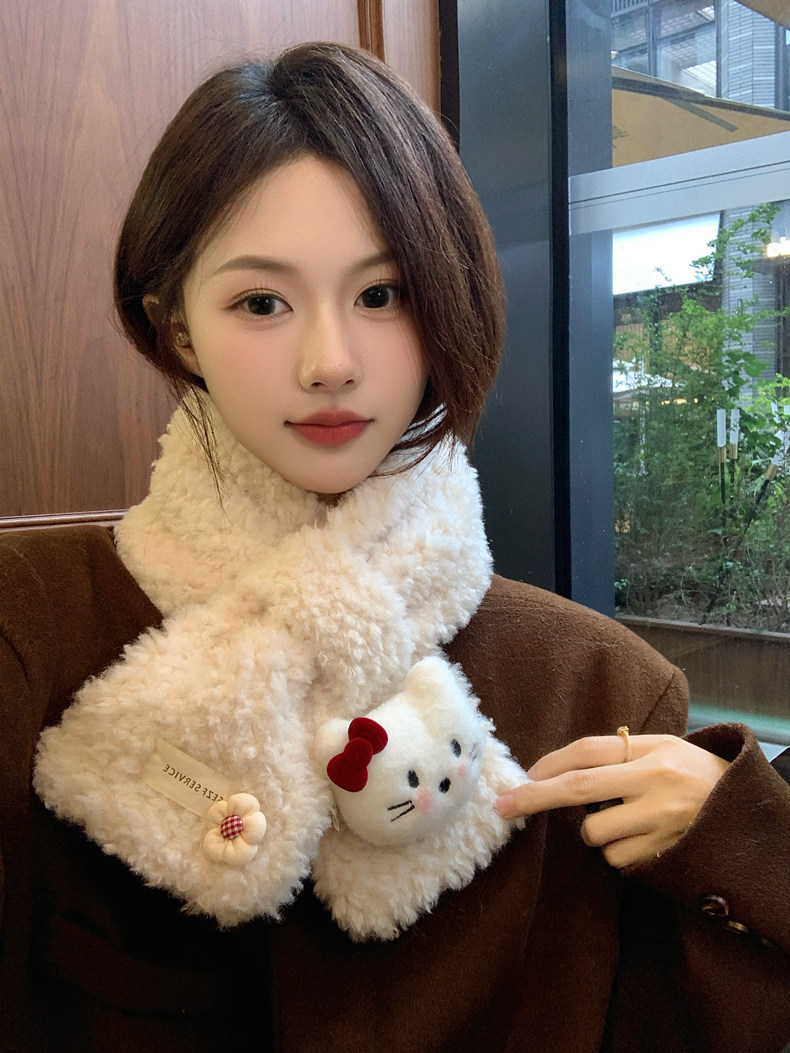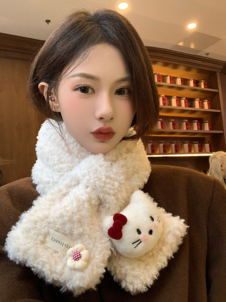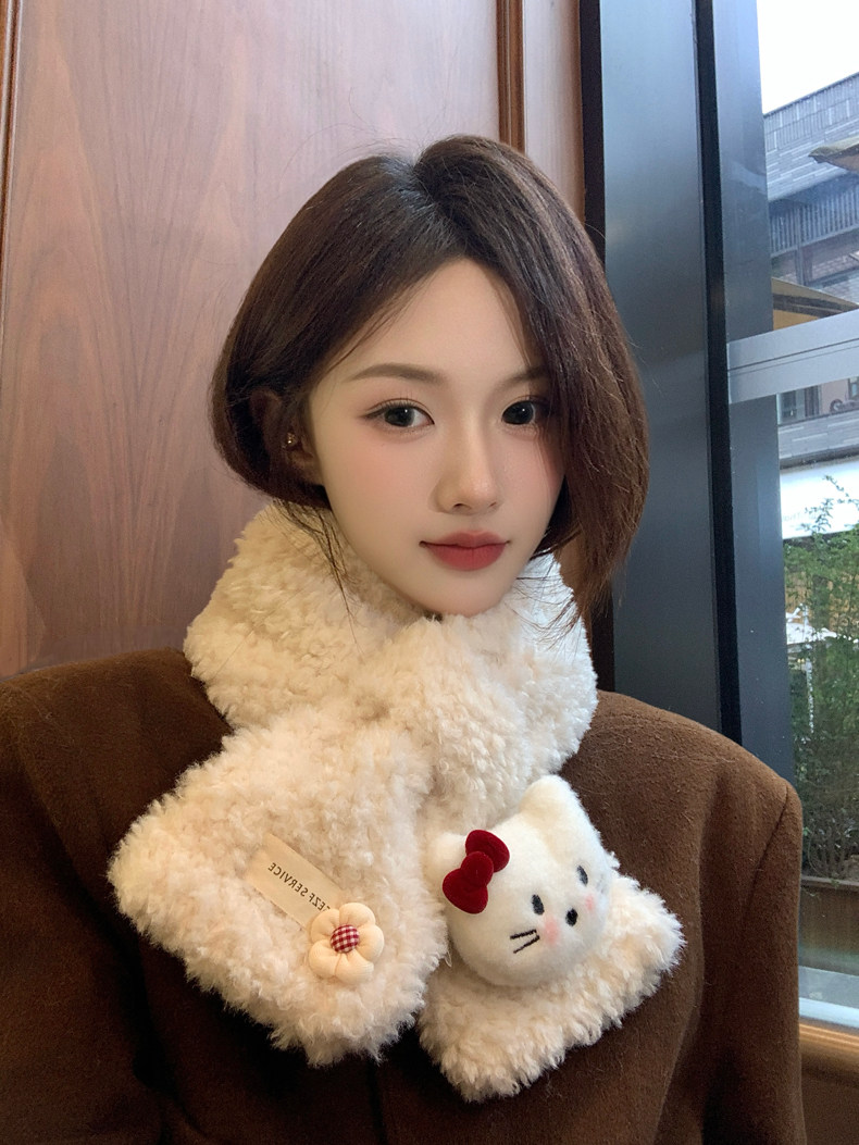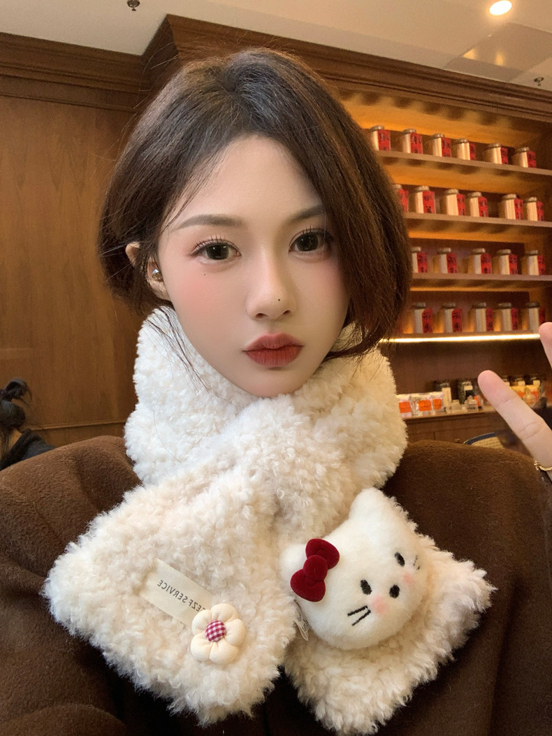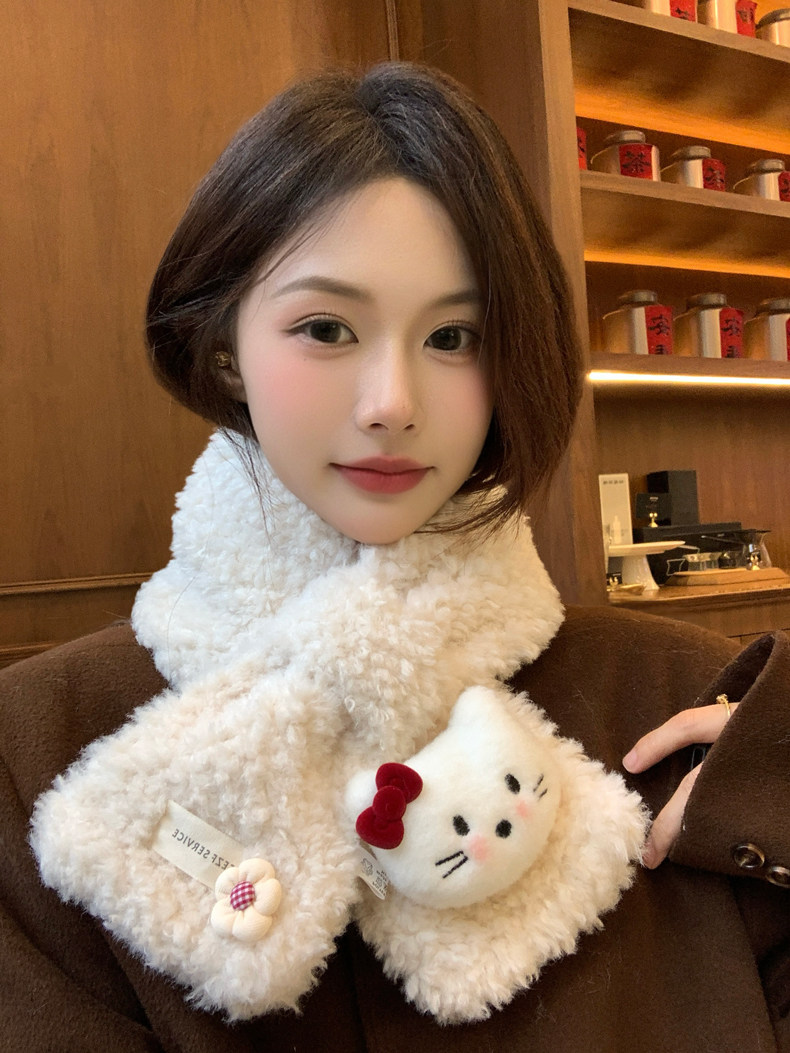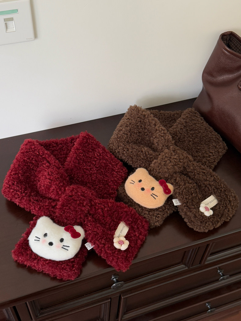 Cute Cat Plush Scarf for Women, Winter Warm Neck Protection, Cross Neck Scarf, Short Scarf for Students