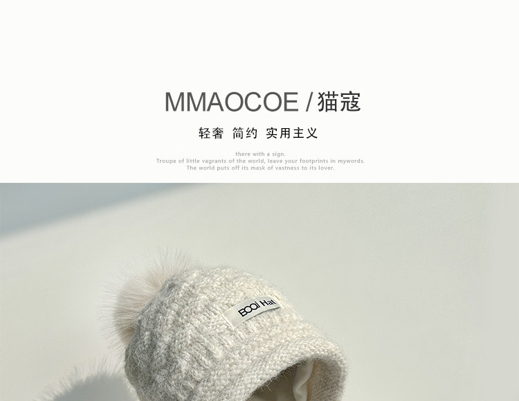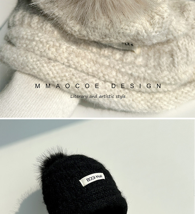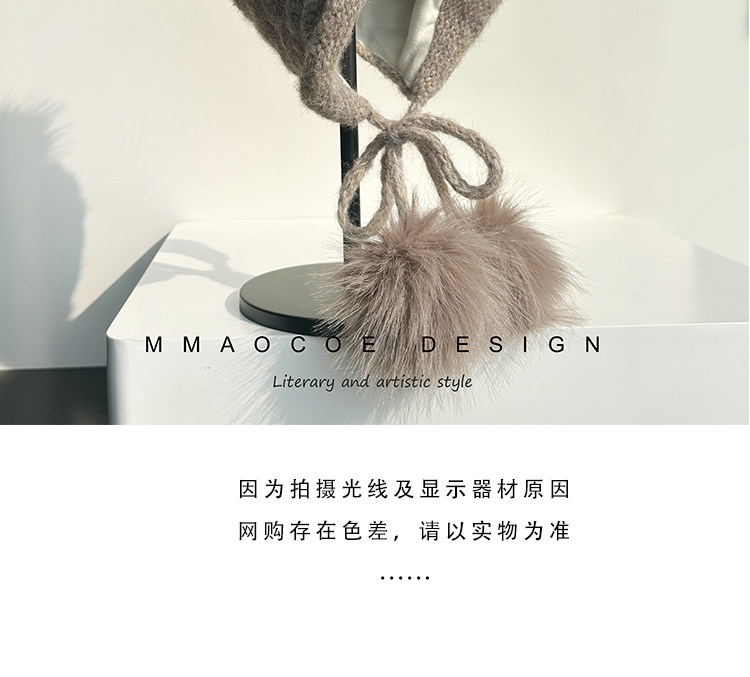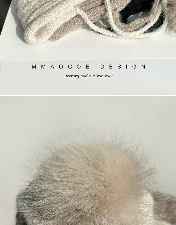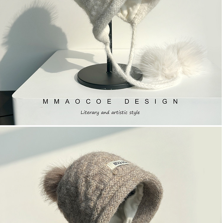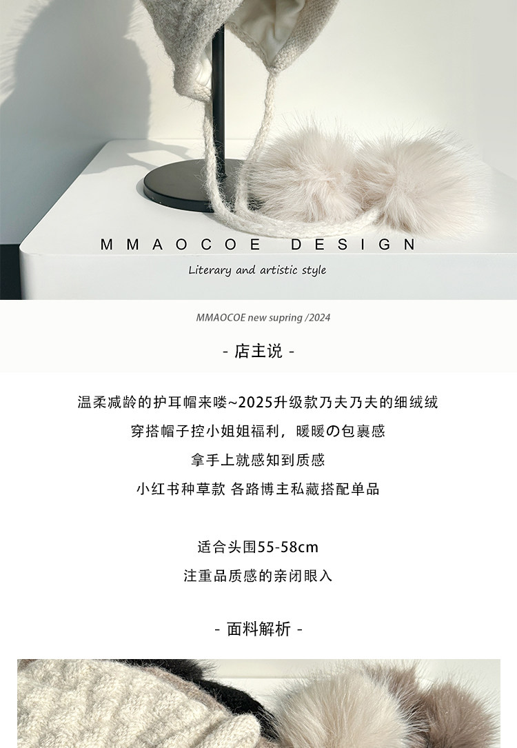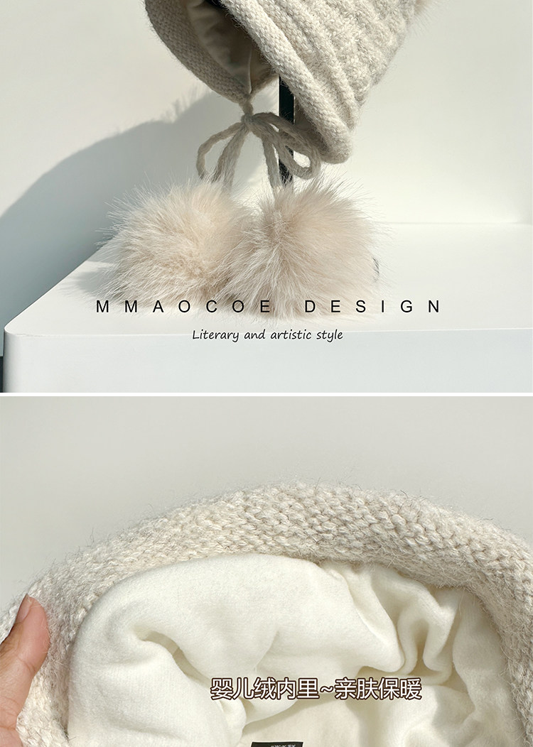 Knitted Pom-Pom Earflap Hat for Women, Winter Fleece-Lined, Warm, Ear-Protecting, Cold-Proof Hat, Northeast Skiing Style, Face-Slimming Hat