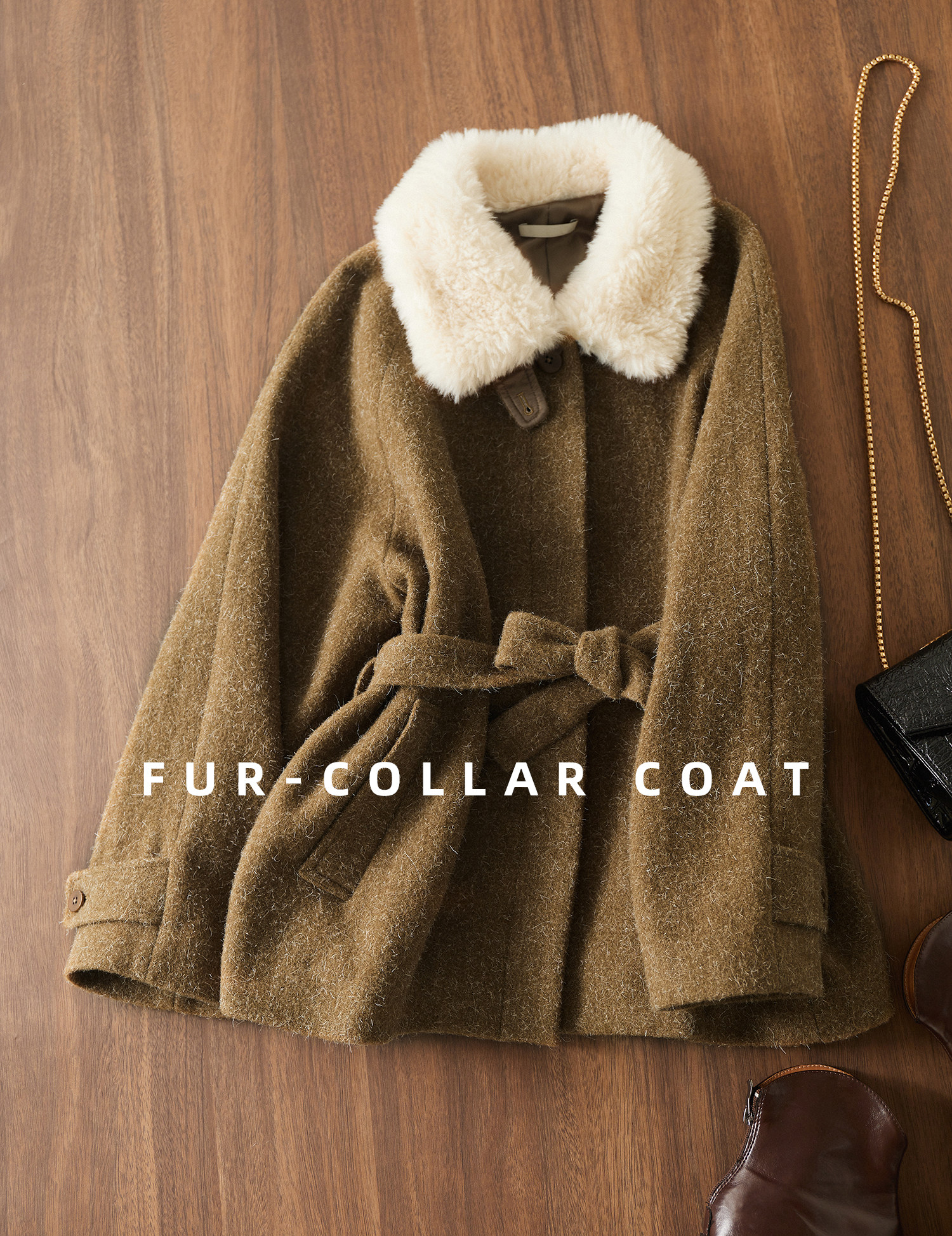 Jianman Winter Warm Velvet Wool Lace Waisted Fur Collar Coat for Women Artistic Style Special Furry Coat
