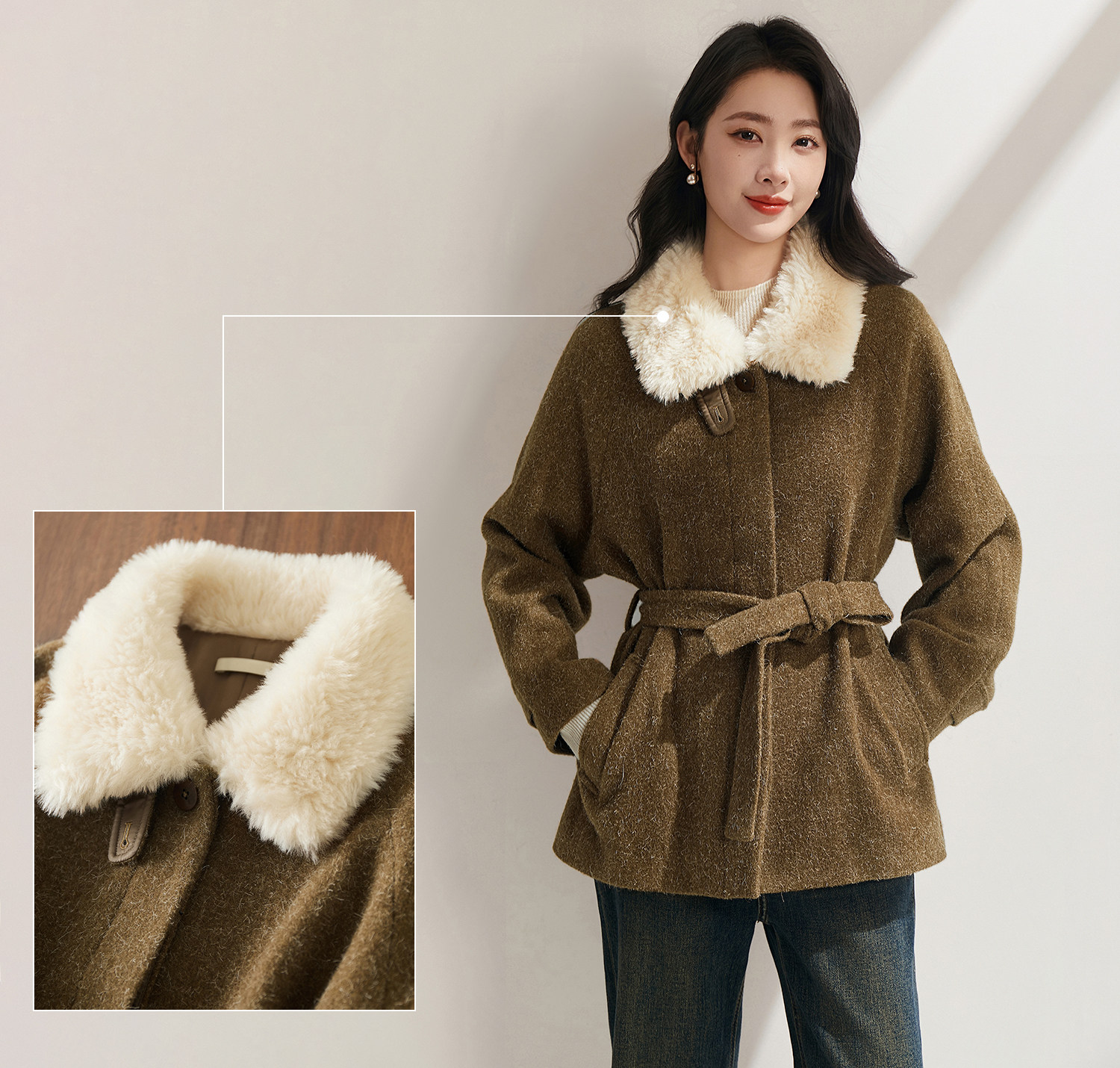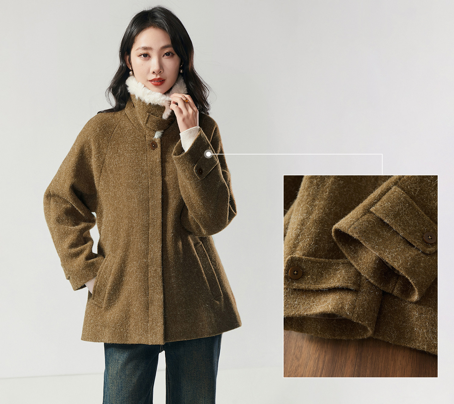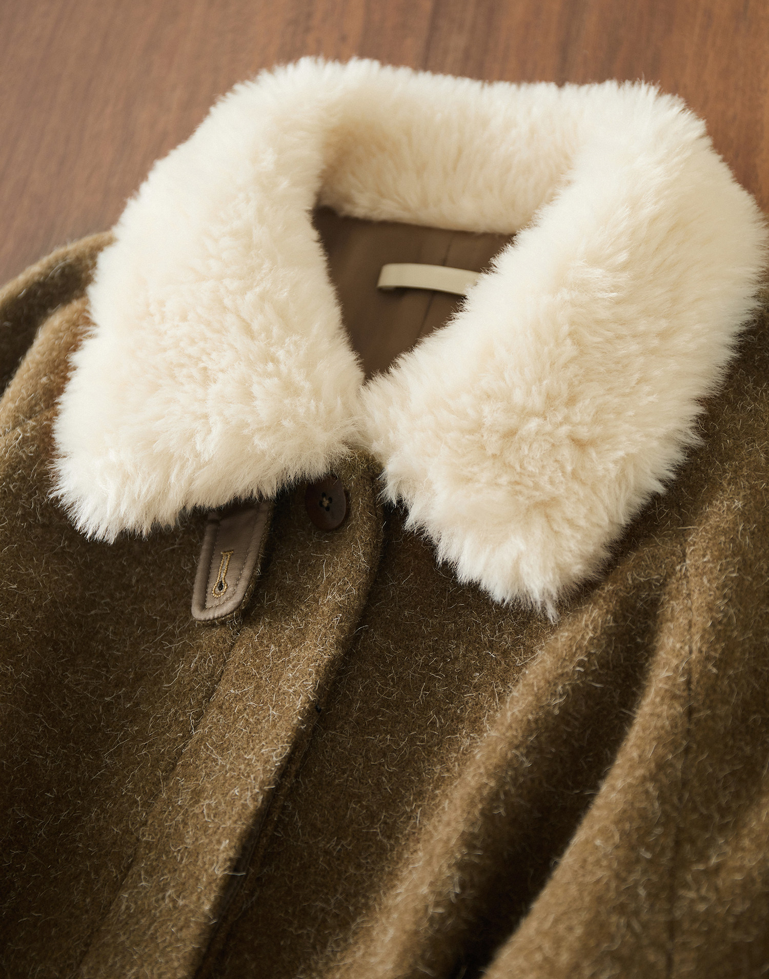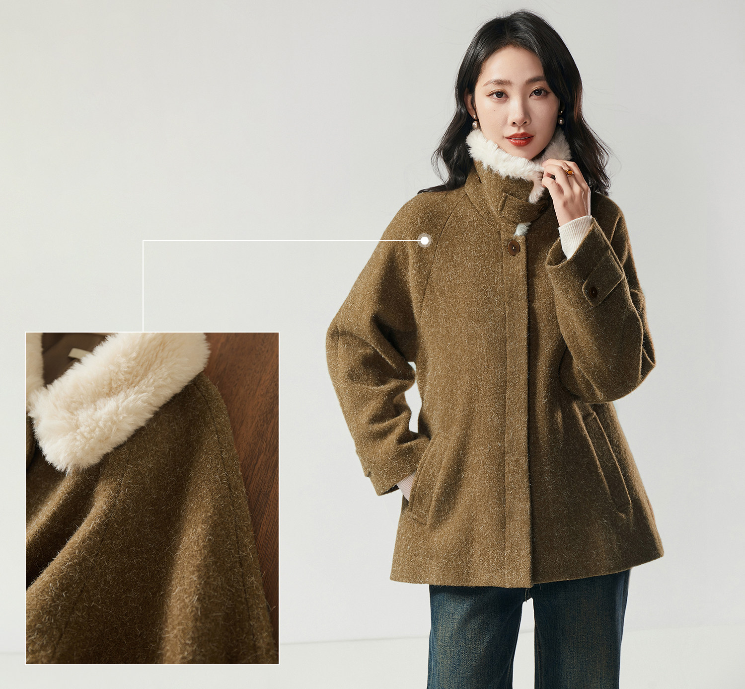 米白色毛领与大身的绿咖色调相碰撞