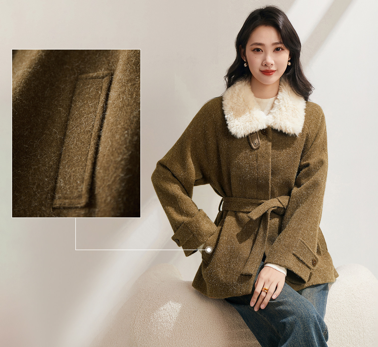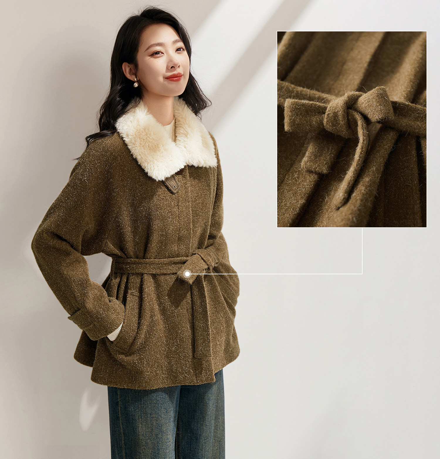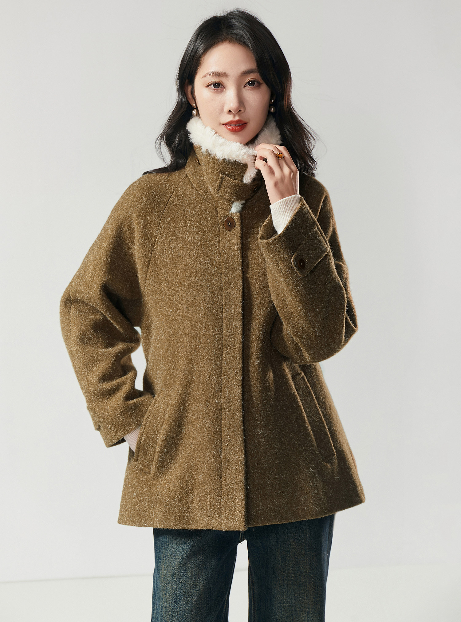 米白色毛领与大身的绿咖色调相碰撞