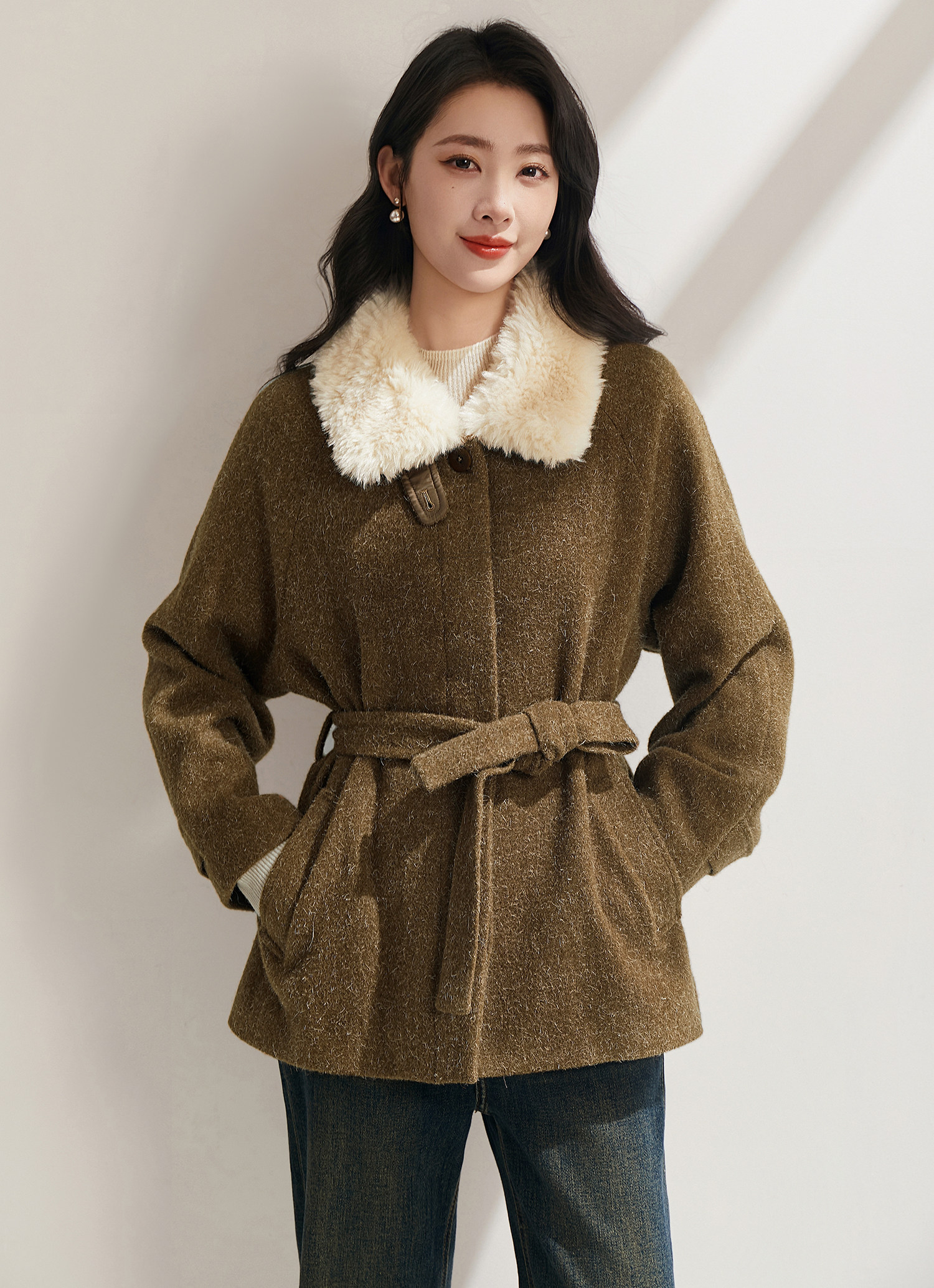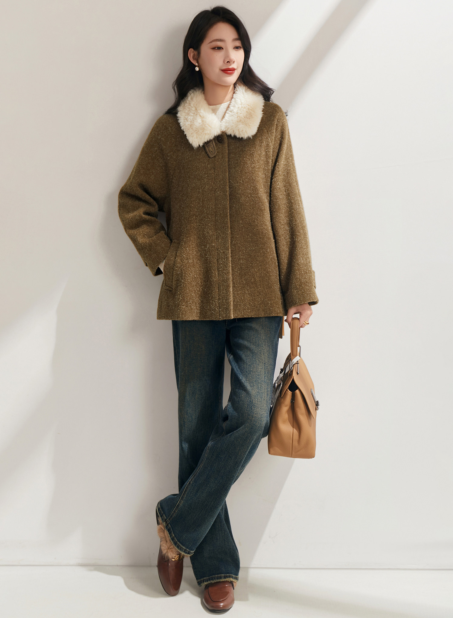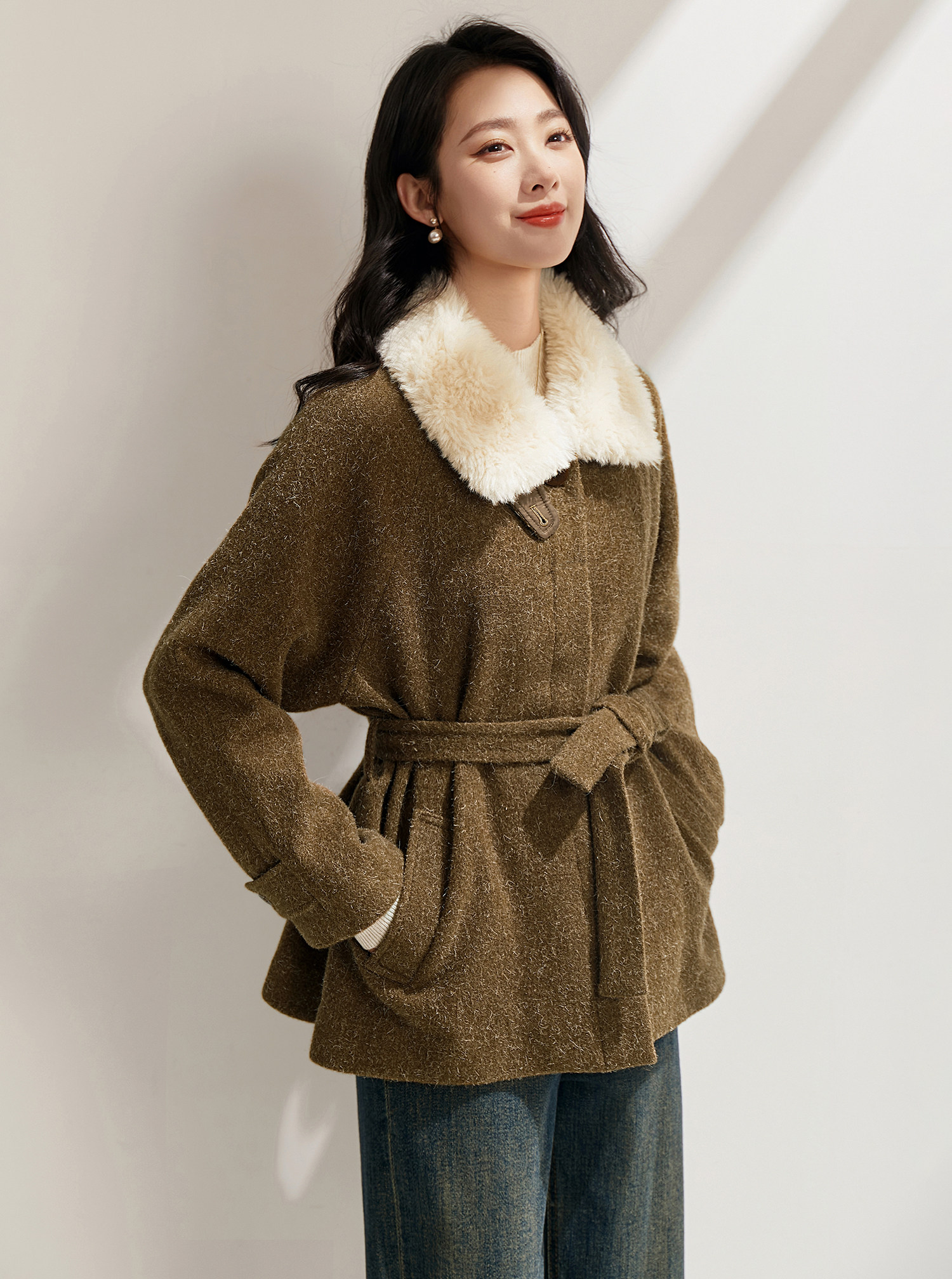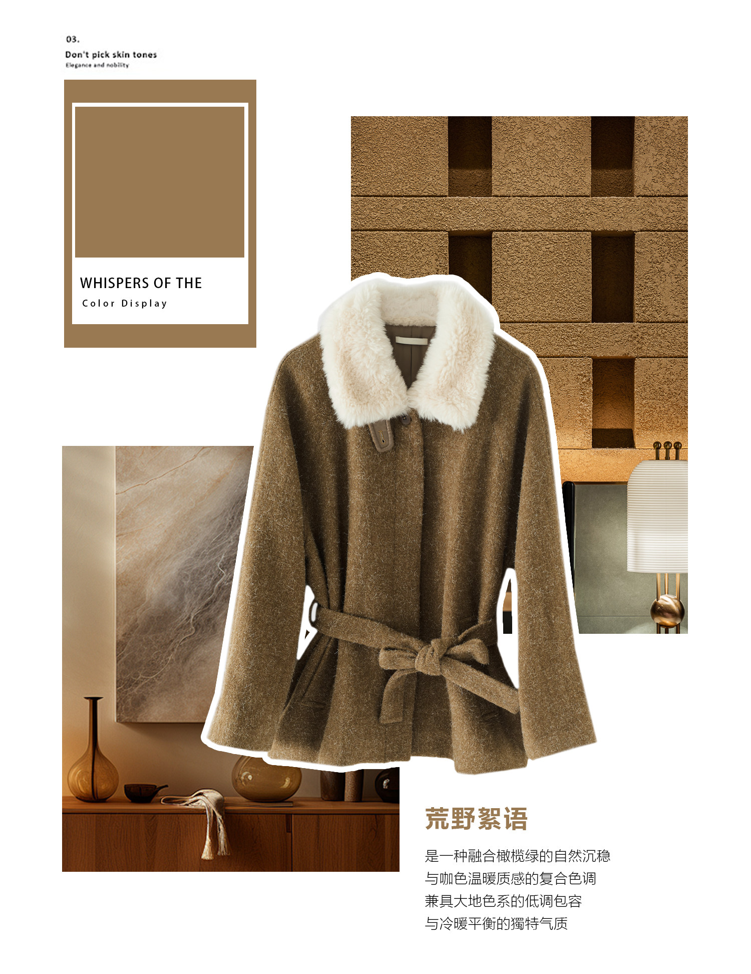米白色毛领与大身的绿咖色调相碰撞