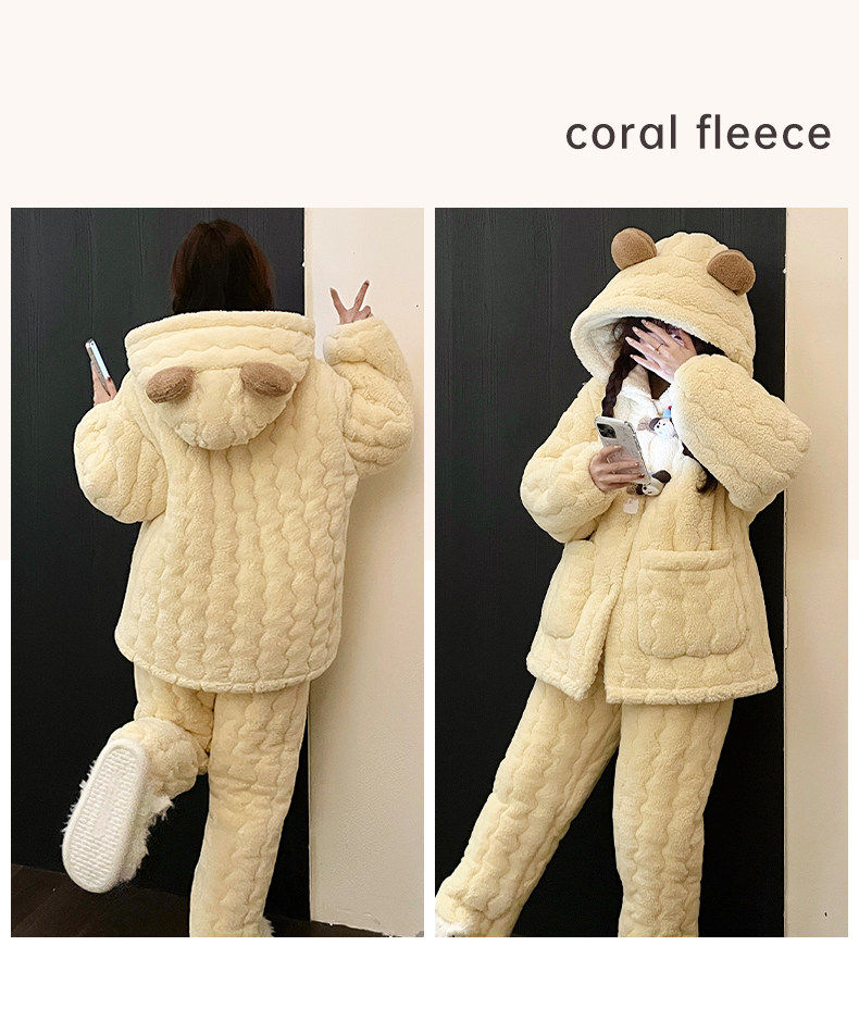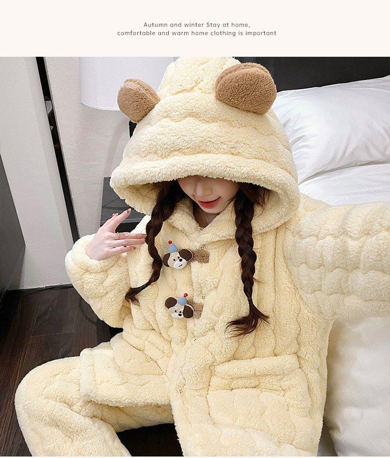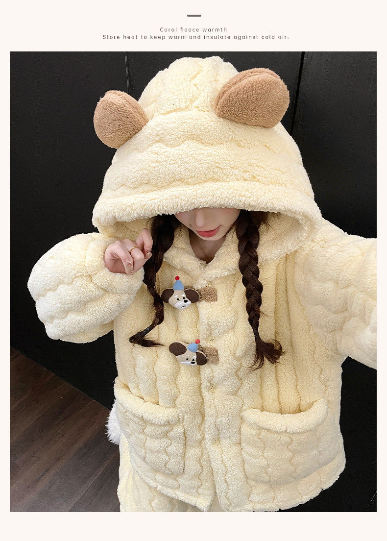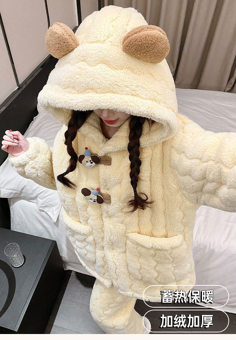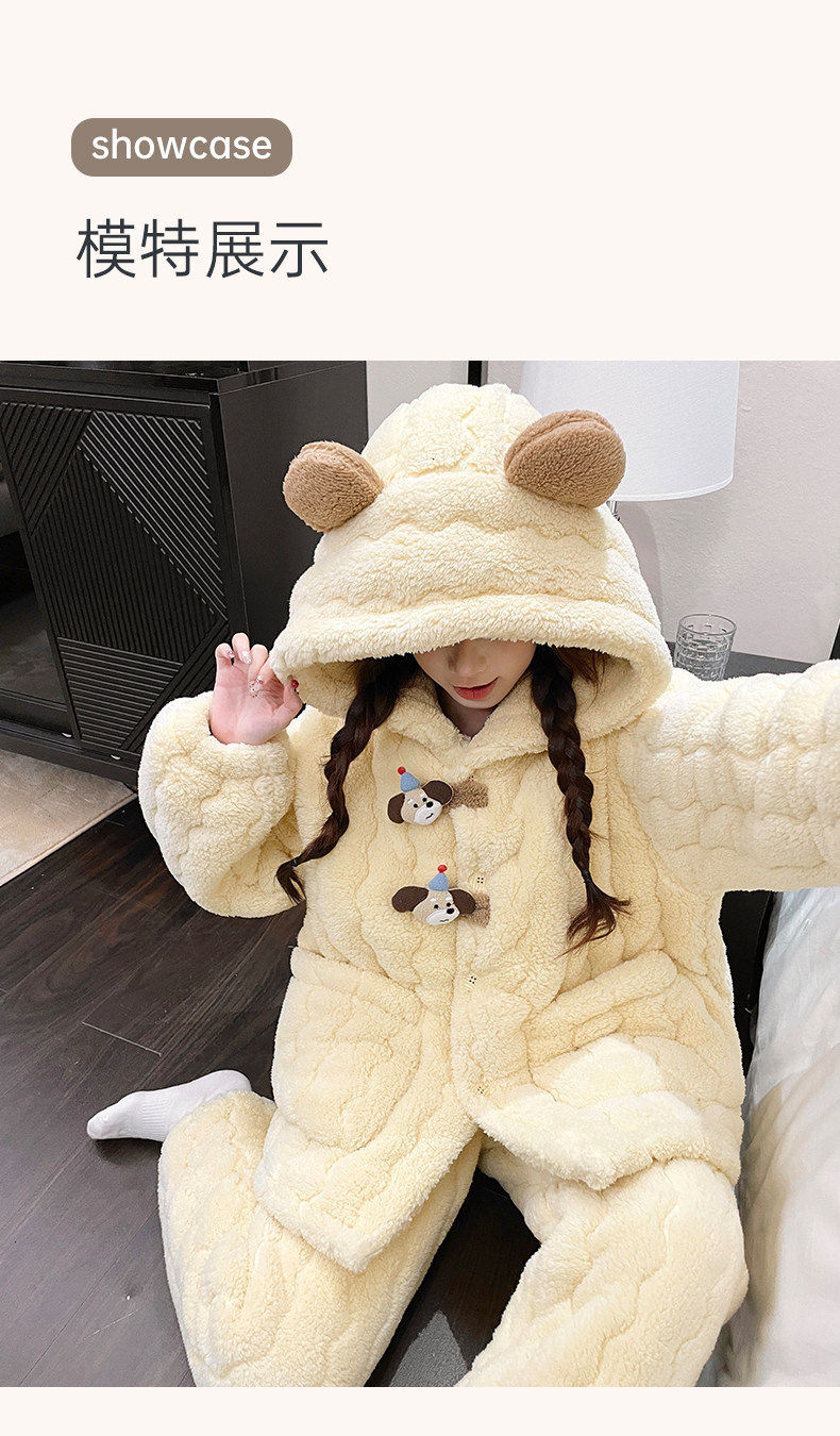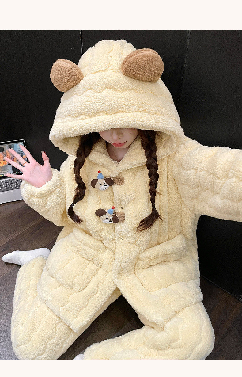 2025 New Style Puppy Hooded Coral Fleece Pajamas for Women, Autumn and Winter, Three-Layer Quilted Thickened Flannel Loungewear