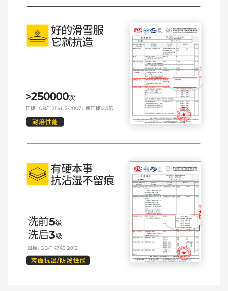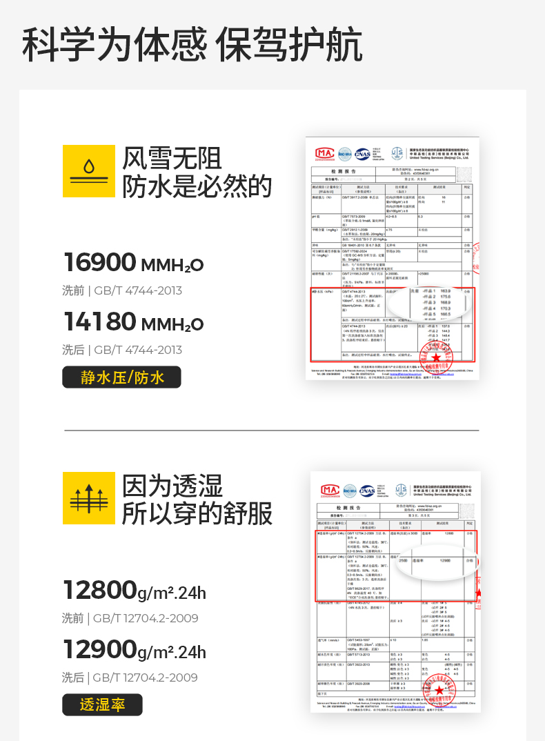 Waterproof Surface Moisture Resistance: ≥4-5 Levels before Washing, ≥3-4 Levels after Washing,Hydrostatic Pressure: before Washing - Fabric ≥ 50Kpa, Fabric Seams ≥ 40Kpa after Washing - Fabric ≥ 40Kpa, Fabric Seams ≥ 30Kpa