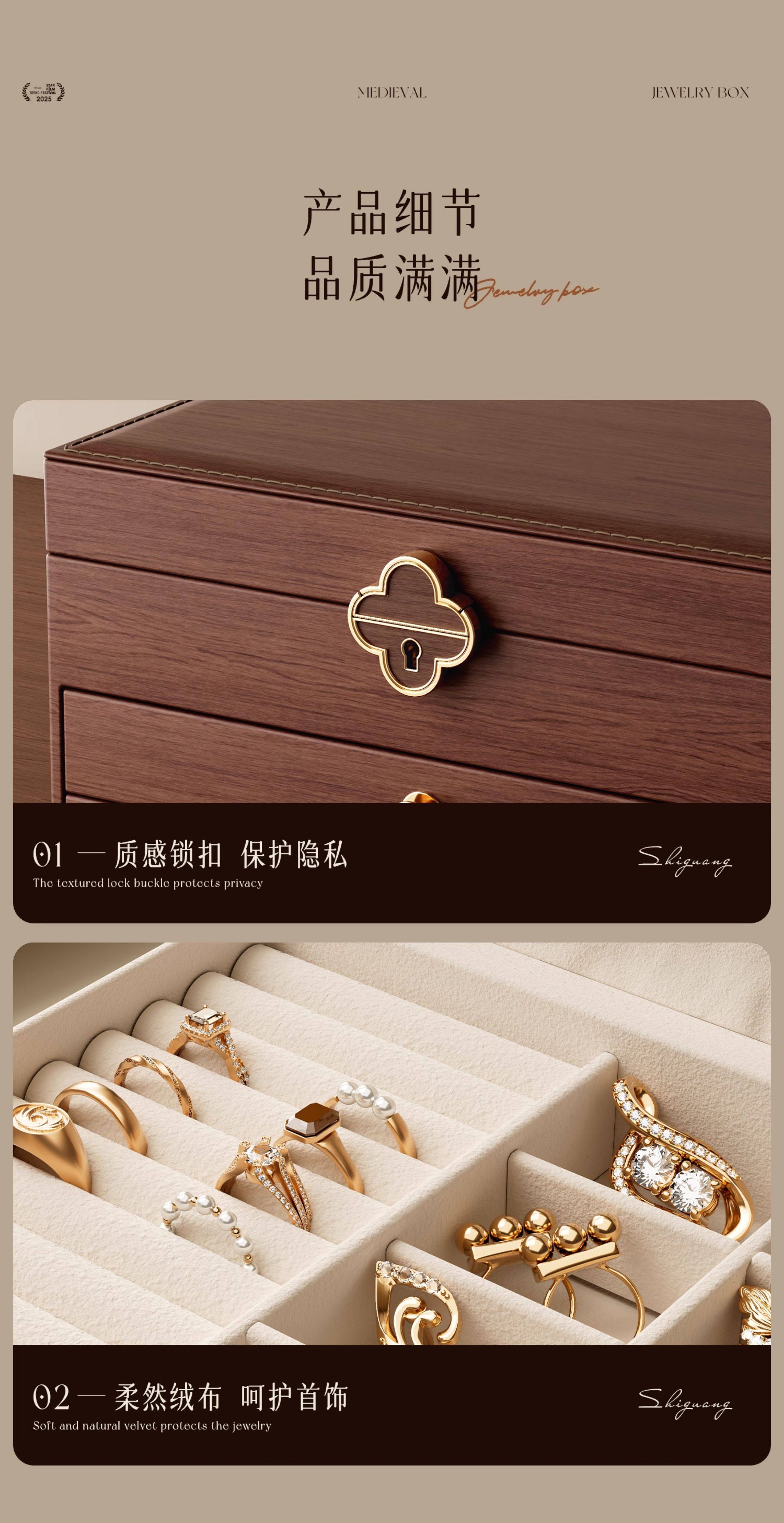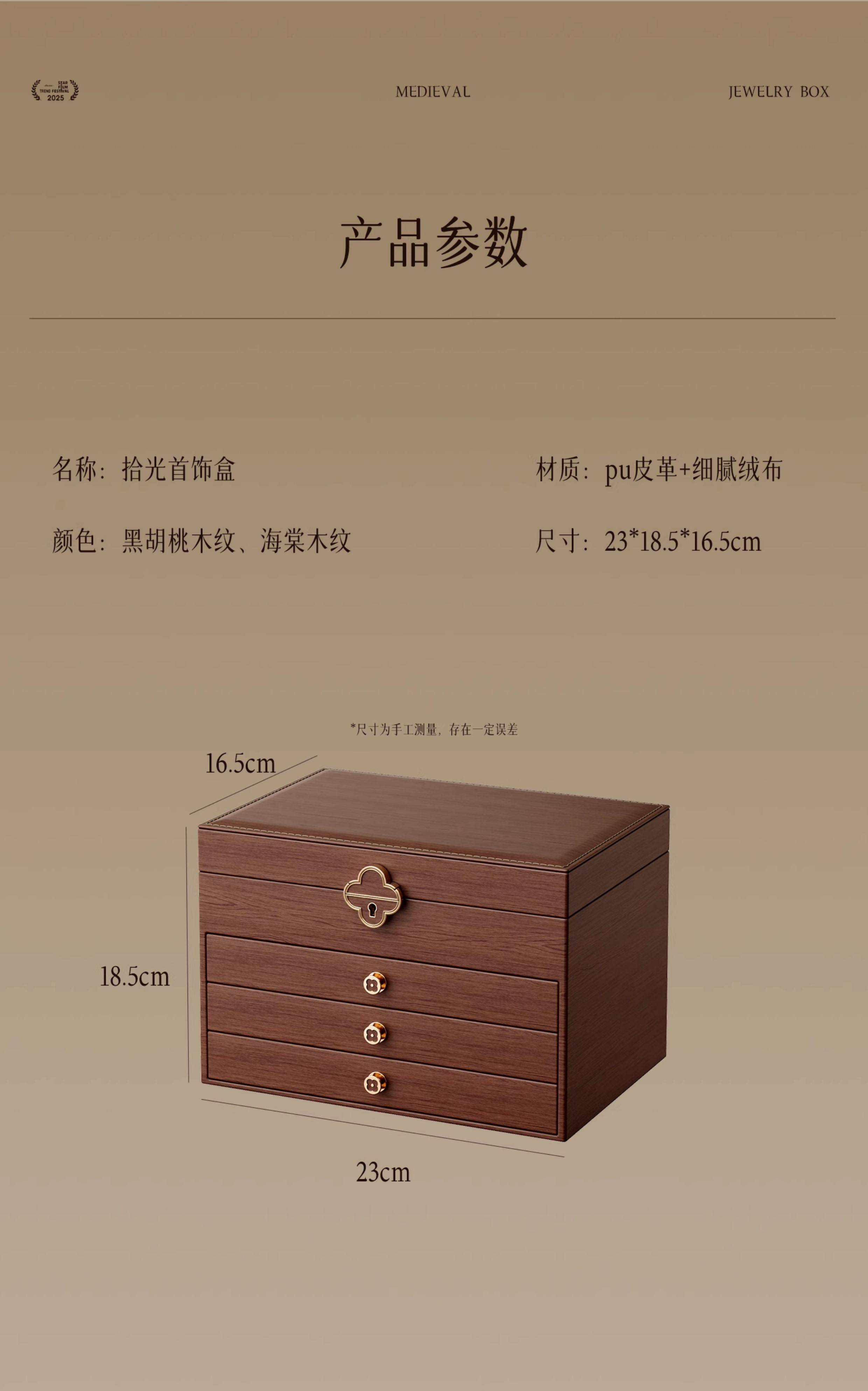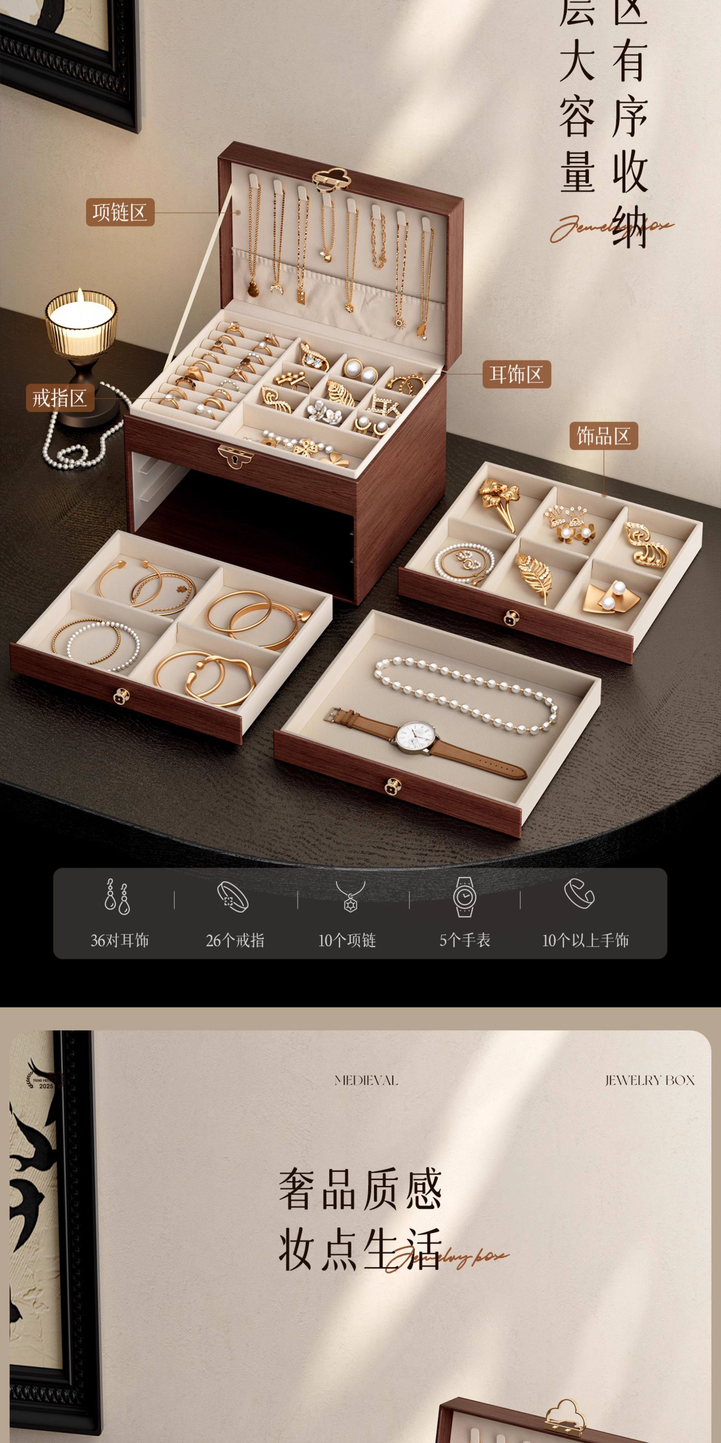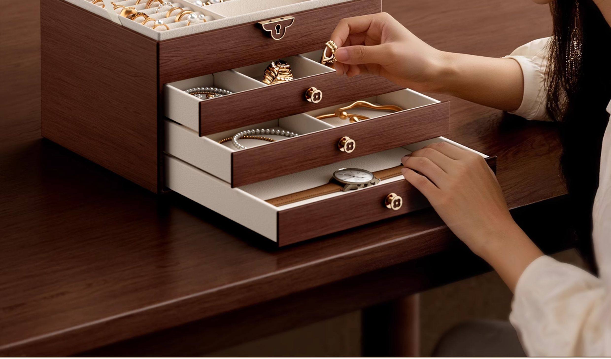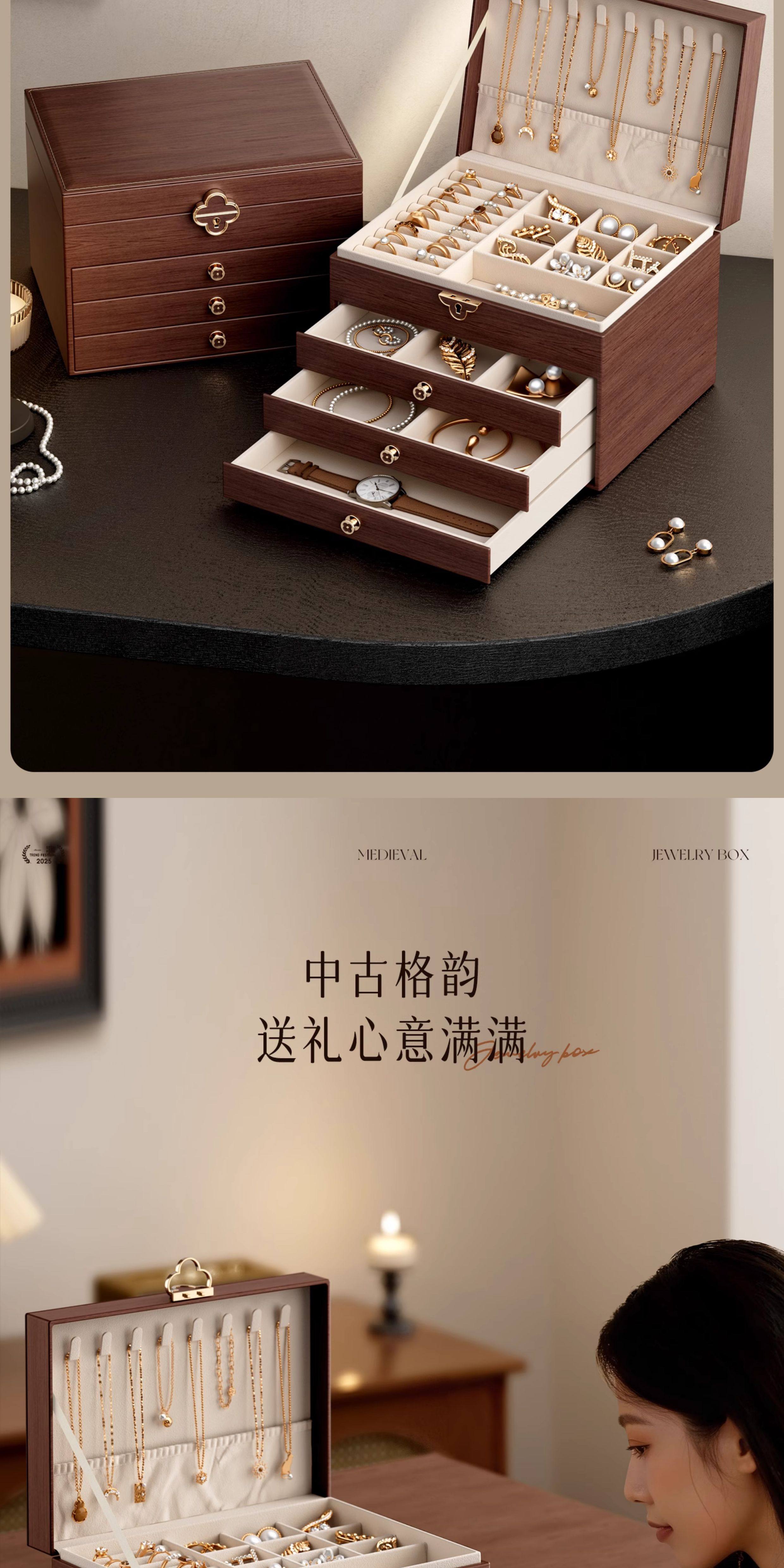 Jewelry Box with Walnut Wood Grain, High-End Exquisite Jewelry, Gold Earrings, Necklaces, Large Capacity, Anti-Oxidation, Vintage Storage Box