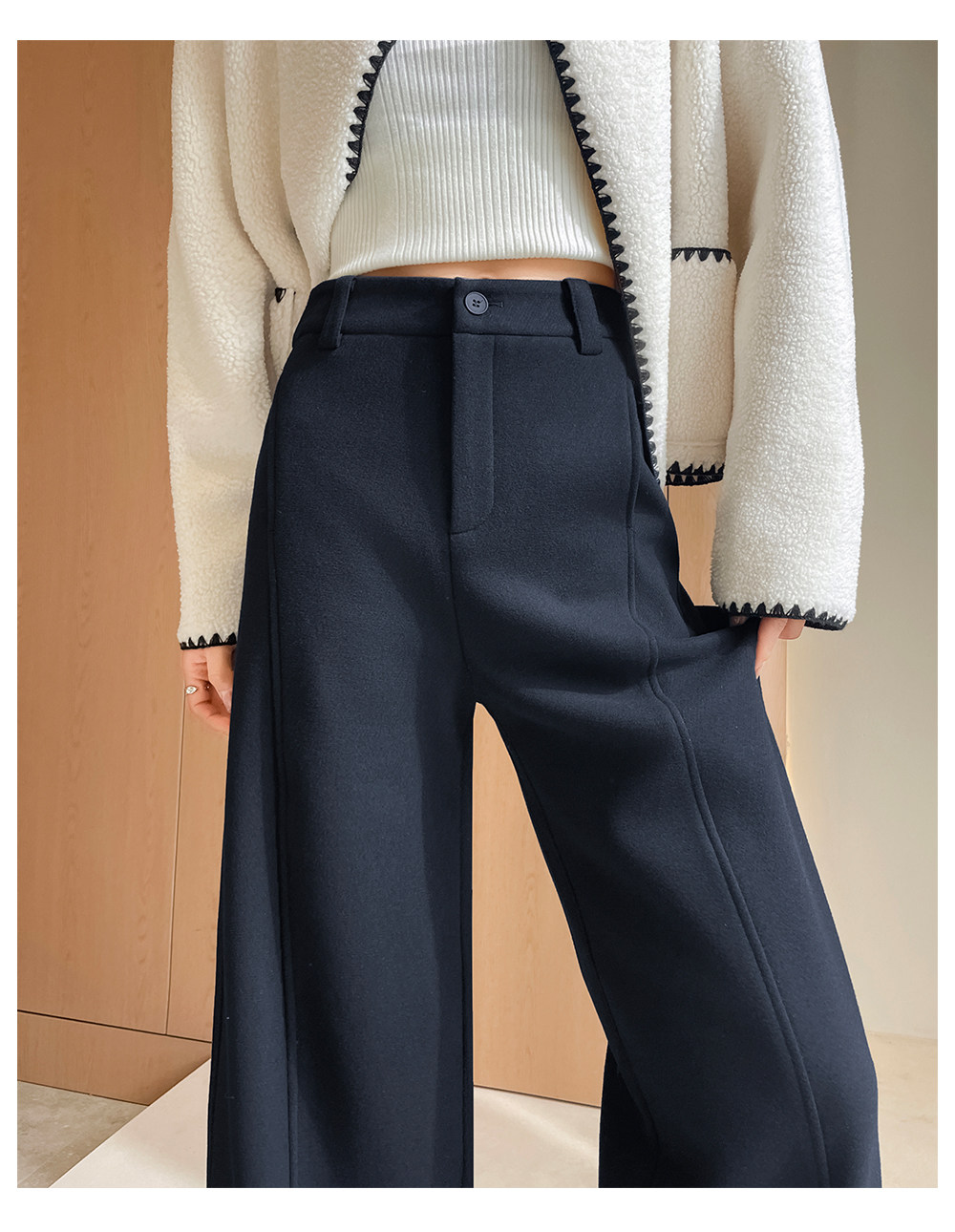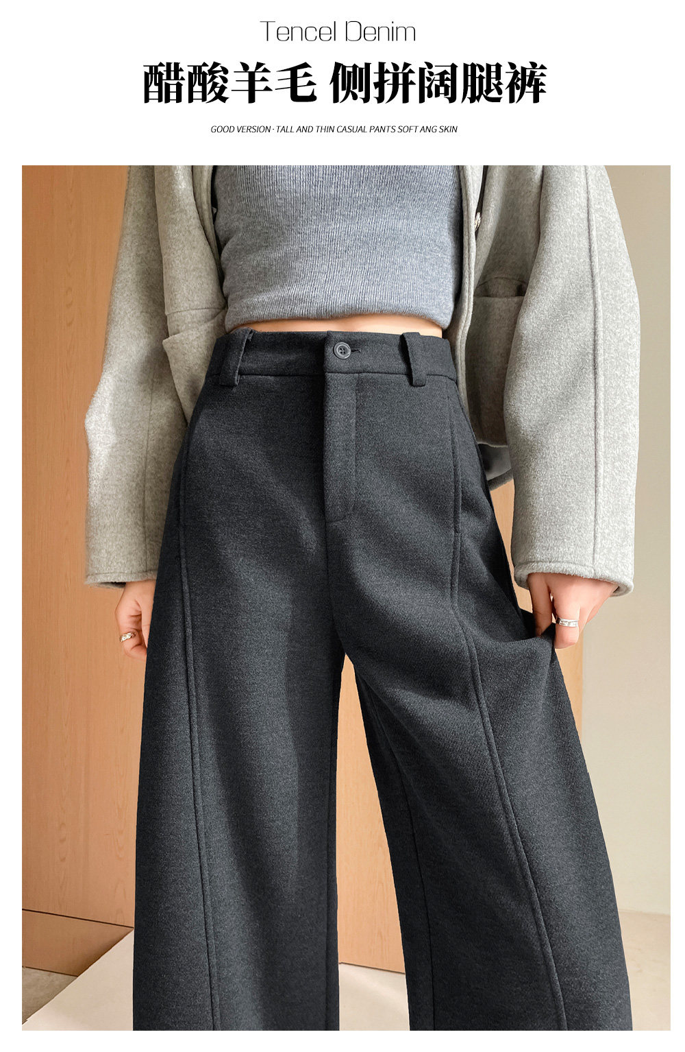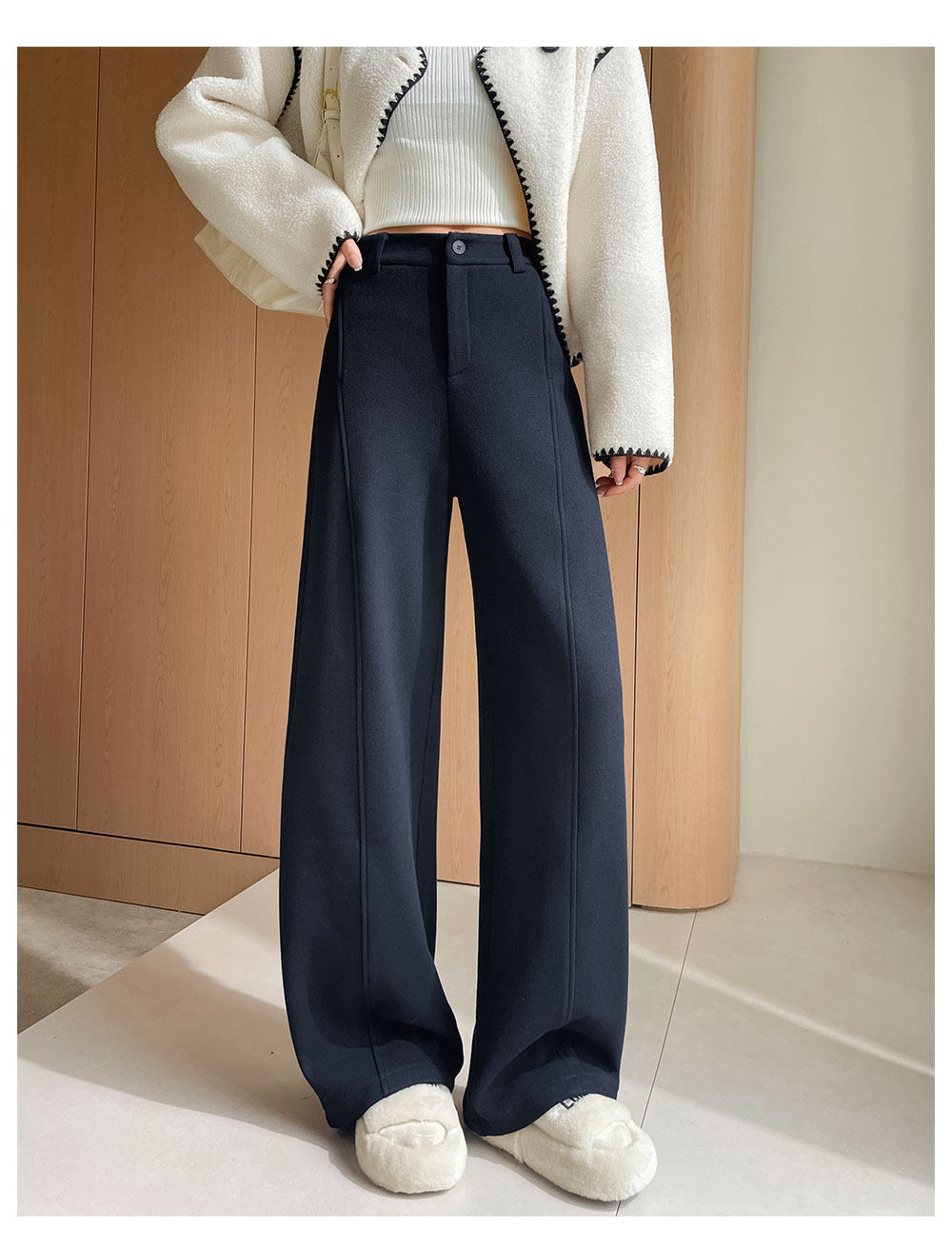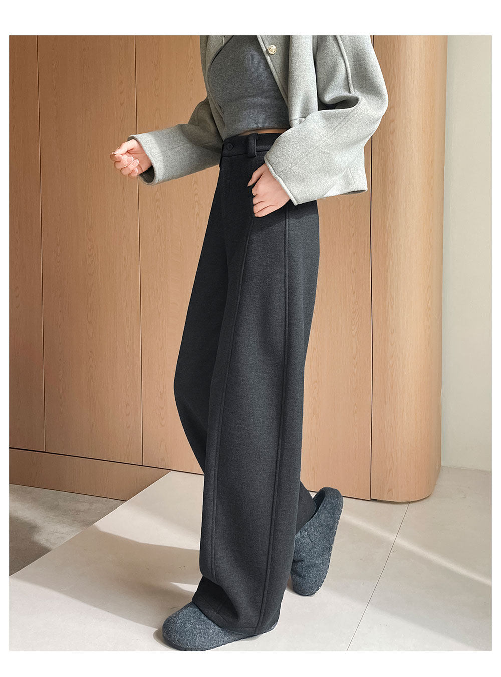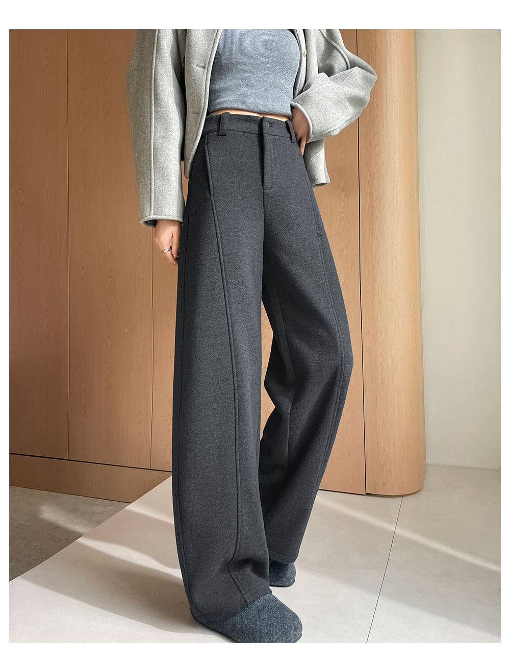 Gray Wool Suit Wide-Leg Pants for Women, Autumn and Winter, Fleece-Lined, Thickened, Slim-Fit, Twill Straight-Leg, Soft Woolen Knife-Cut Pants