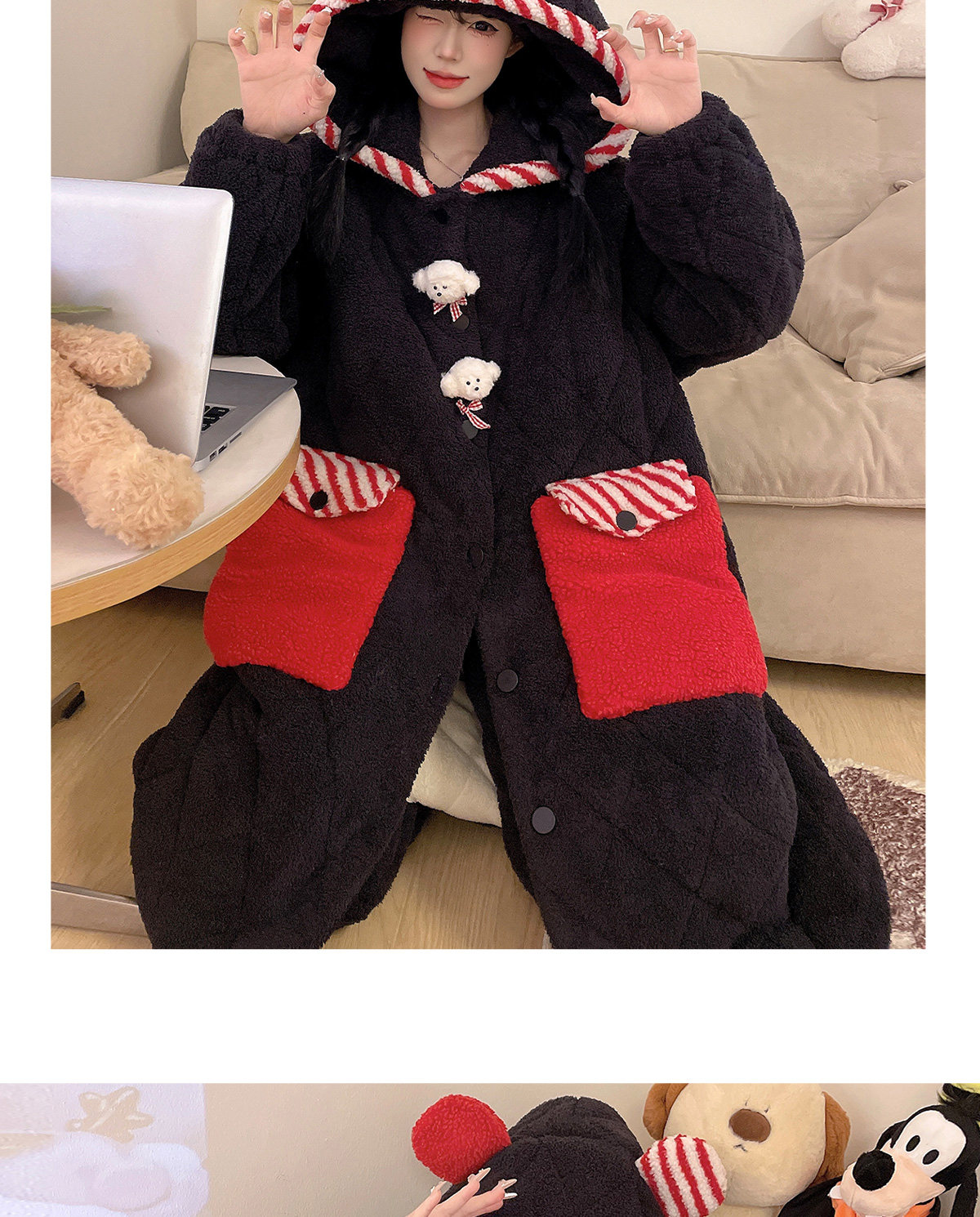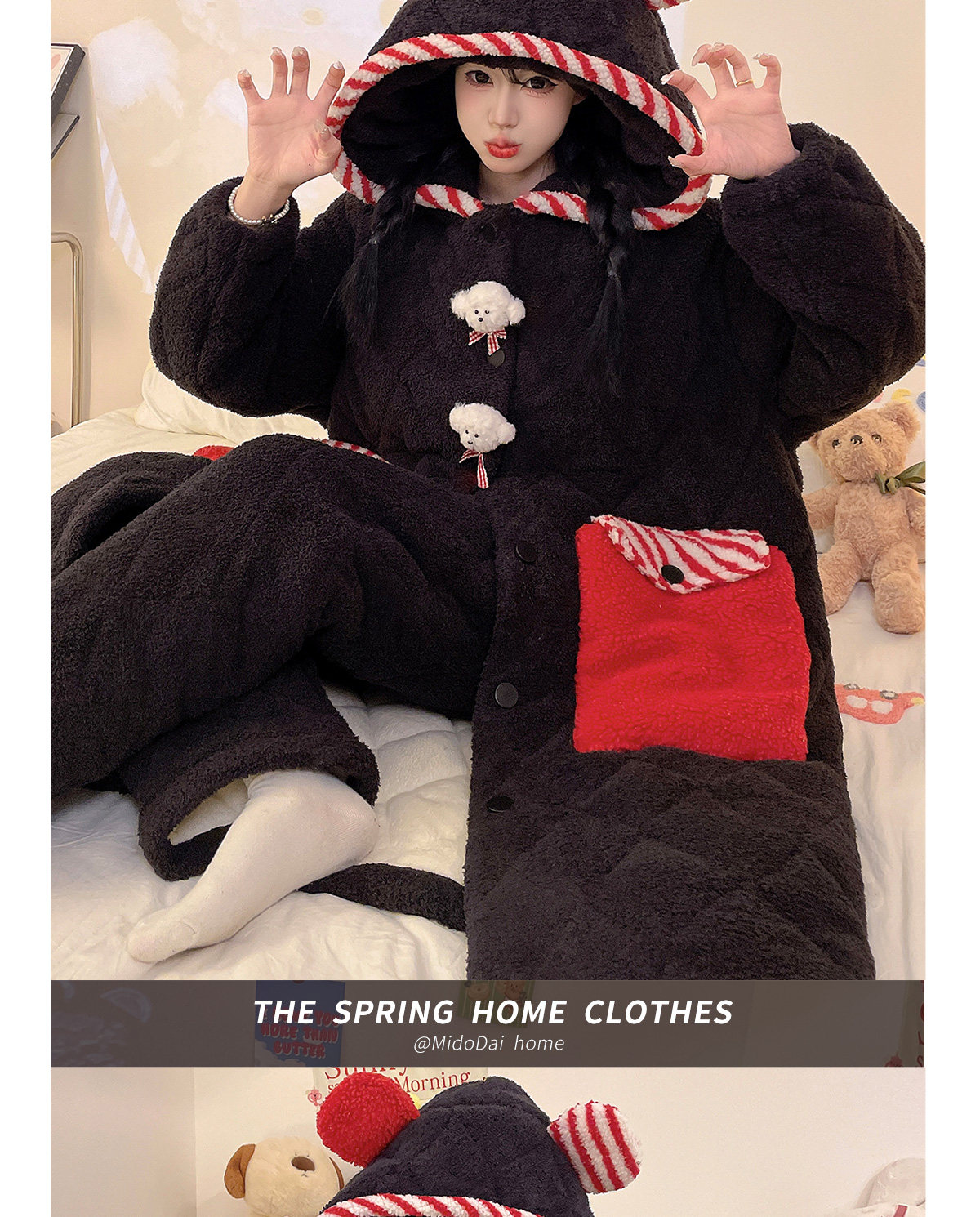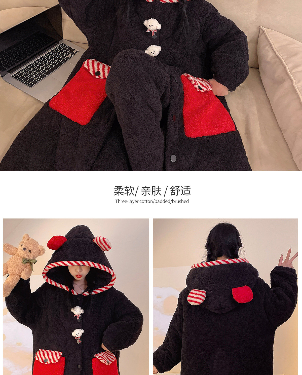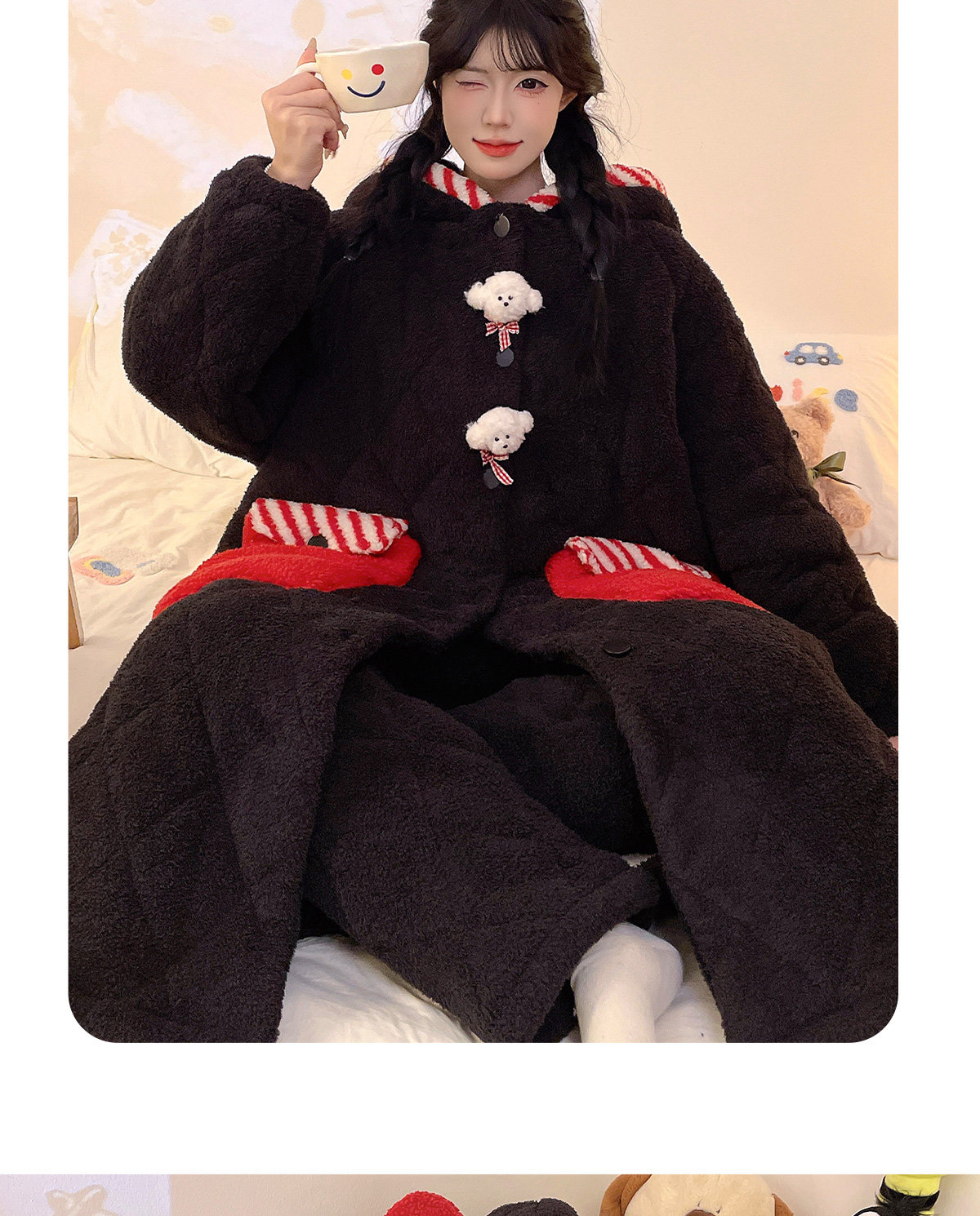 Autumn and Winter Three-Layer Quilted Cotton Women's Nightgown, Cute Puppy Half-Velvet Pajamas, Thickened and Fleece-Lined, Adorable Set, Loungewear