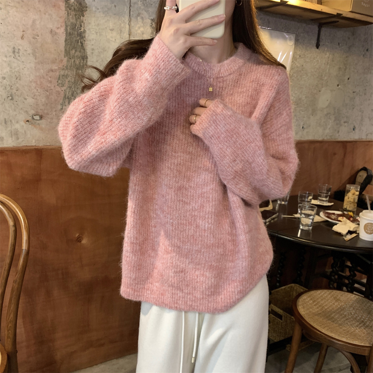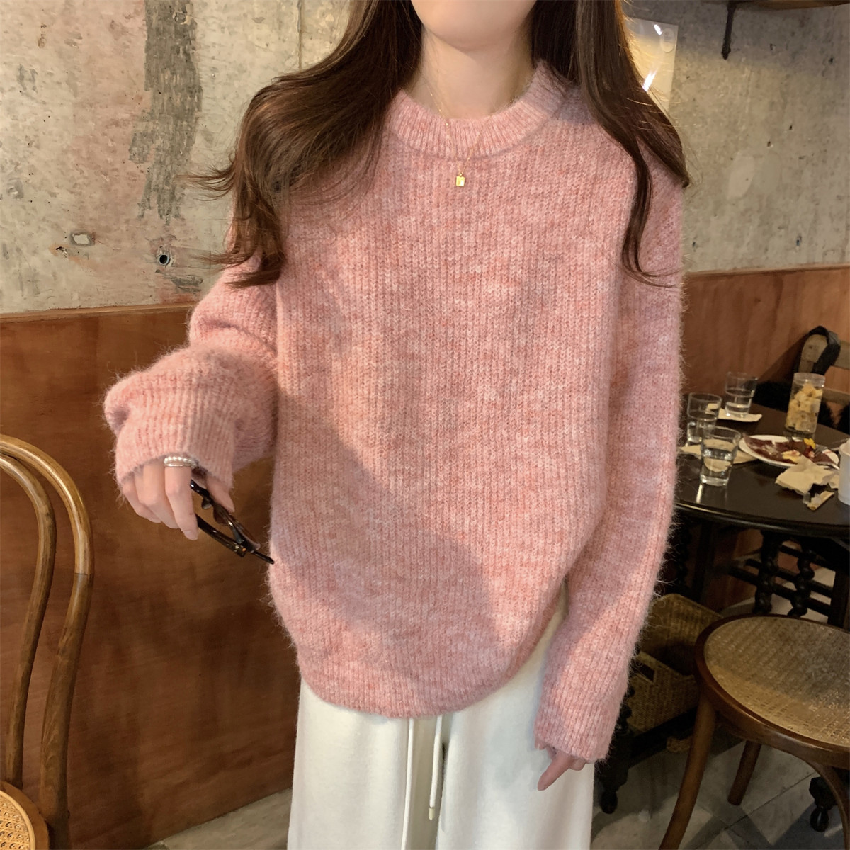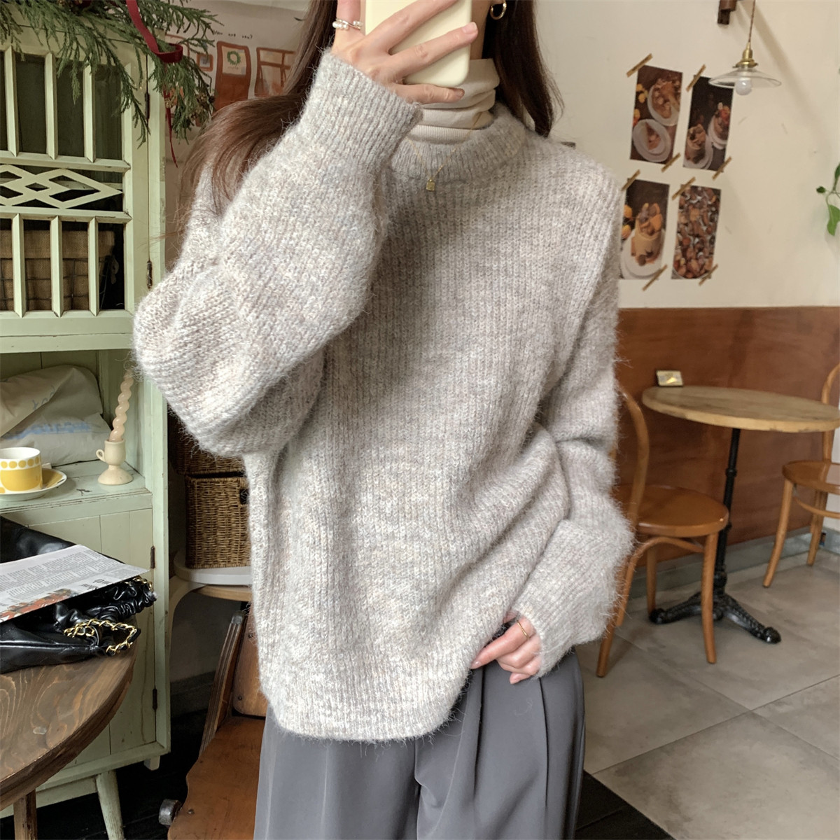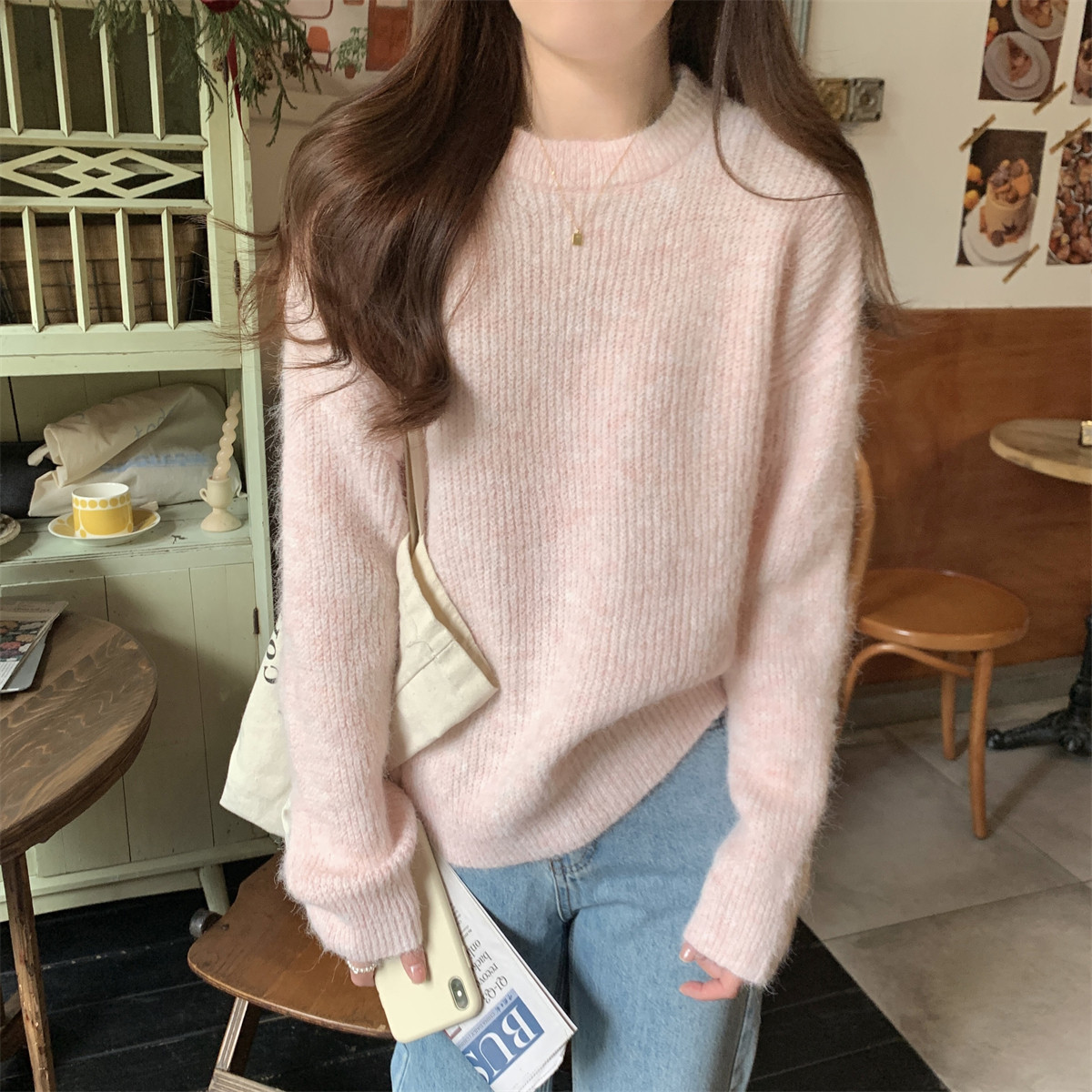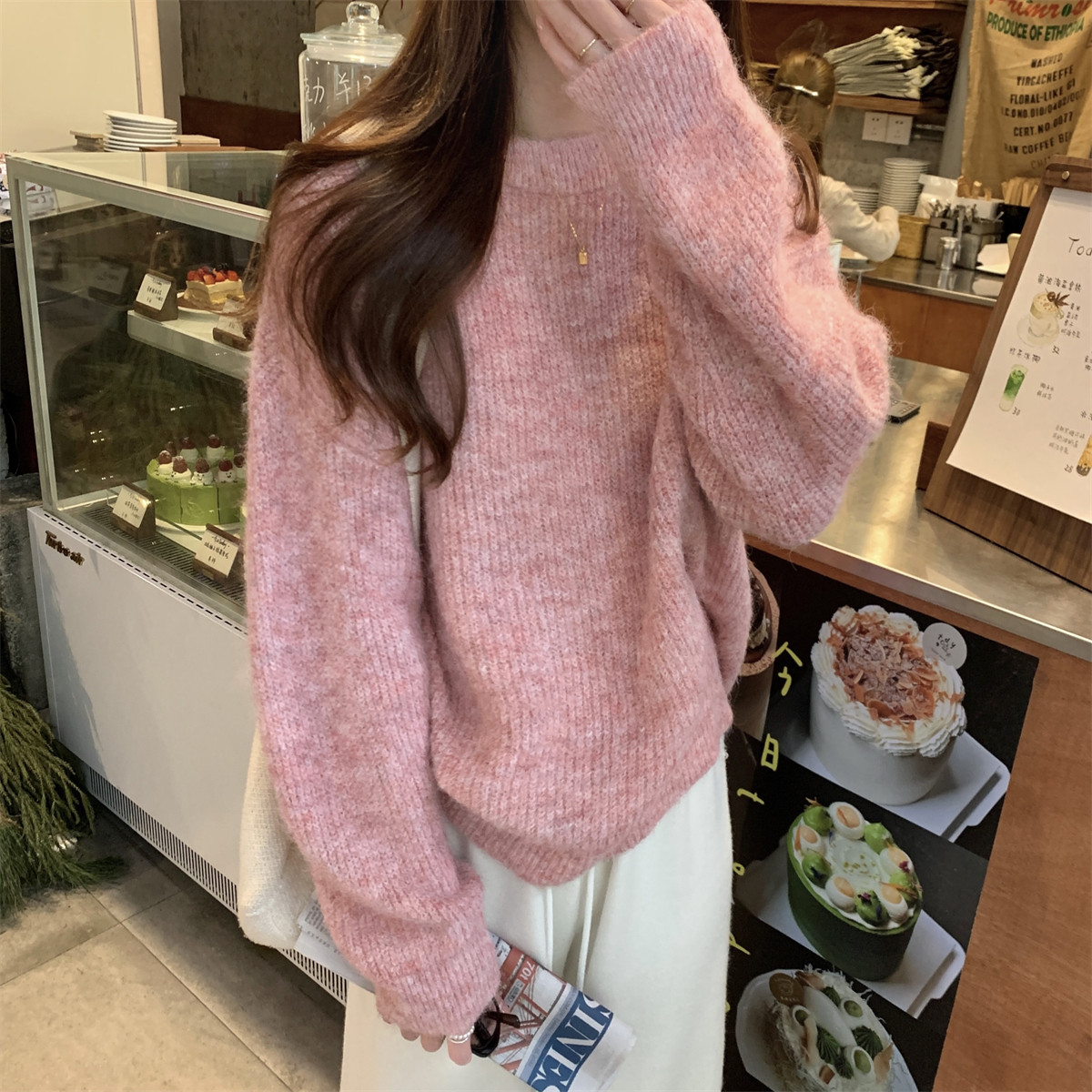 Suseyiku Autumn and Winter Korean Style Lazy Soft Round Neck Loose Variegated Mohair Knit Sweater for Women