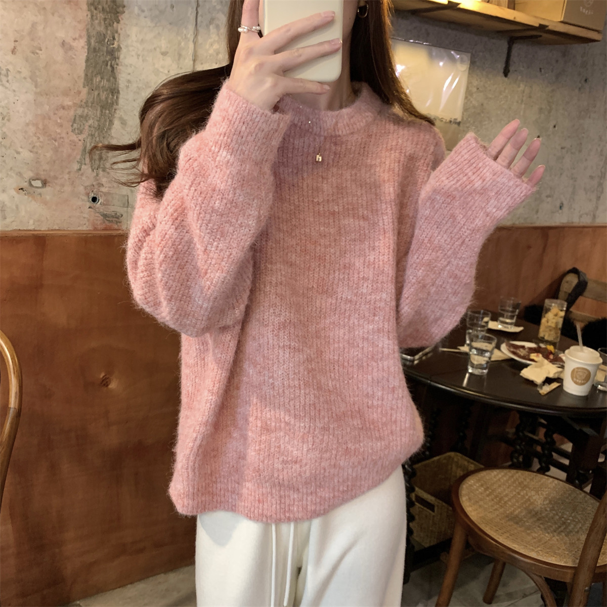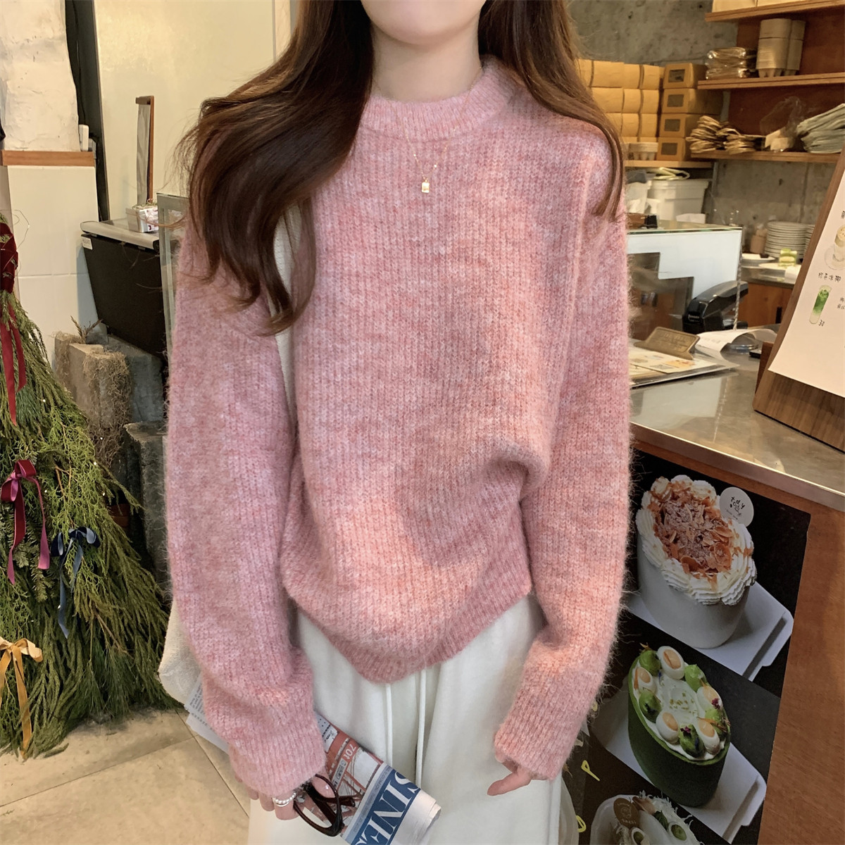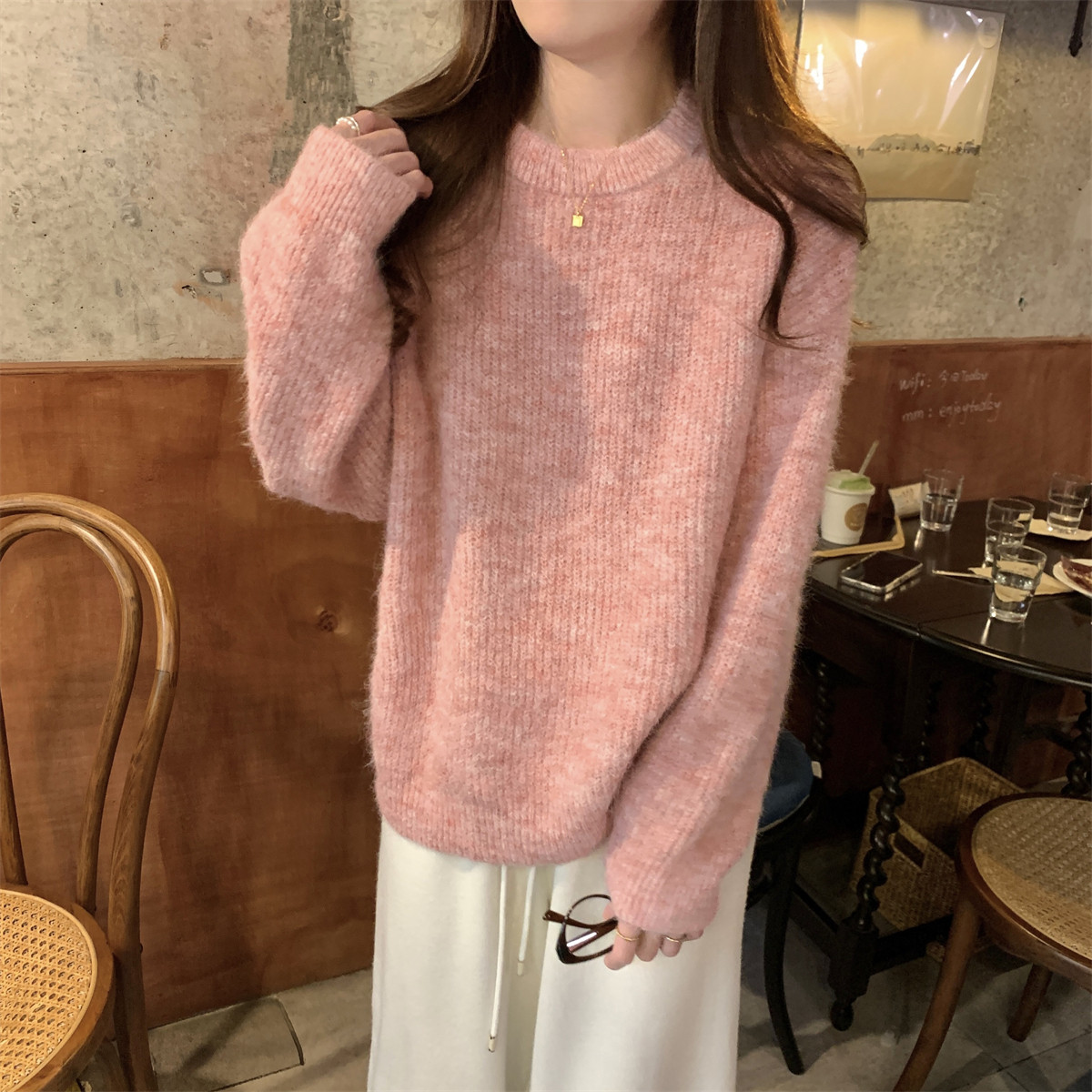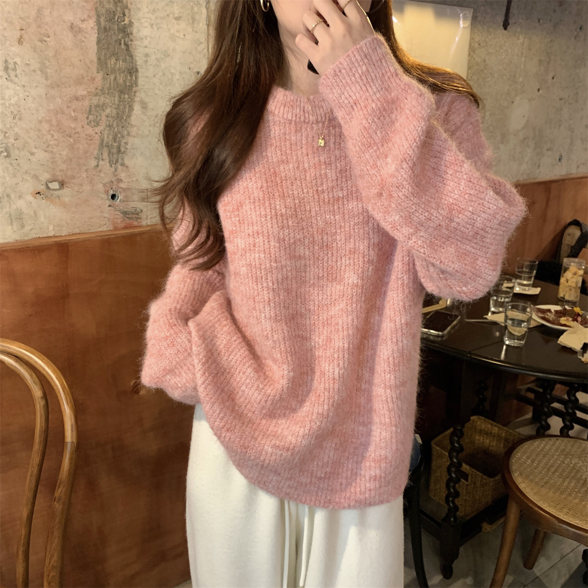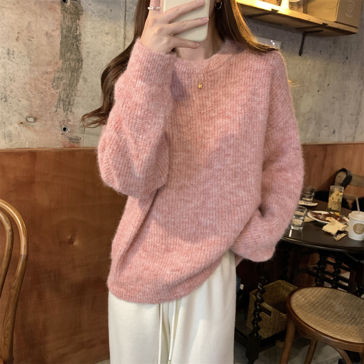 Suseyiku Autumn and Winter Korean Style Lazy Soft Round Neck Loose Variegated Mohair Knit Sweater for Women