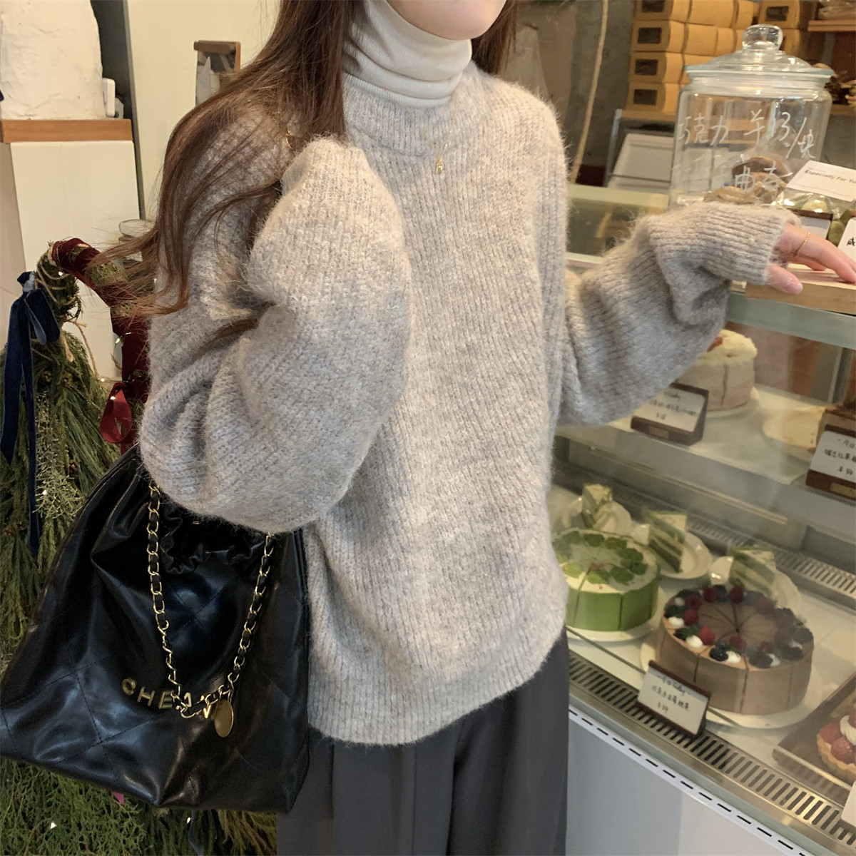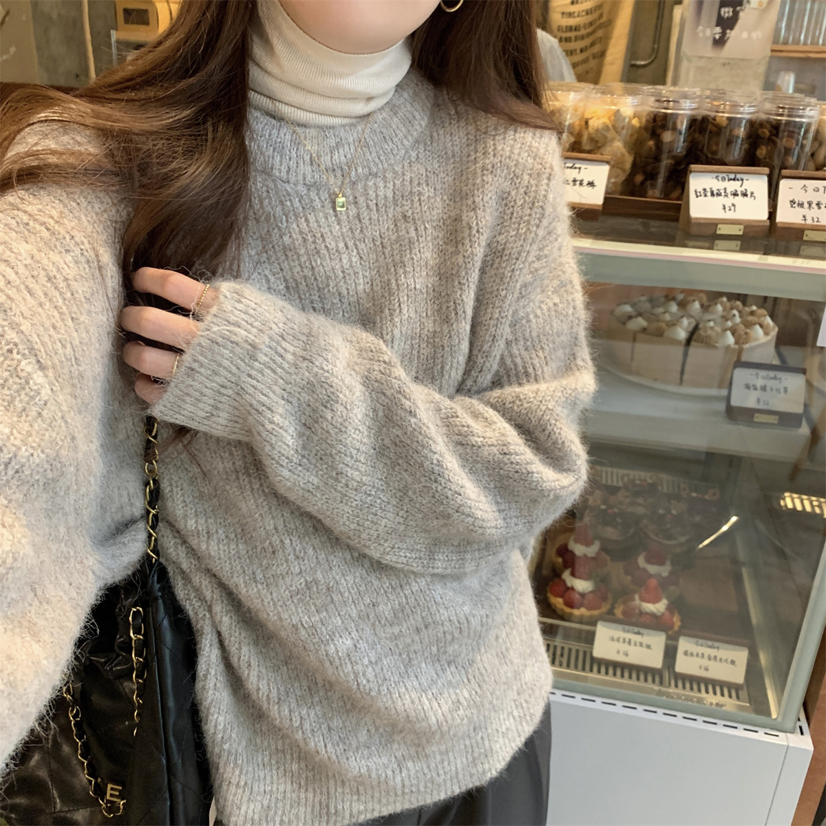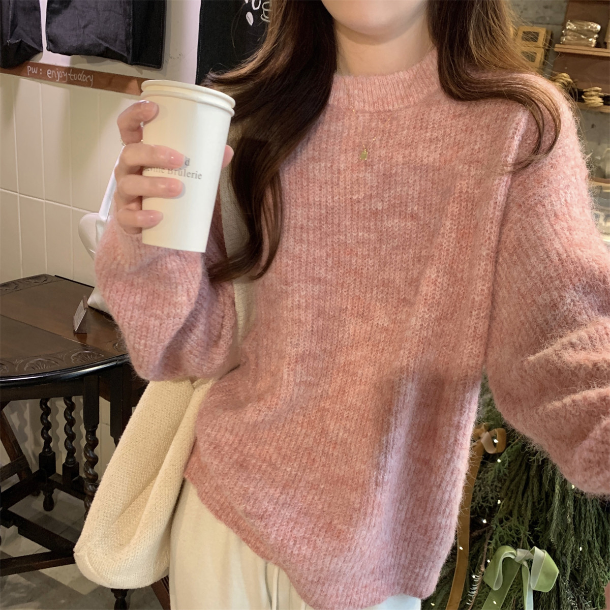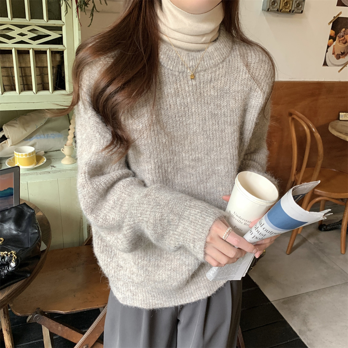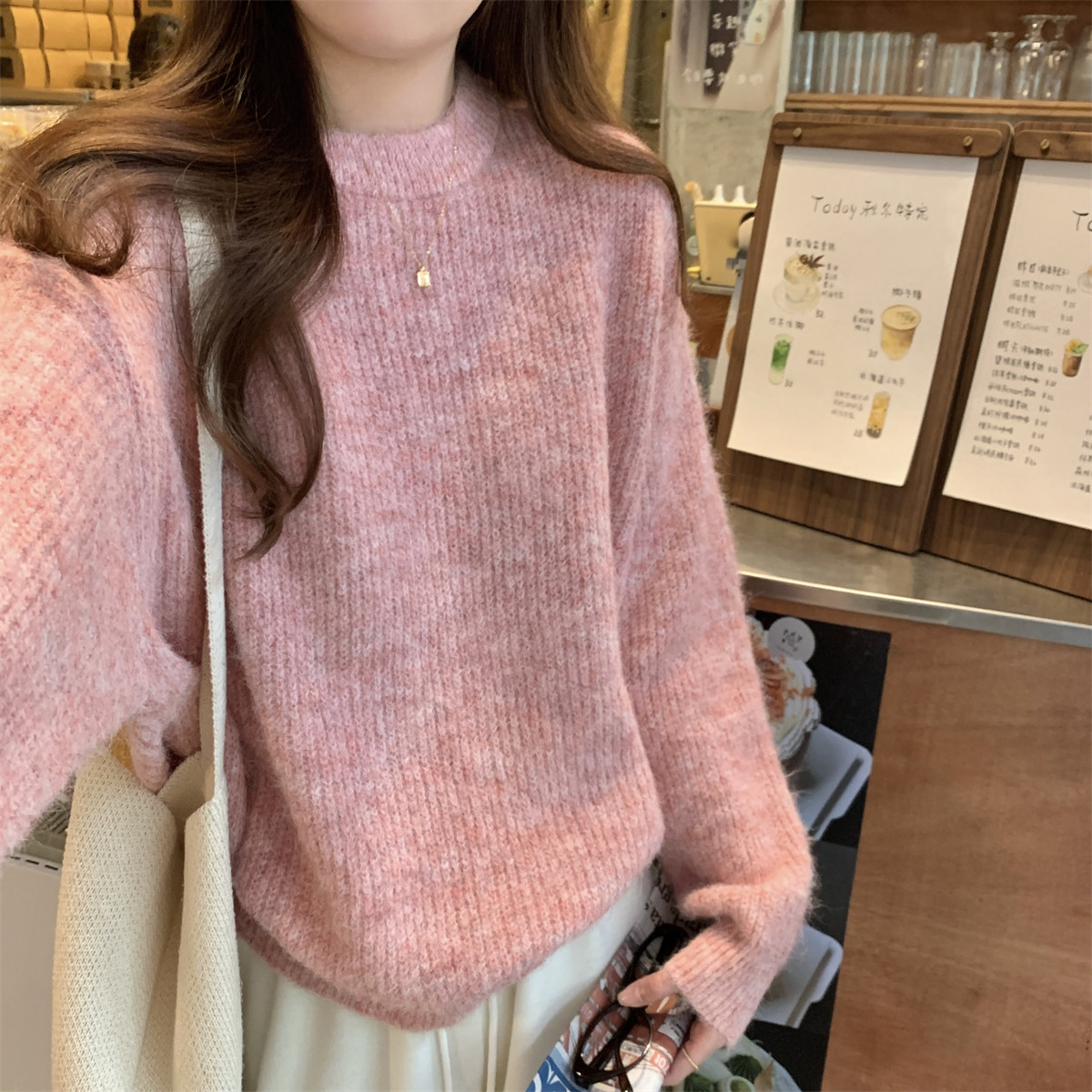 Suseyiku Autumn and Winter Korean Style Lazy Soft Round Neck Loose Variegated Mohair Knit Sweater for Women