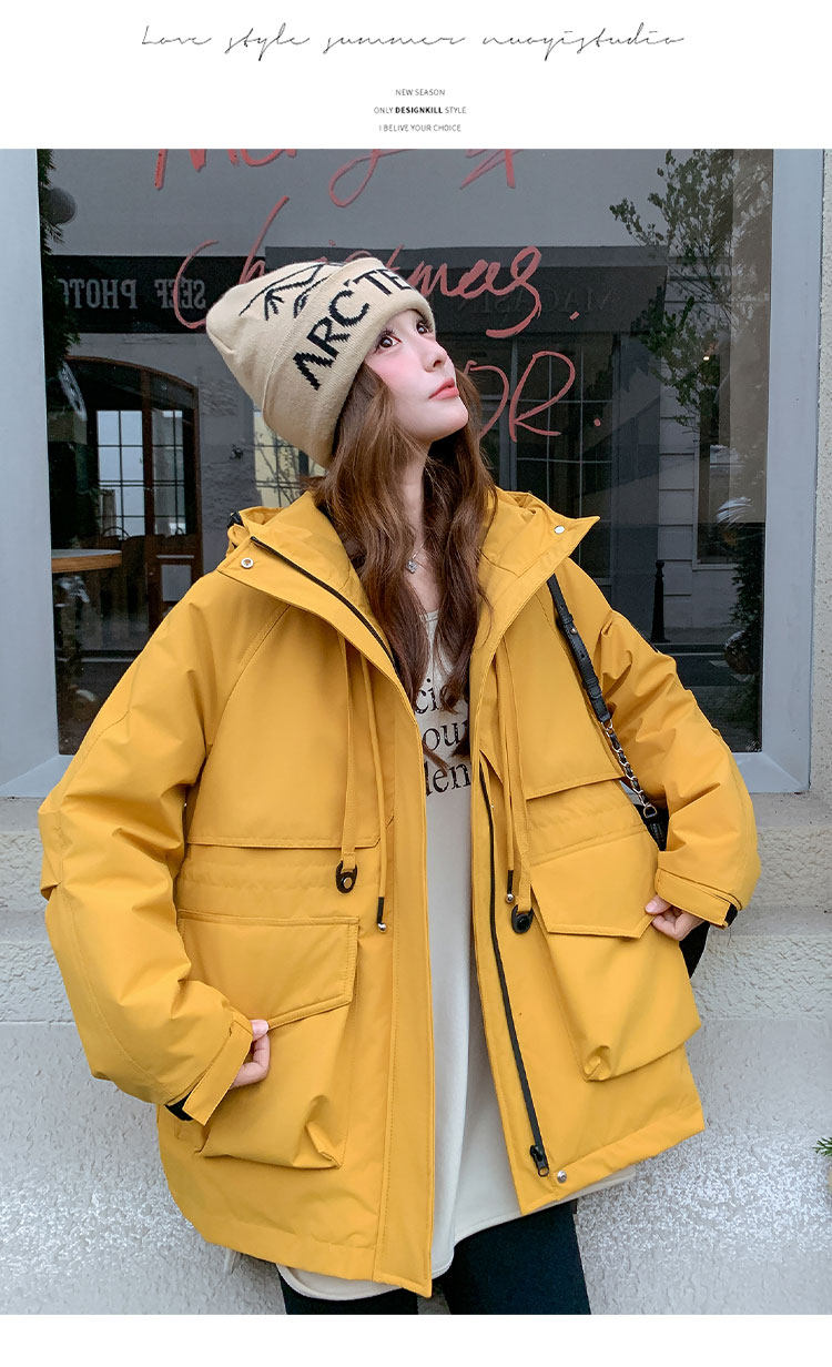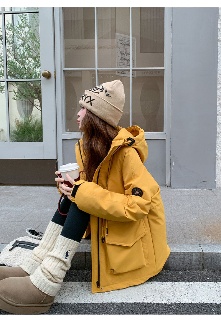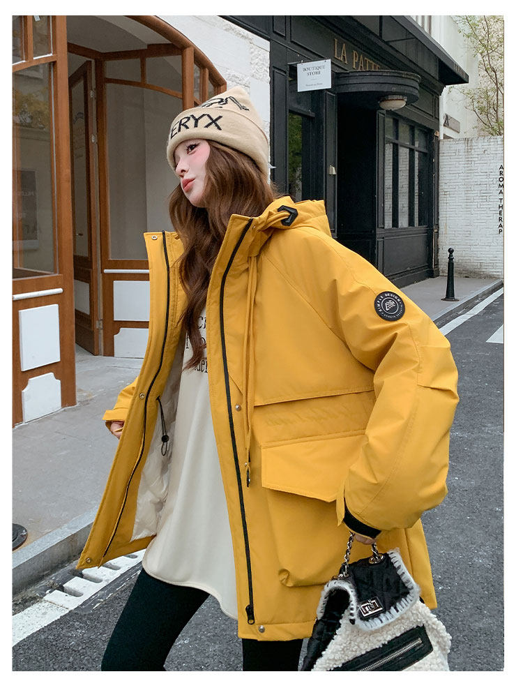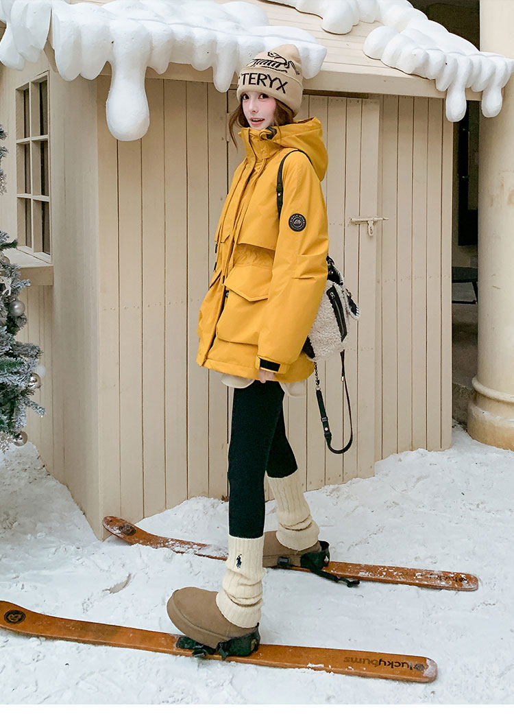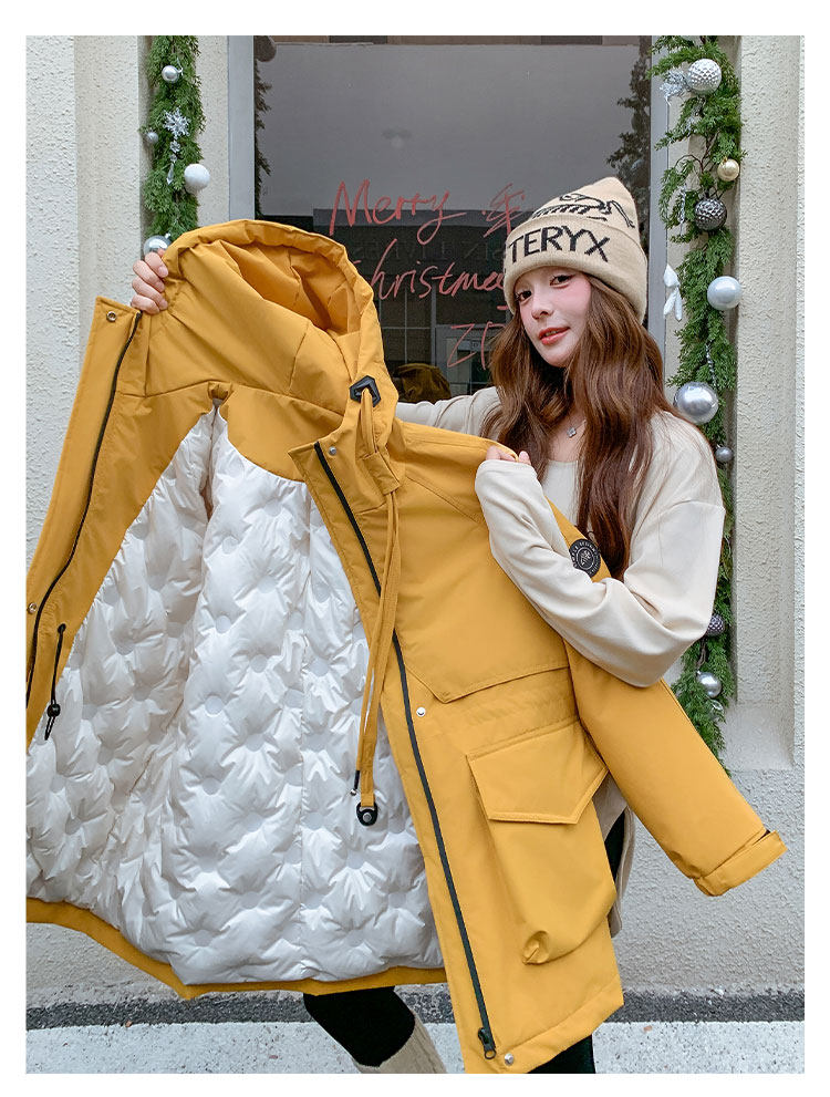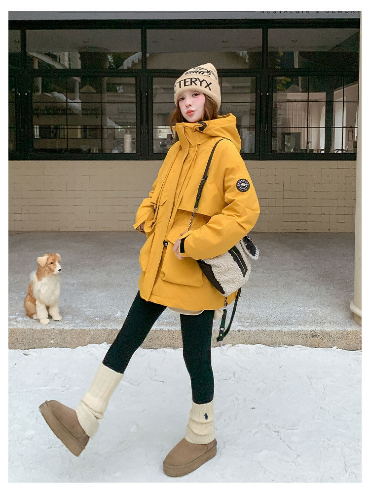 Yellow Workwear Style White Duck down Jacket for Women, Winter 2025 New Korean Design Hooded Warm Parka