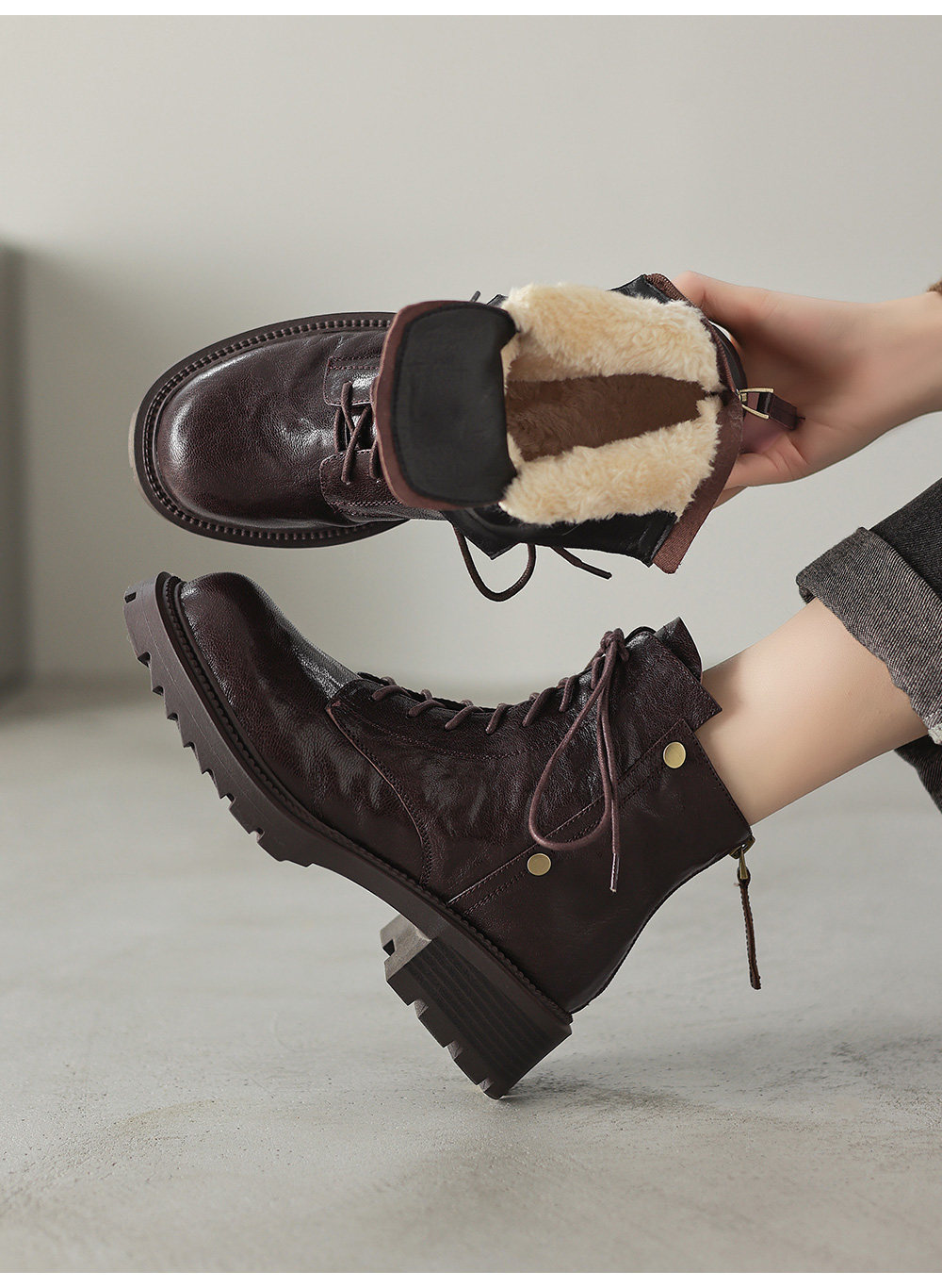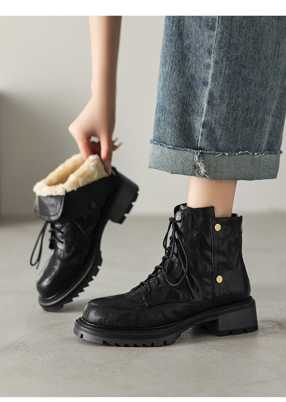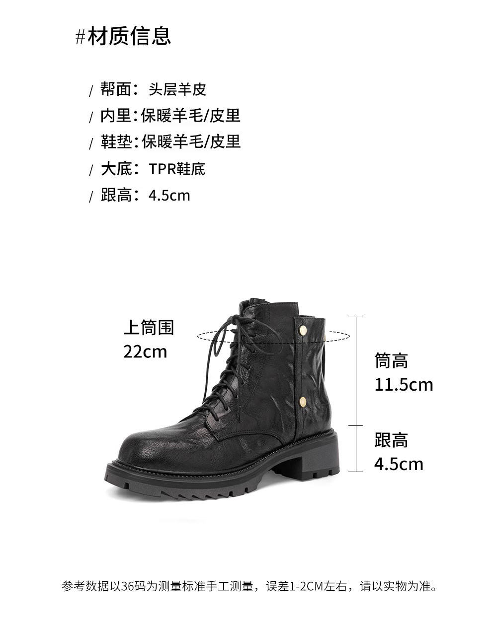 Senshi Hejiang sheepskin thick heel lace-up Martin boots women's thick velvet short boots winter mid-heeled wool snow boots large size